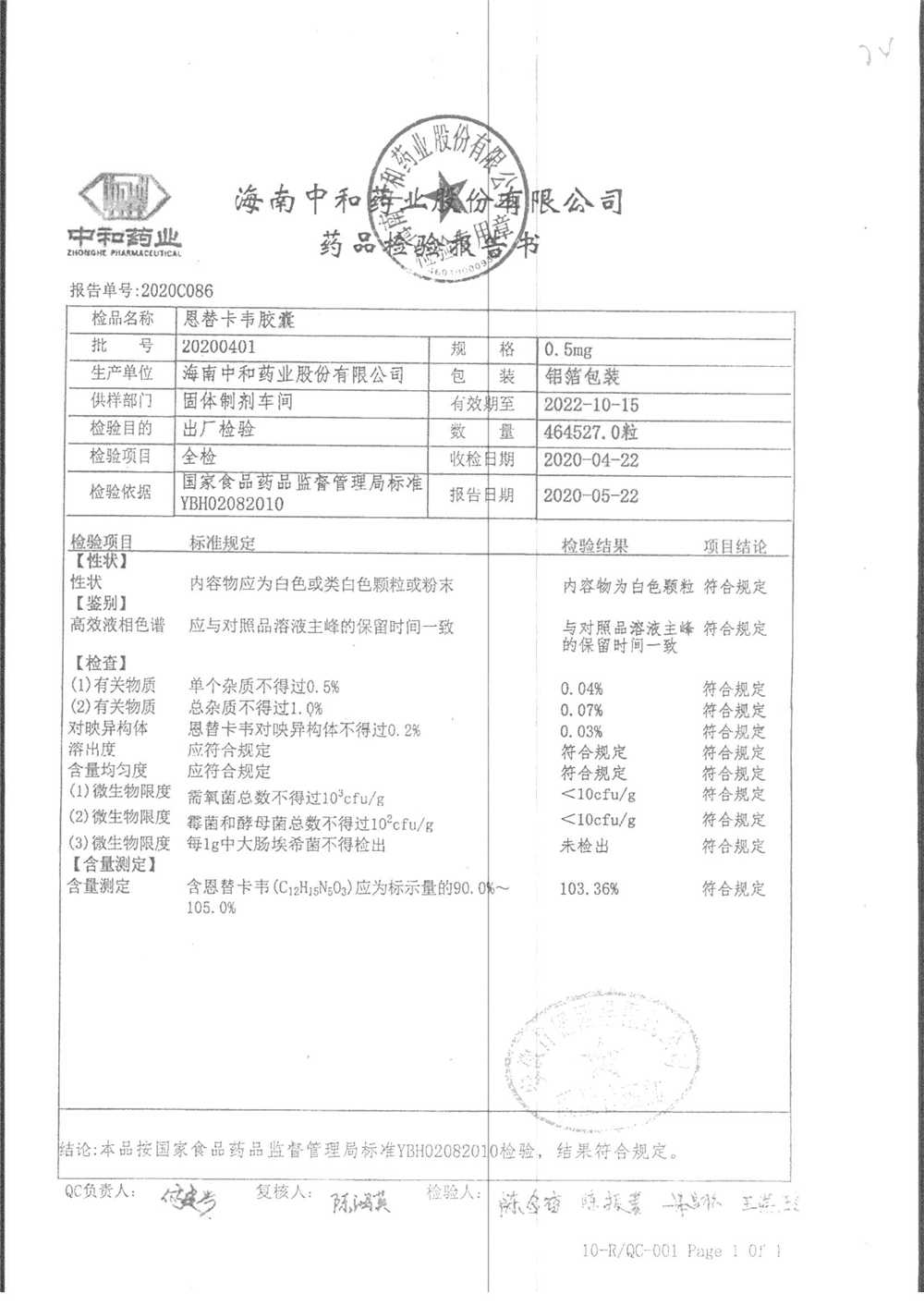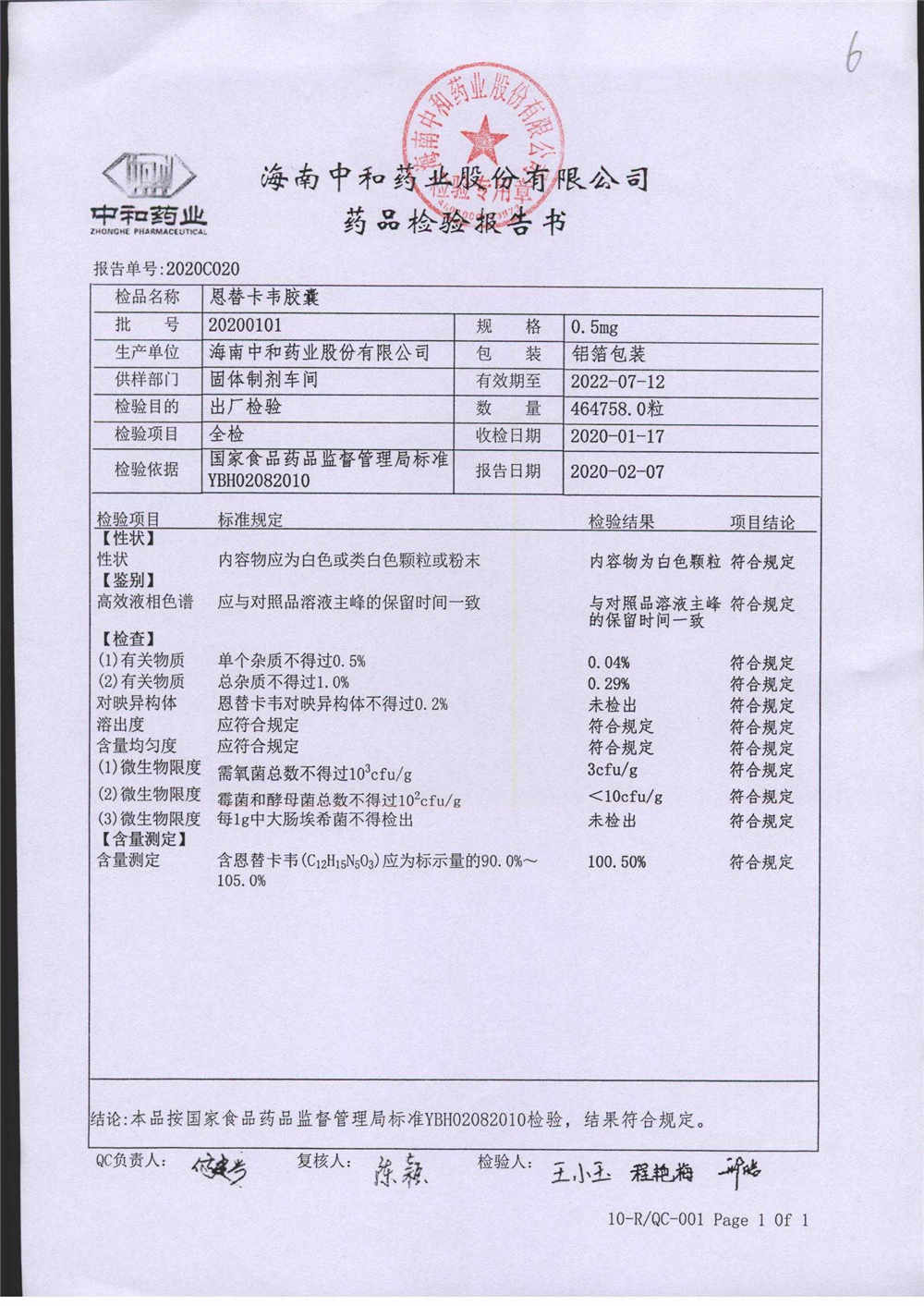 恩替卡韦胶囊 | 0.5mg | 20200401(2/3) | 查看详情 |