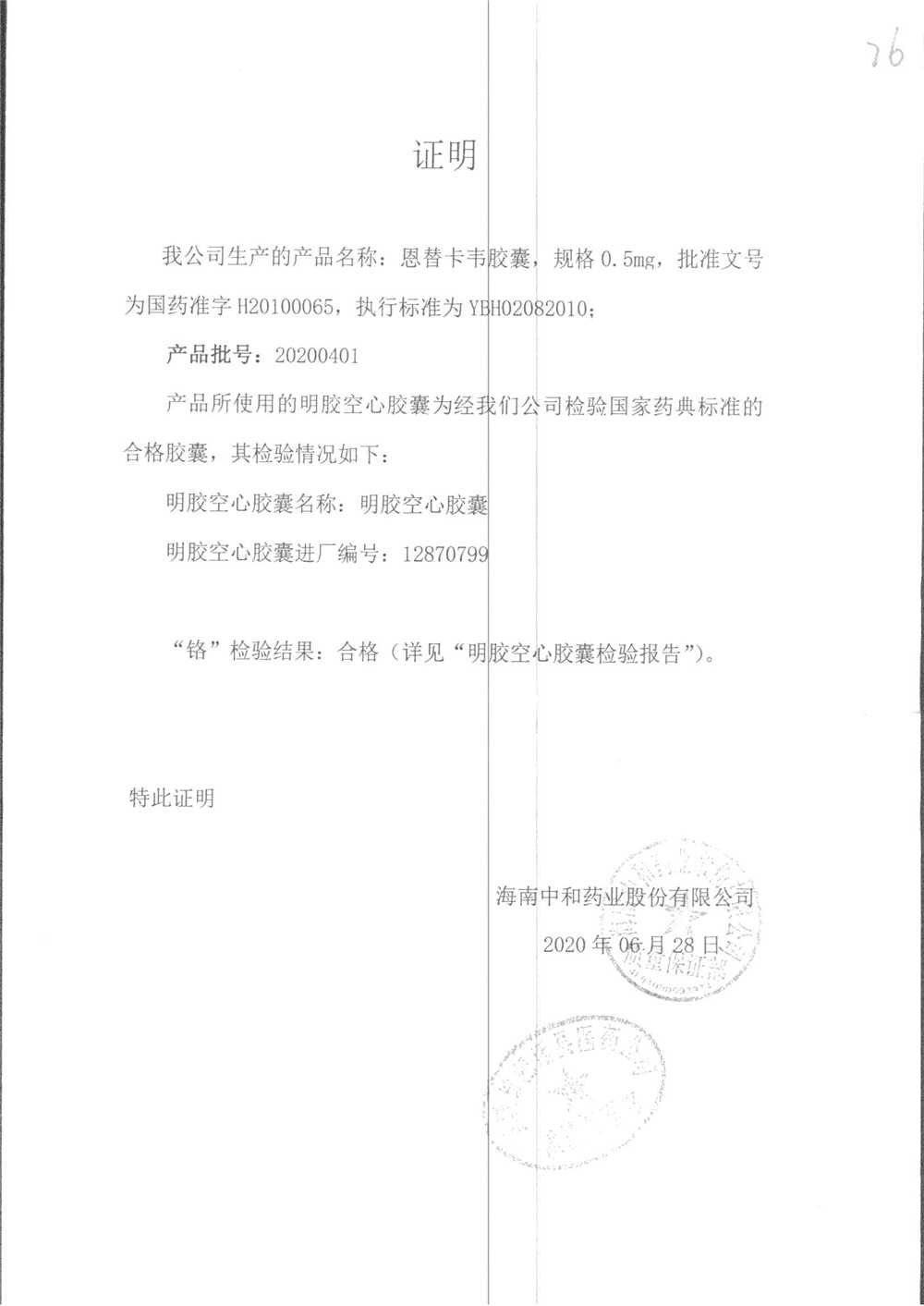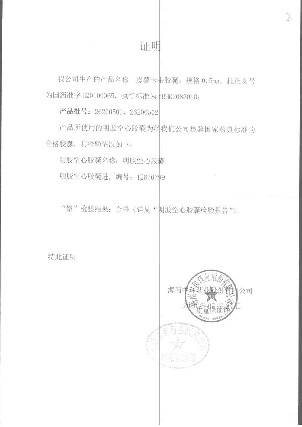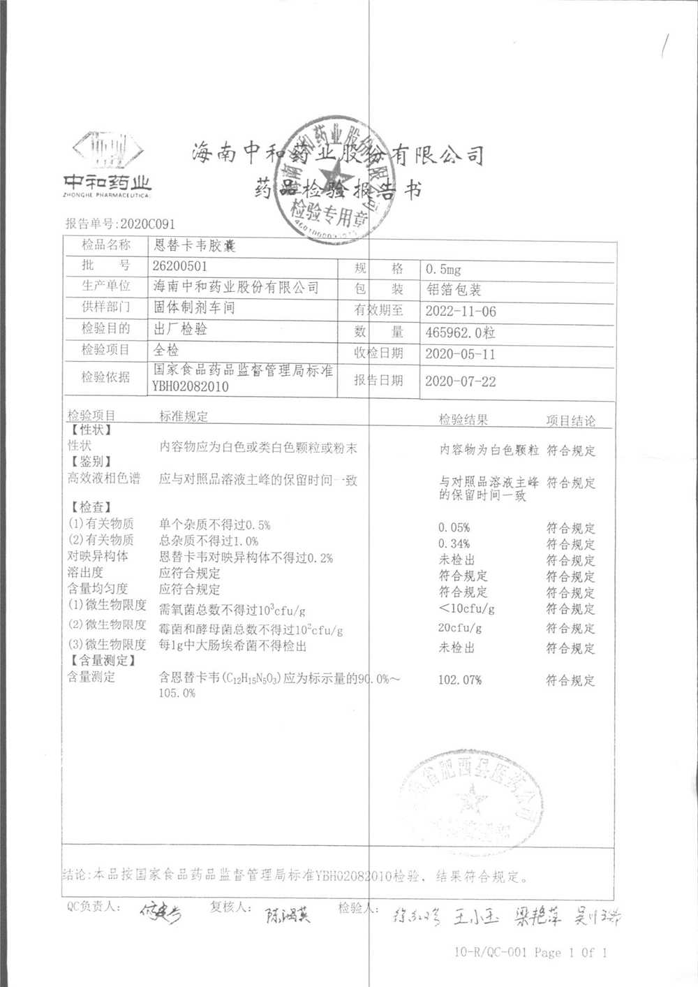 恩替卡韦胶囊 | 0.5mg | 26200501(2/3) | 查看详情 |
