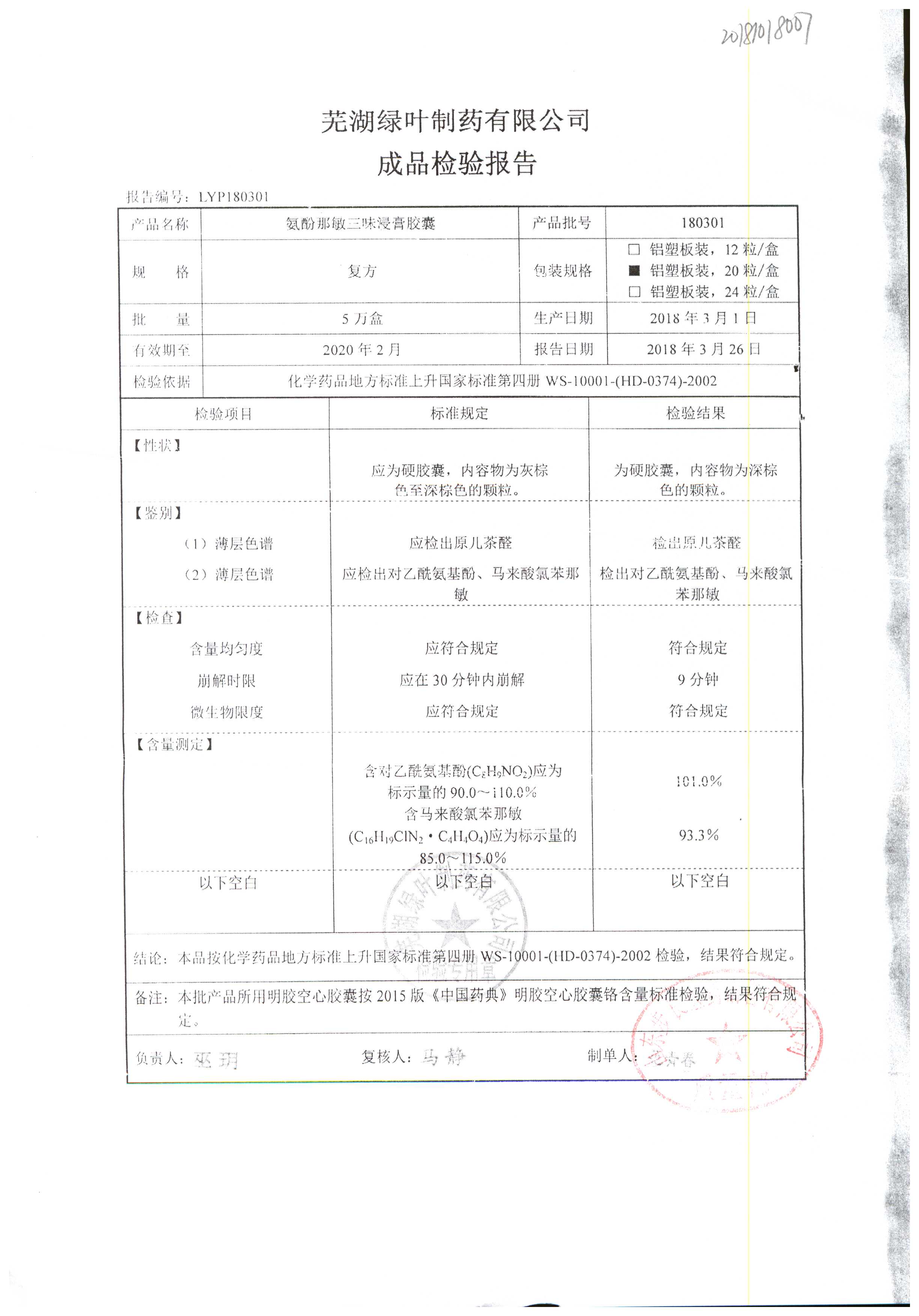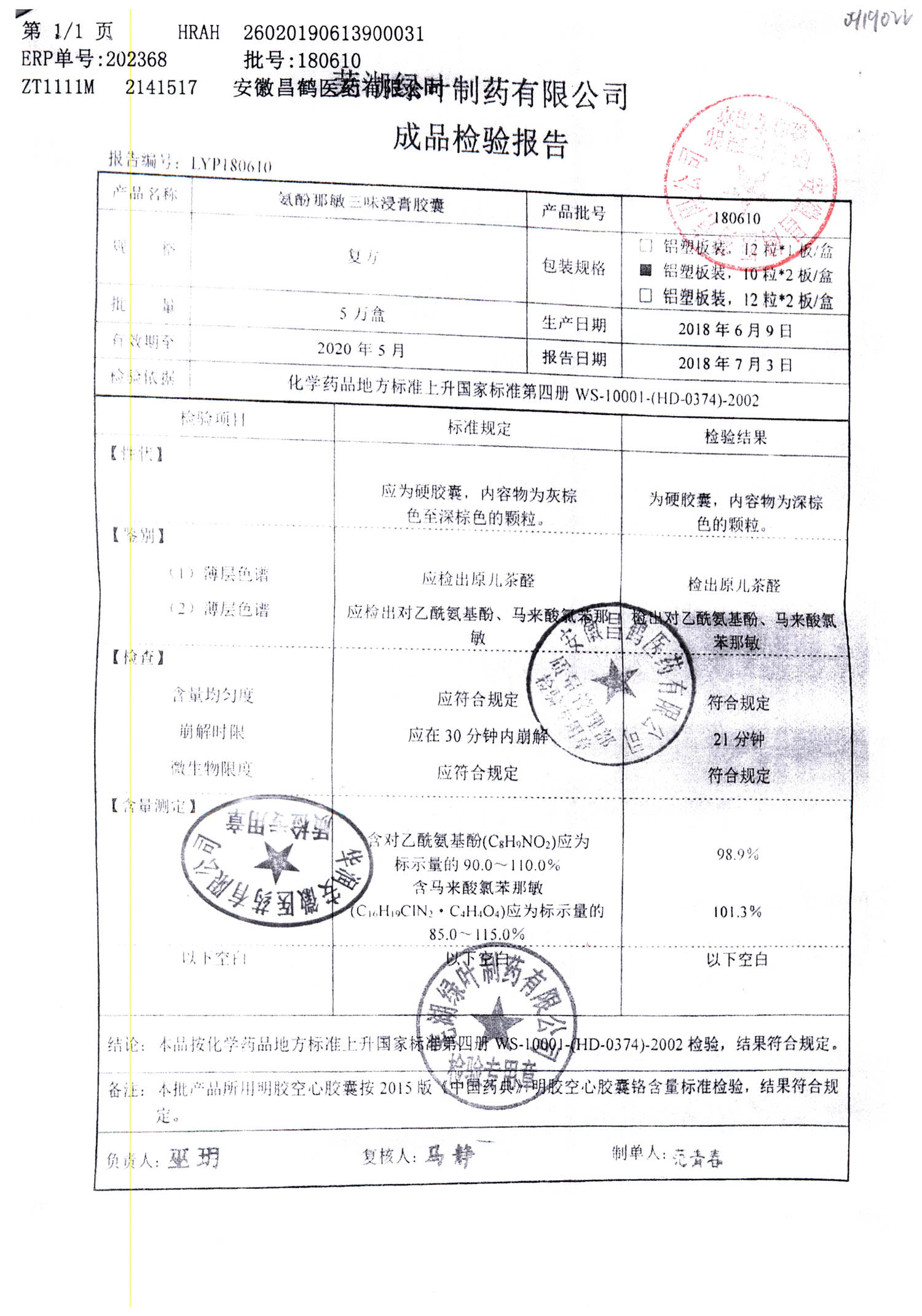 氨酚那敏三味浸膏胶囊 | 复方 | 180610 | 查看详情 |