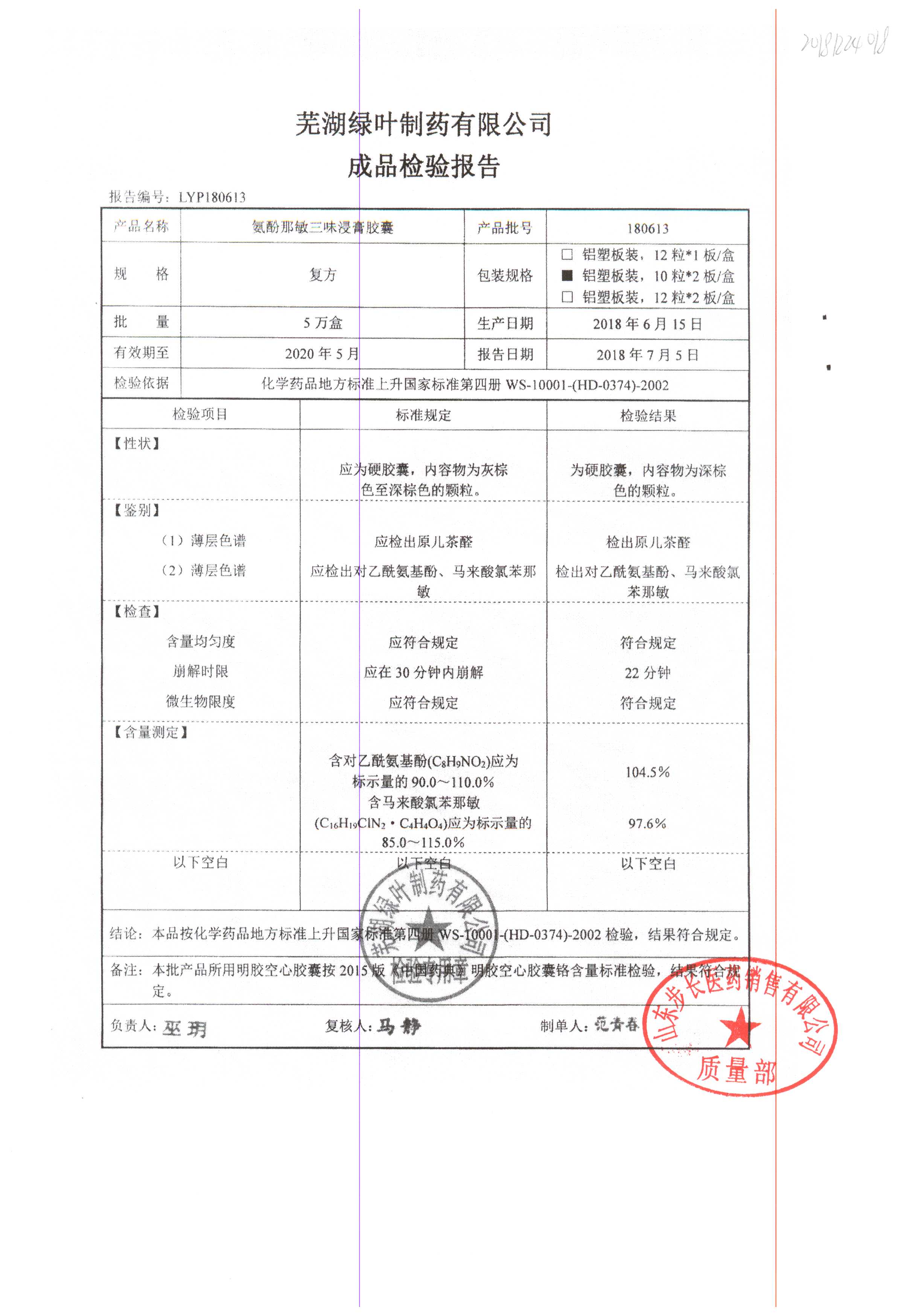 氨酚那敏三味浸膏胶囊 | 复方 | 180613 | 查看详情 |