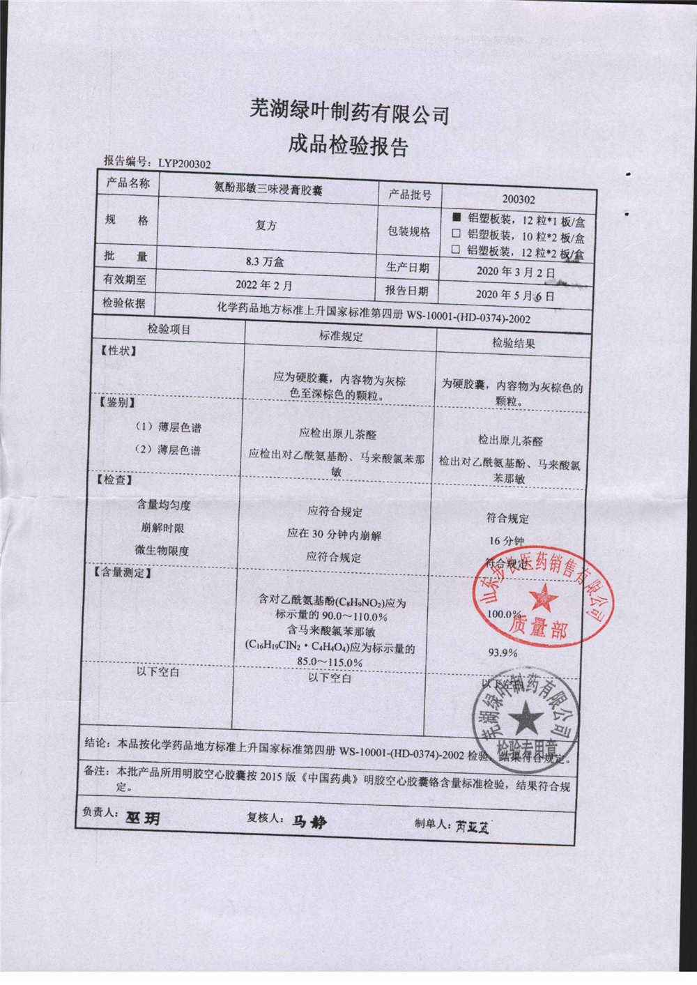 氨酚那敏三味浸膏胶囊 | 复方 | 200302 | 查看详情 |