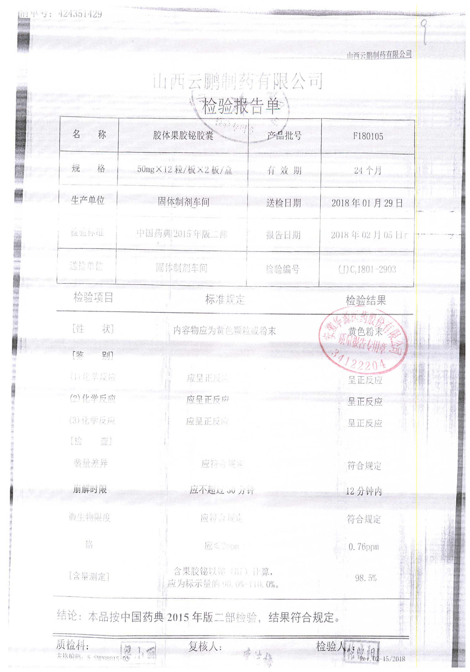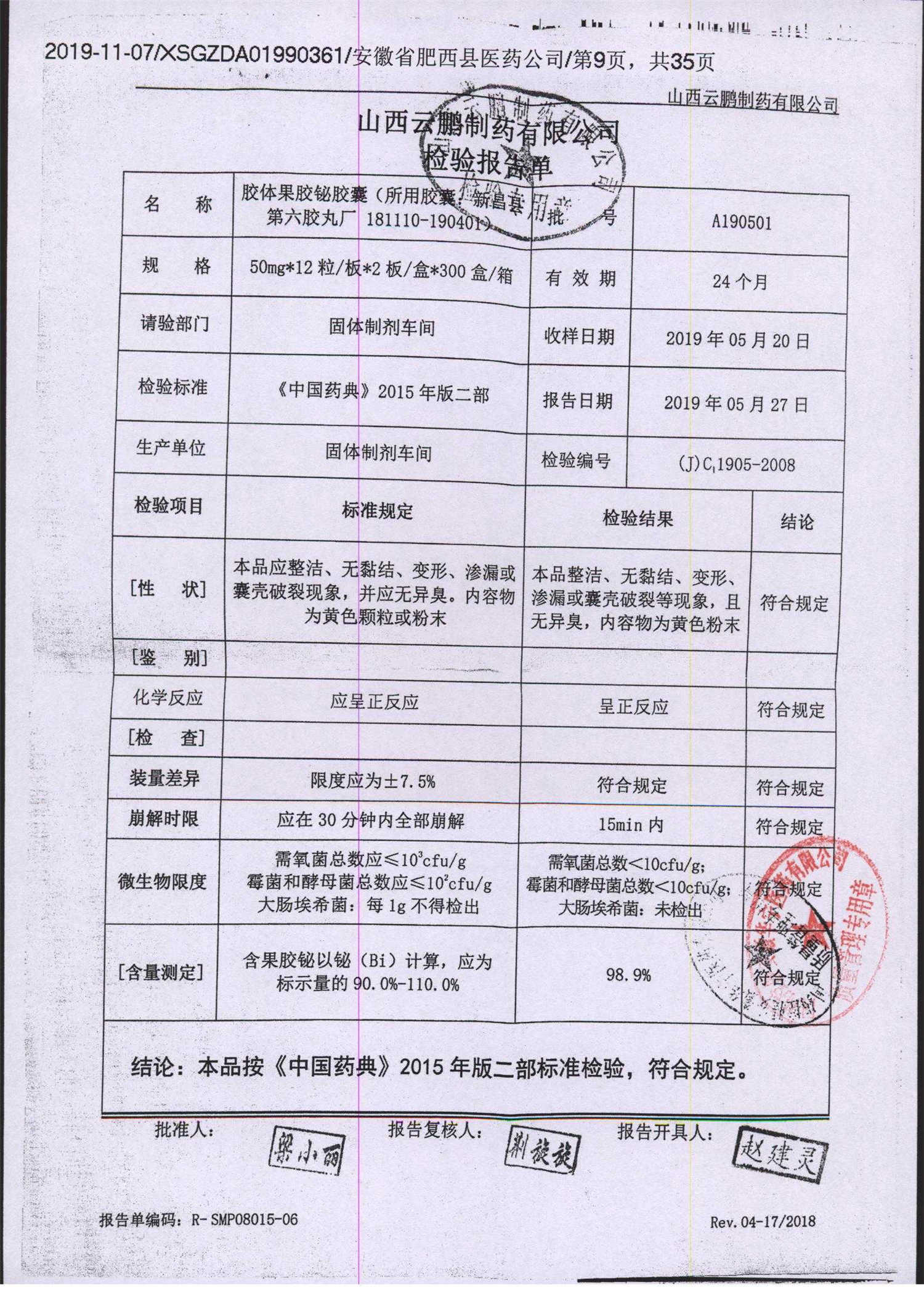 胶体果胶铋胶囊 | 50mg*24粒 | E190501(1/2) | 查看详情 |