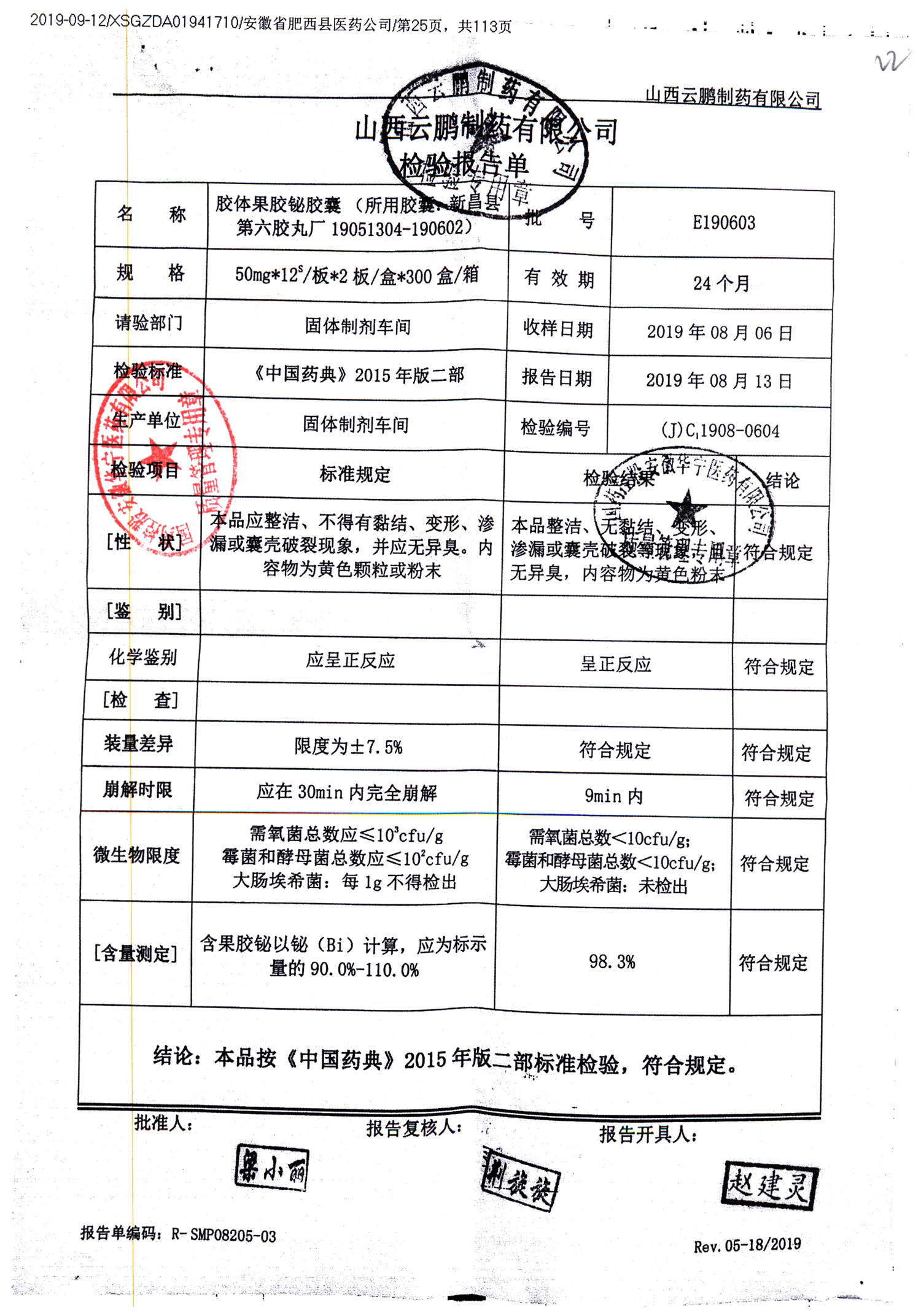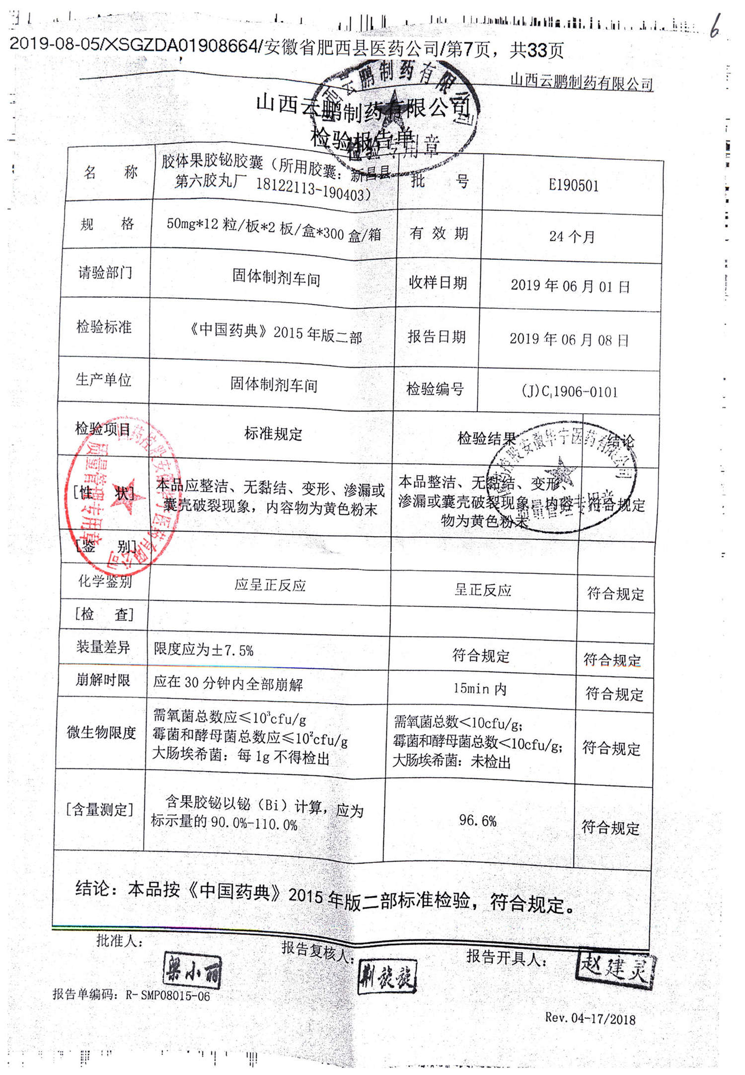 胶体果胶铋胶囊 | 50mg*24粒 | E190603(2/2) | 查看详情 |