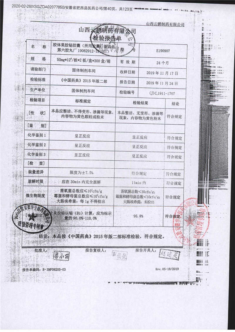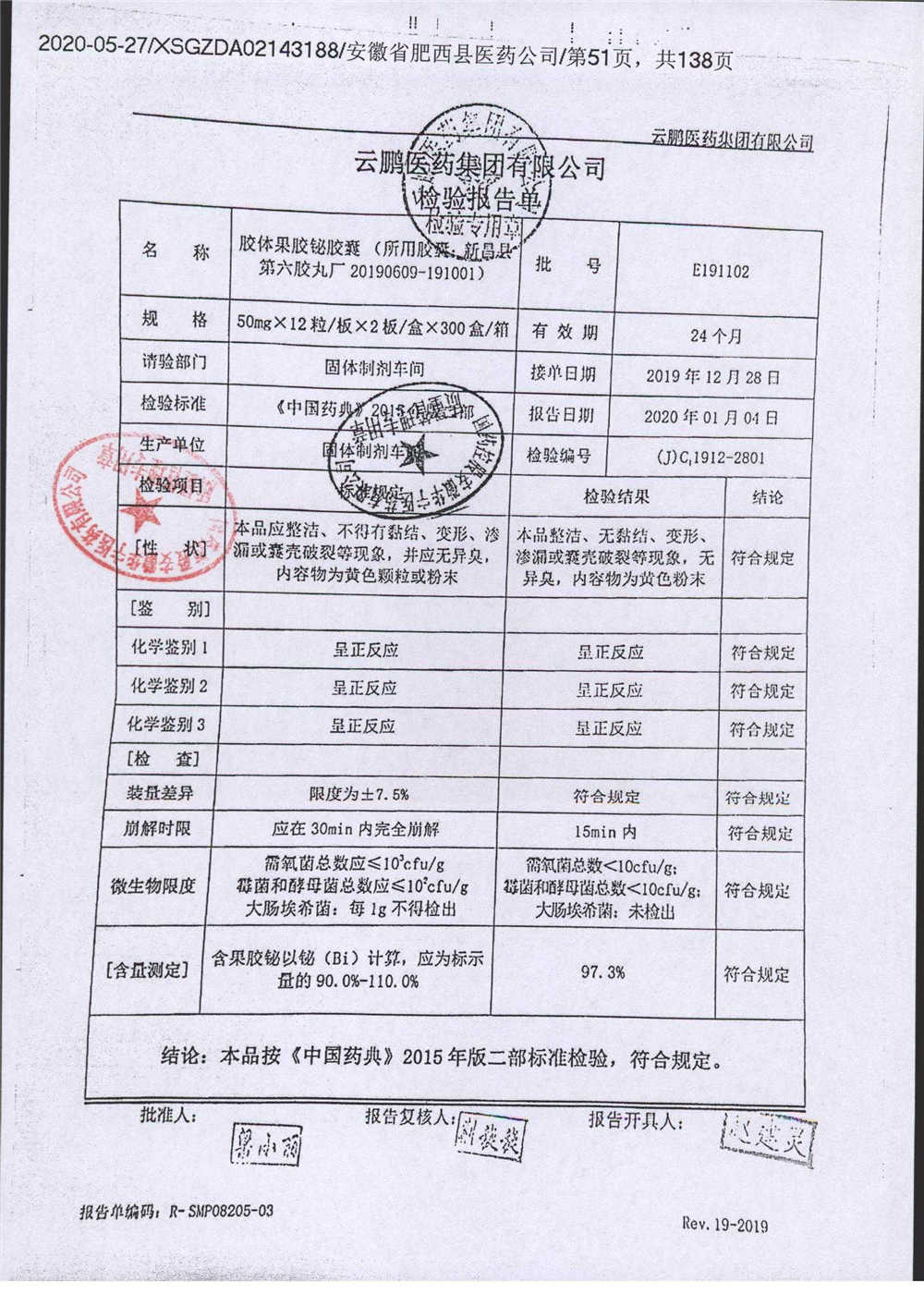 胶体果胶铋胶囊 | 50mg*24粒 | E190501(2/2) | 查看详情 |