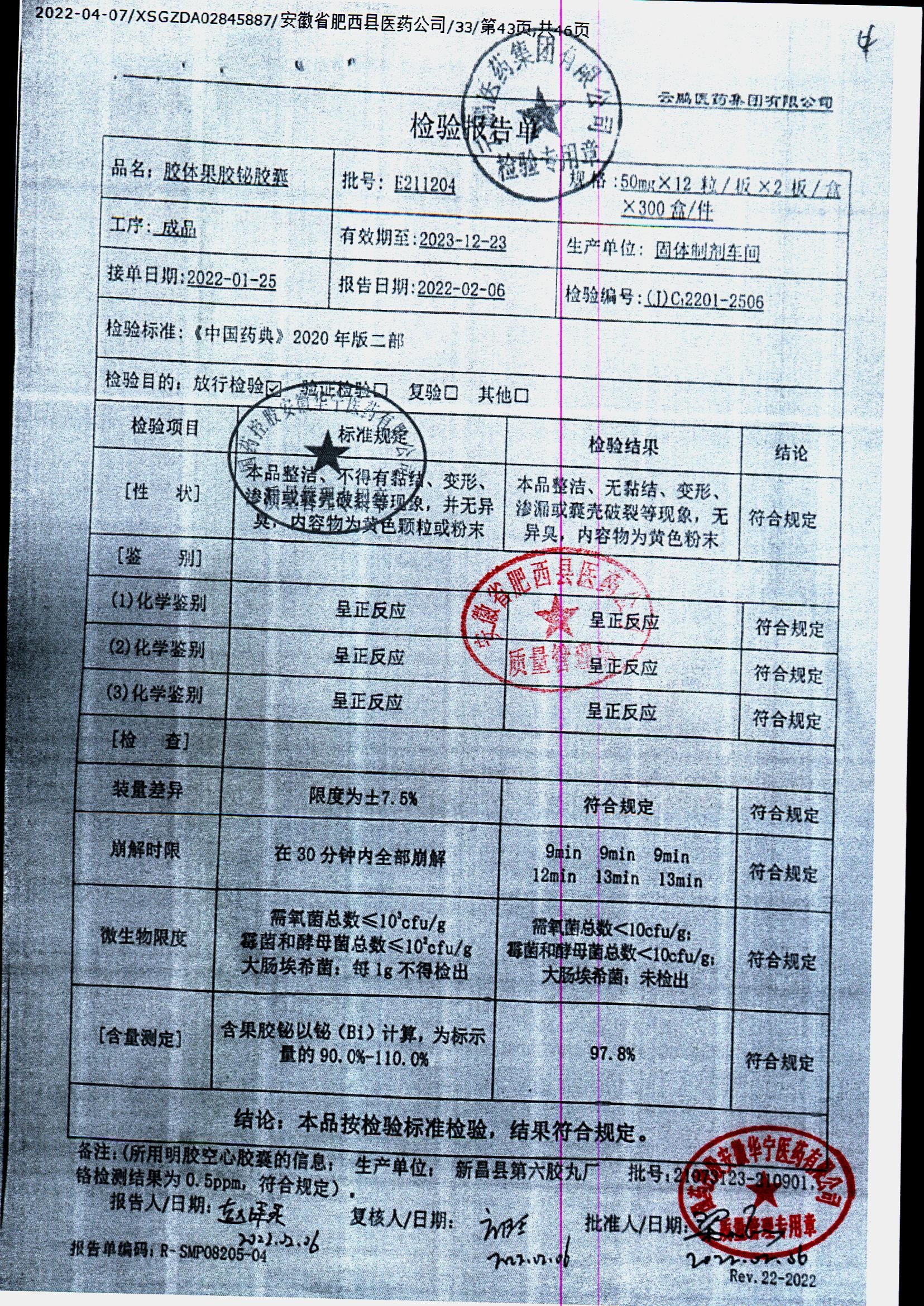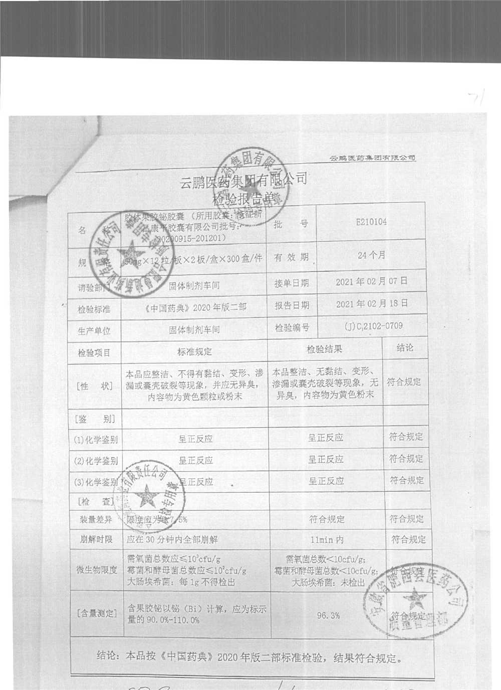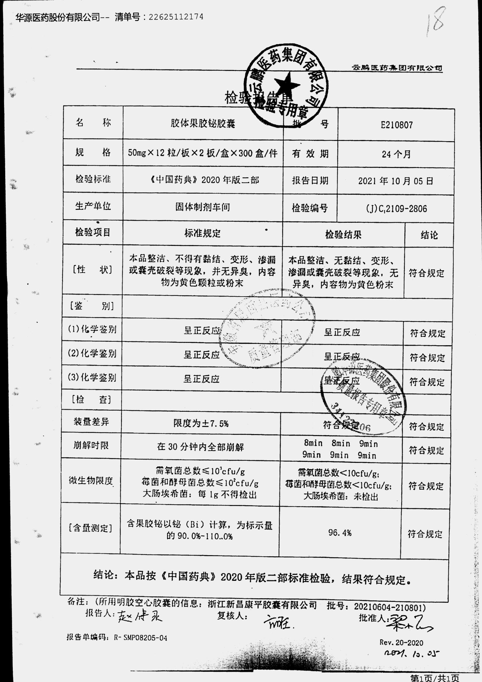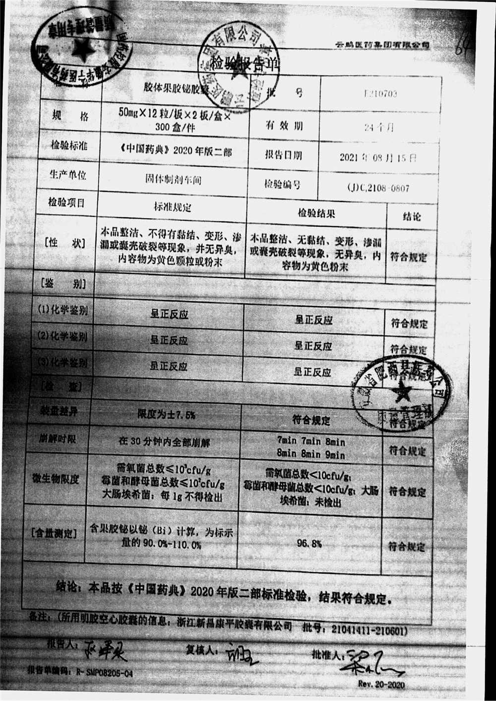 胶体果胶铋胶囊 | 50mg*24粒 | E210703(2/2) | 查看详情 |