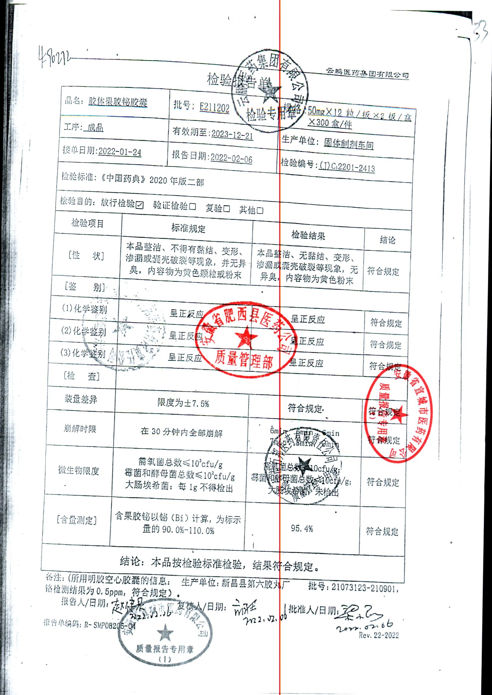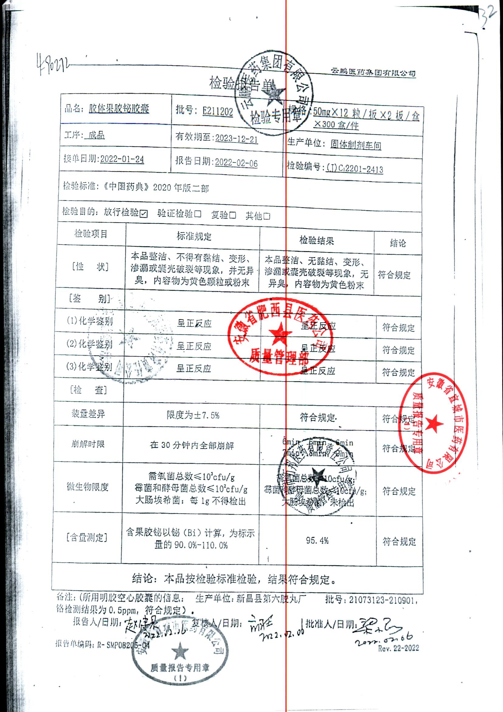 胶体果胶铋胶囊 | 50mg*24粒 | E211202/2 | 查看详情 |