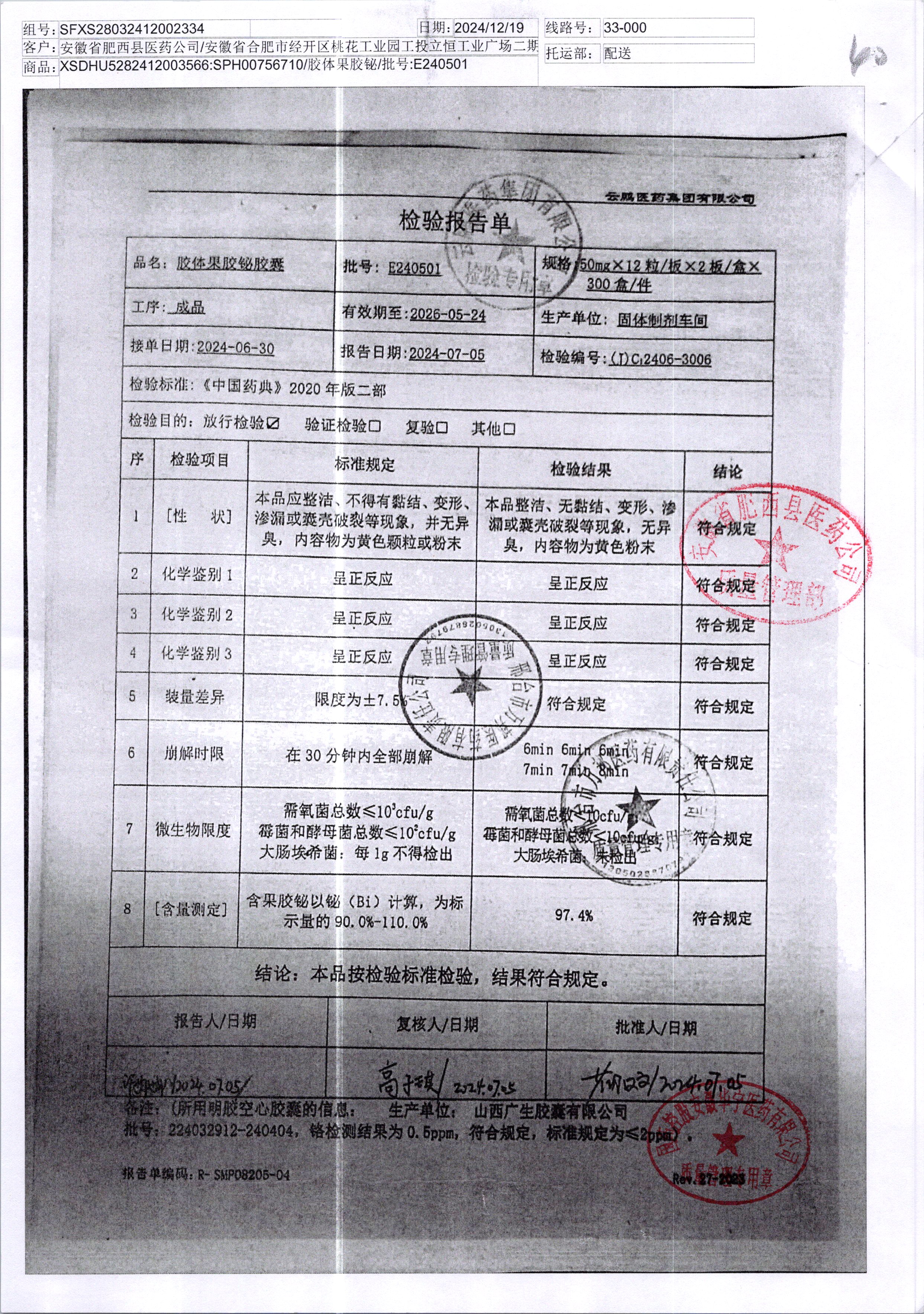 胶体果胶铋胶囊 | 50mg*24粒 | E240501 | 查看详情 |