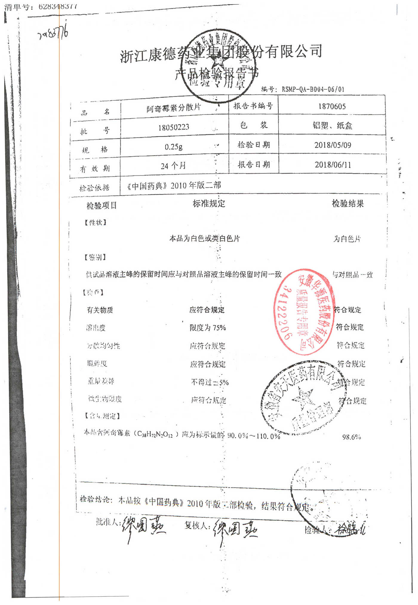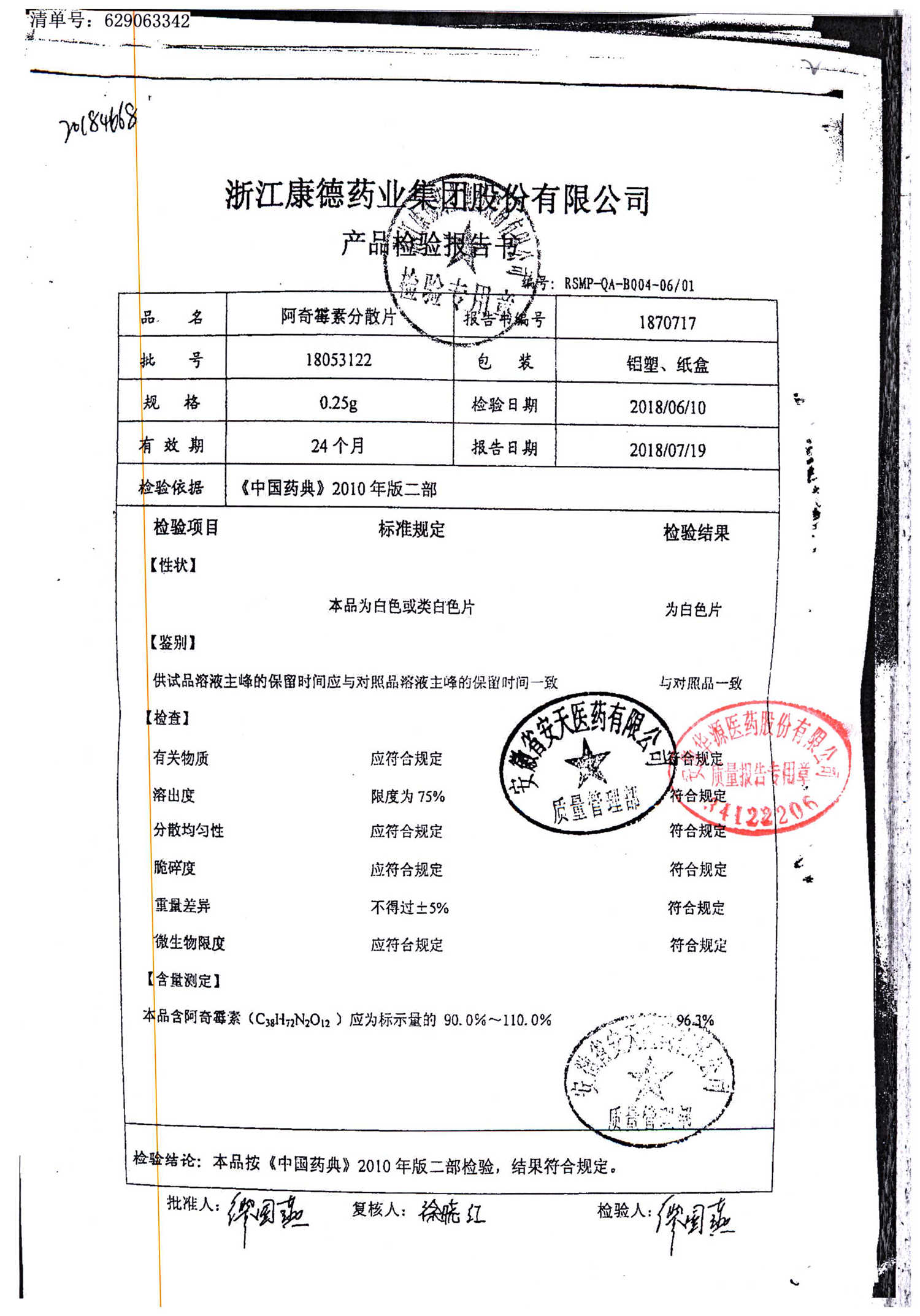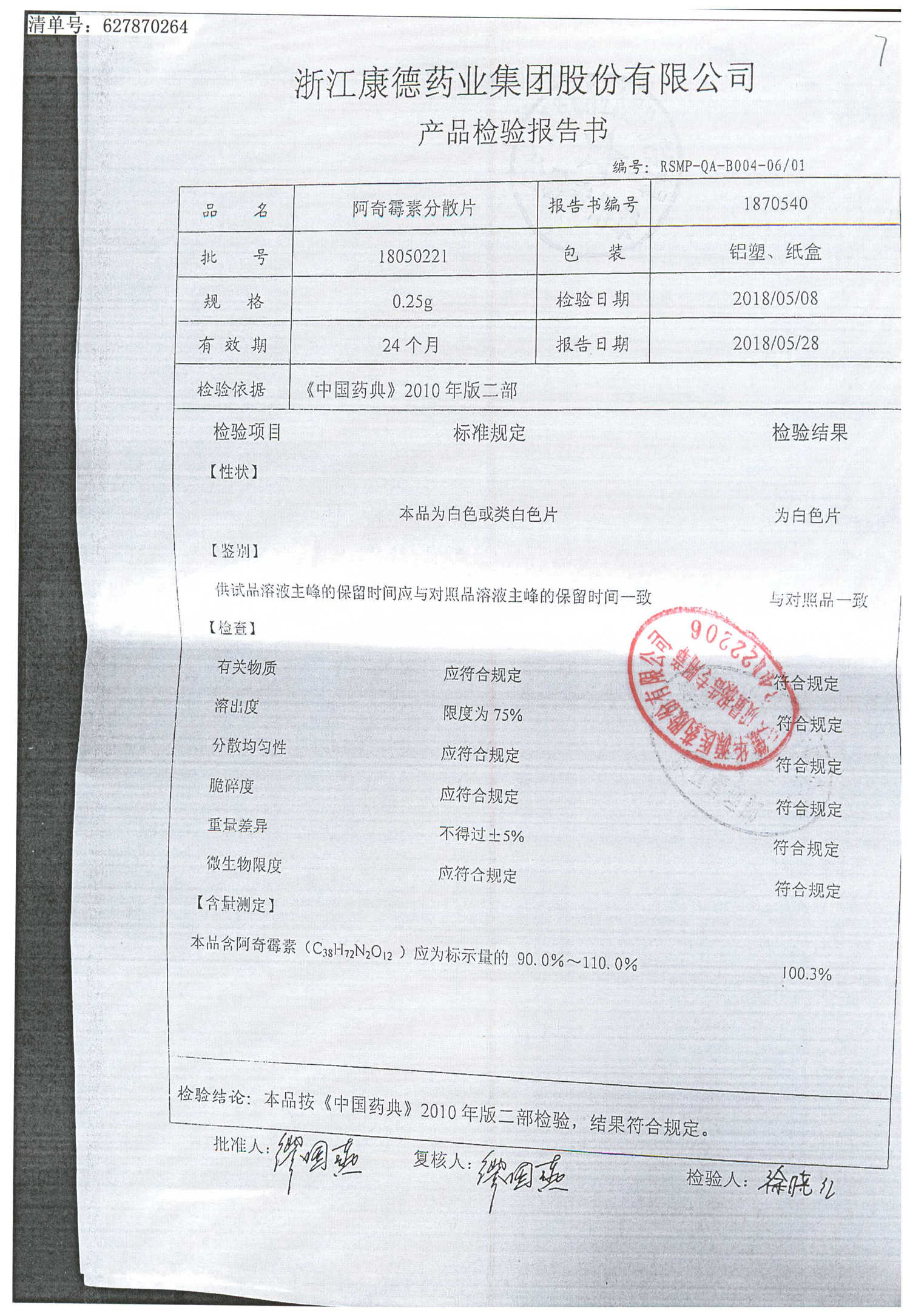 阿奇霉素分散片 | 0.25g | 18050223 | 查看详情 |