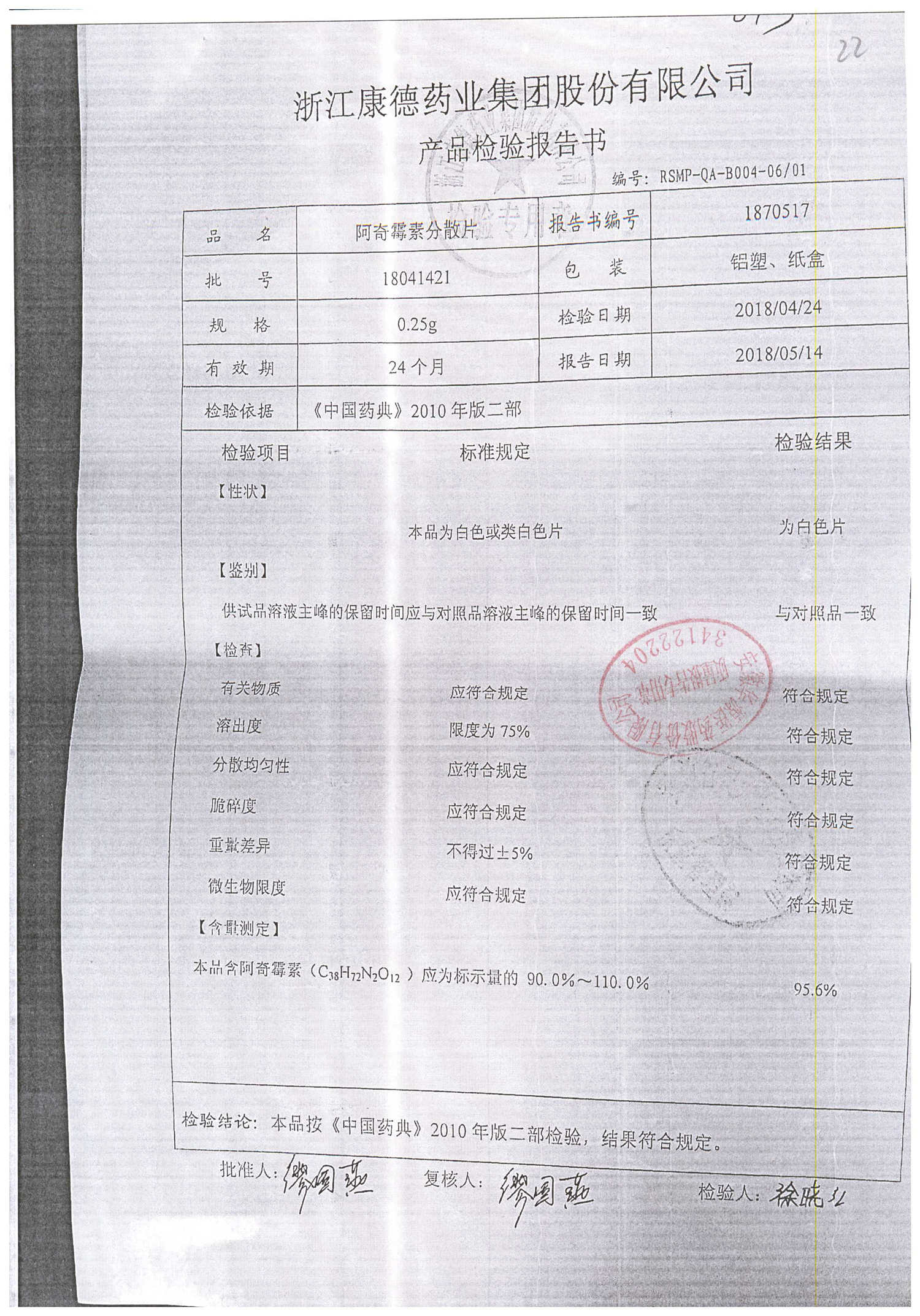 阿奇霉素分散片 | 0.25g | 18050221 | 查看详情 |