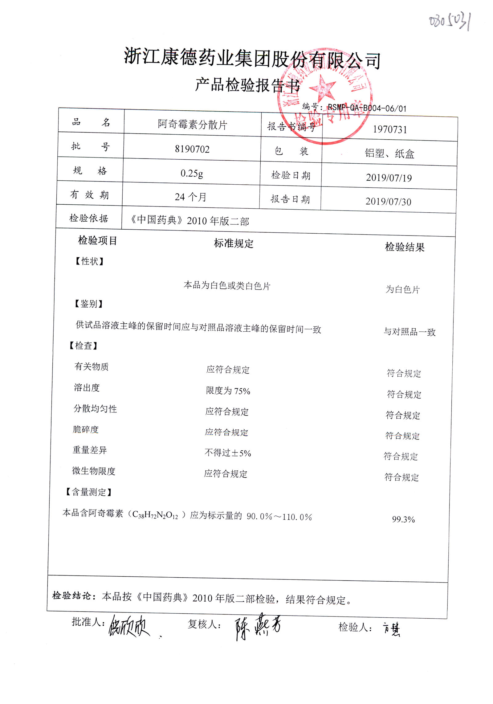 阿奇霉素分散片 | 0.25g | 8190702 | 查看详情 |