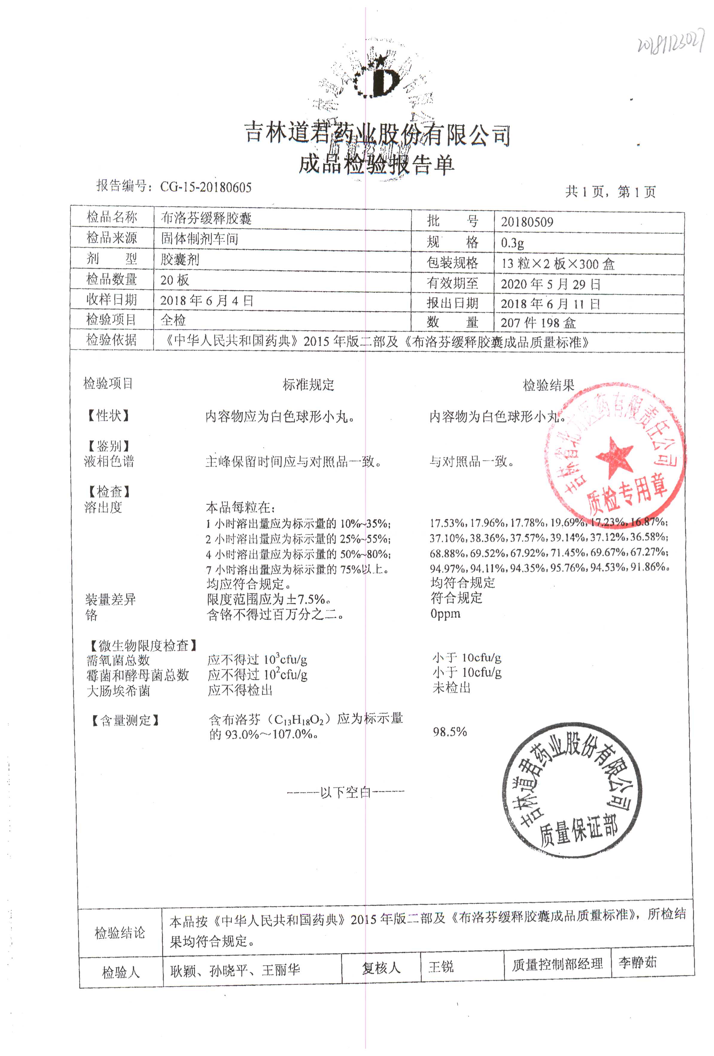 布洛芬缓释胶囊 | 0.3g*26粒 | 20180509 | 查看详情 |