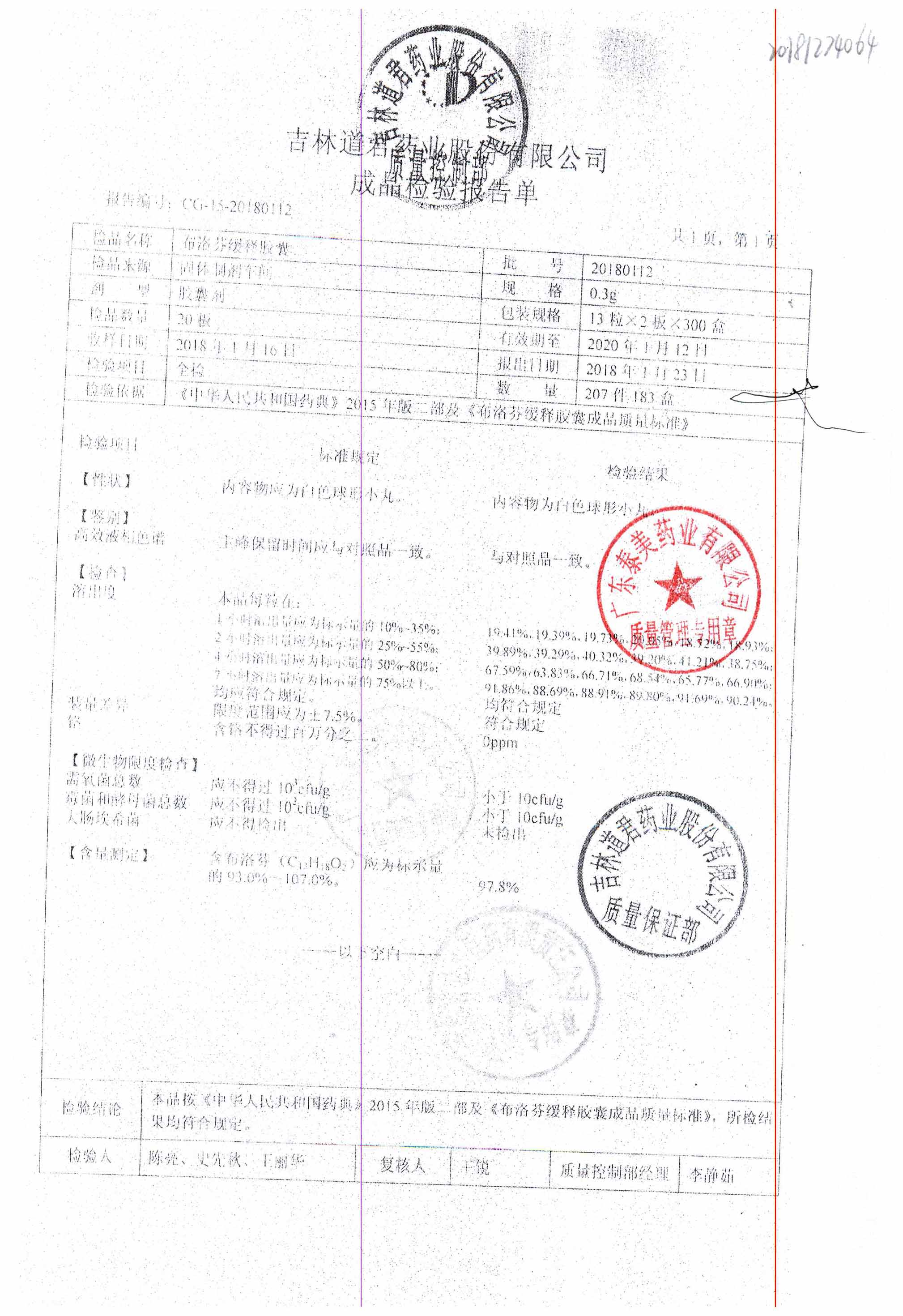 布洛芬缓释胶囊 | 0.3g*26粒 | 20180112 | 查看详情 |
