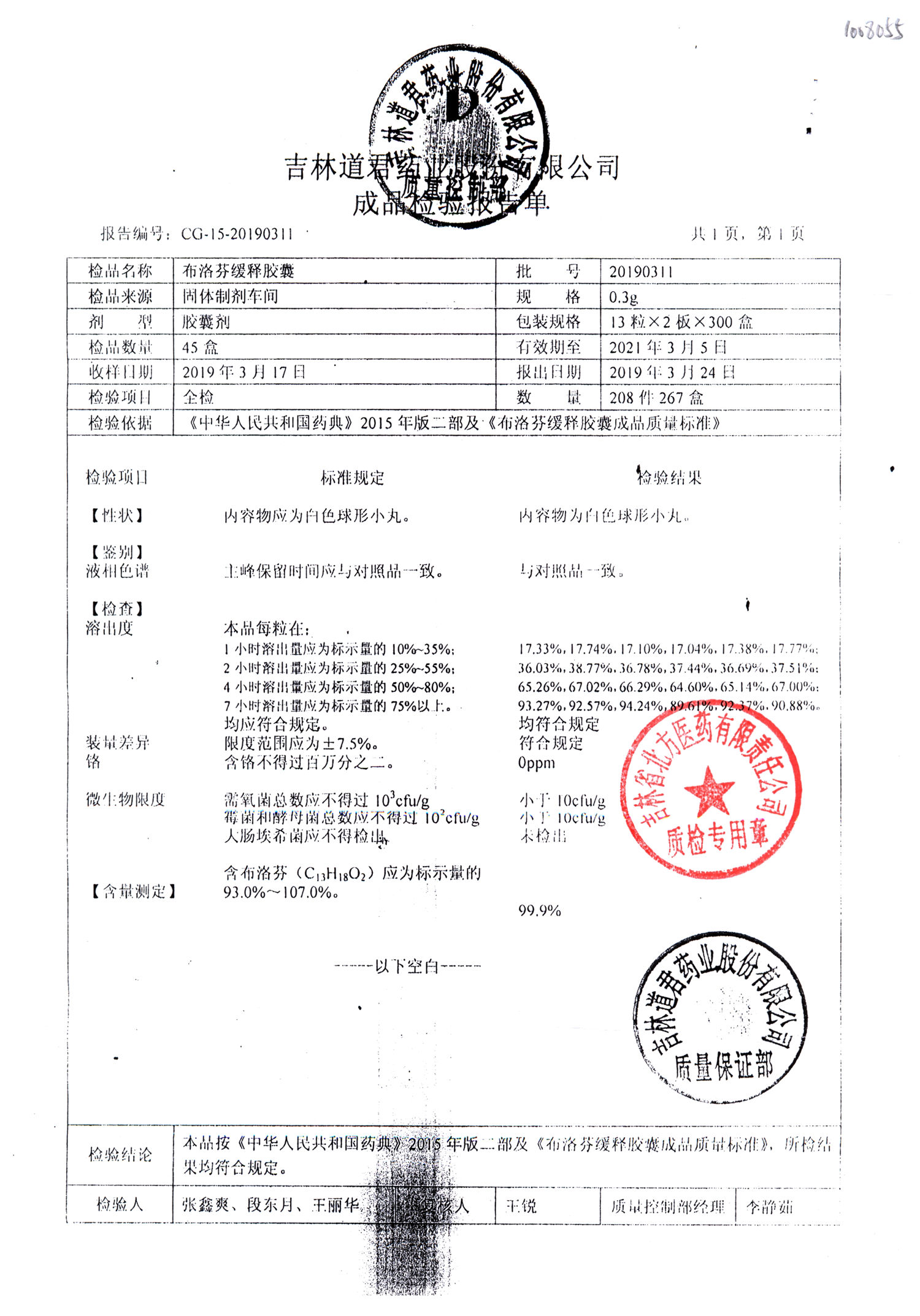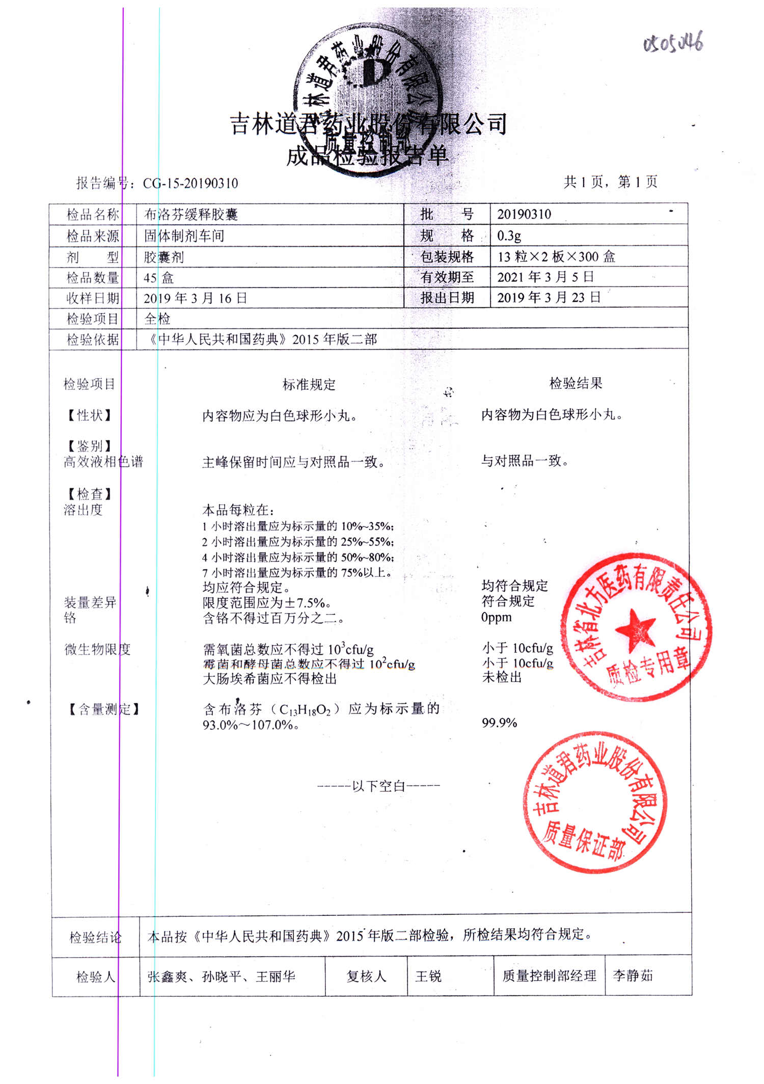 布洛芬缓释胶囊 | 0.3g*26粒 | 20190311 | 查看详情 |