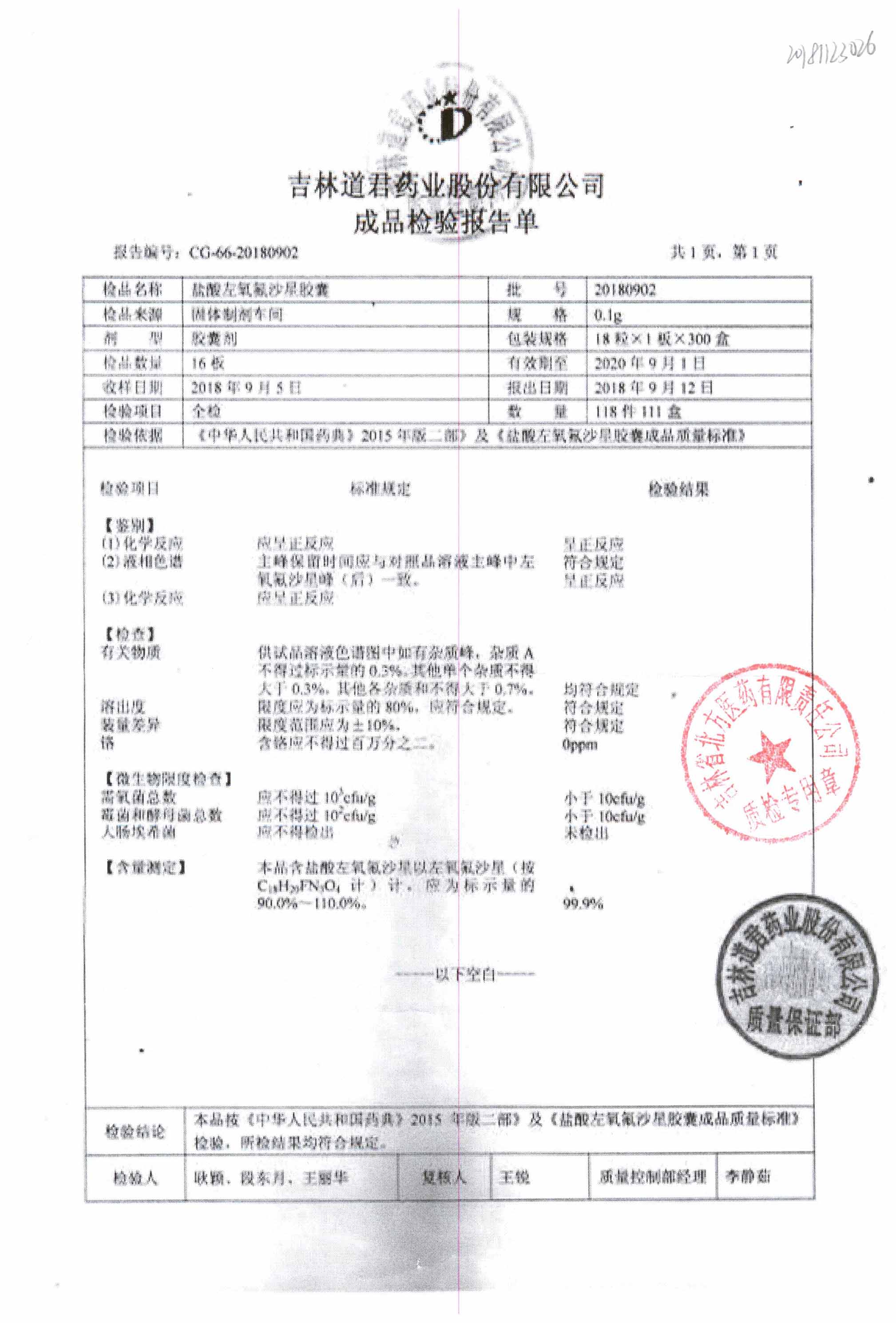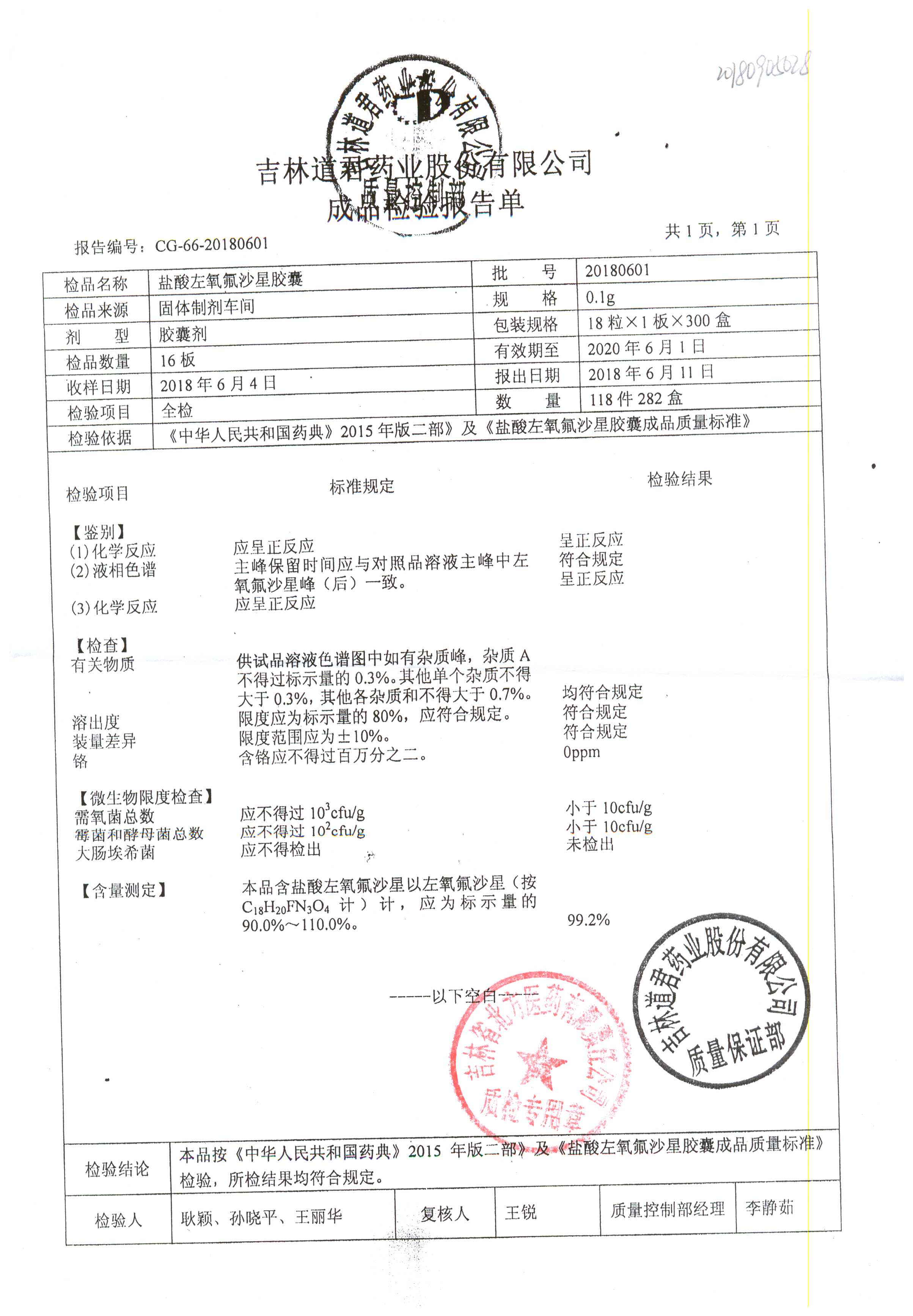 盐酸左氧氟沙星胶囊 | 0.1g*18粒 | 20180902 | 查看详情 |