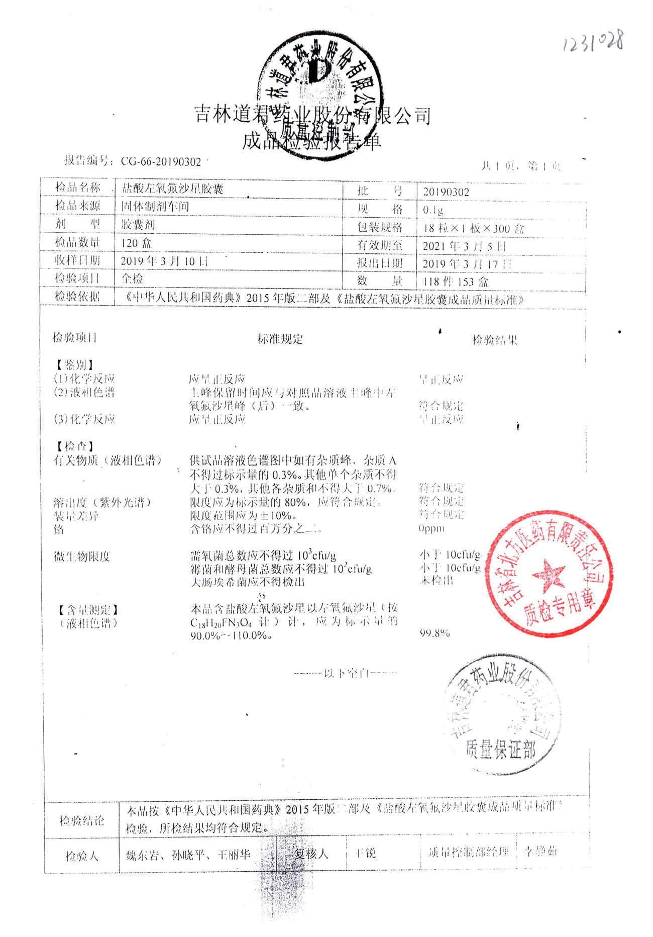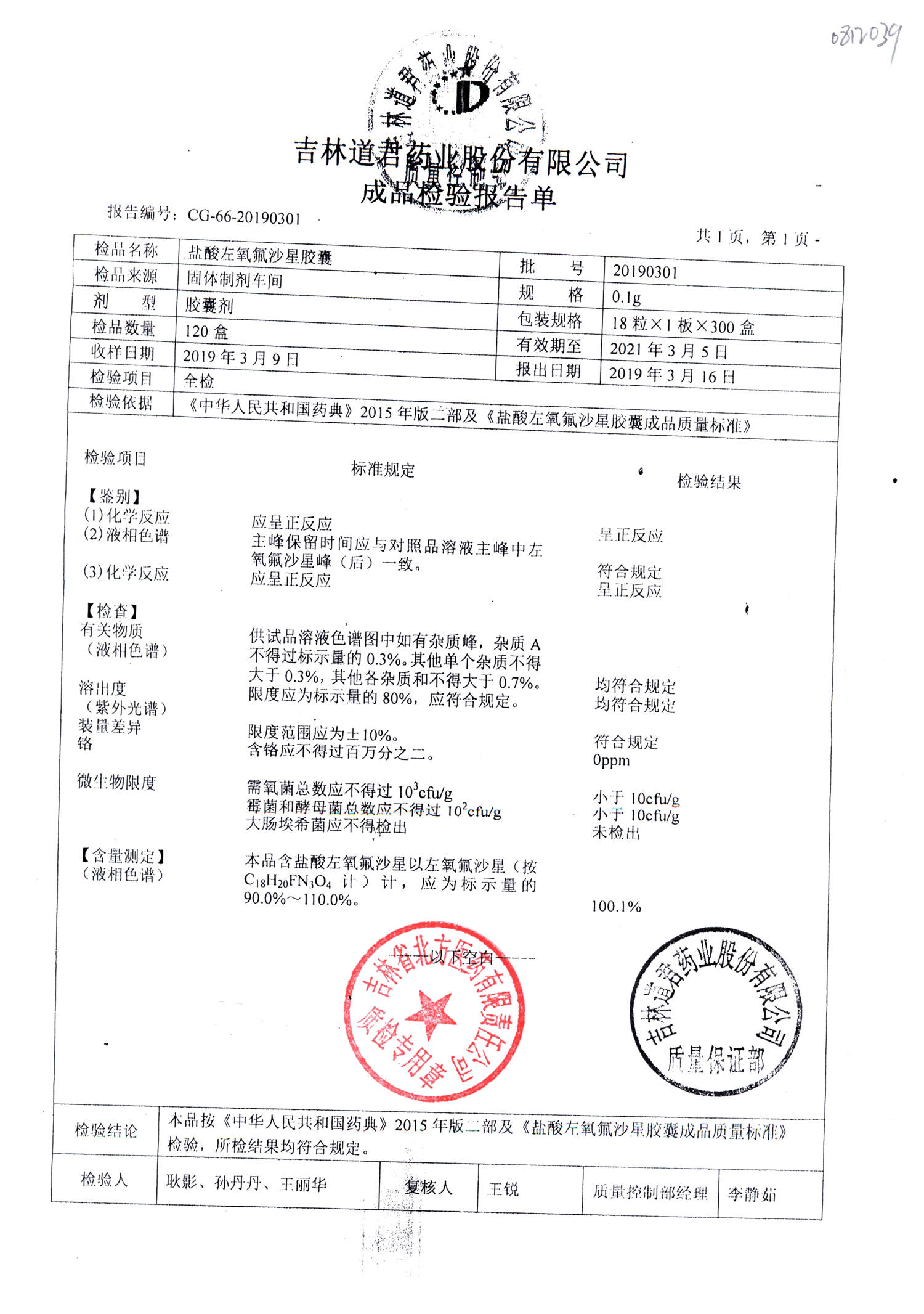 盐酸左氧氟沙星胶囊 | 0.1g*18粒 | 20190302 | 查看详情 |