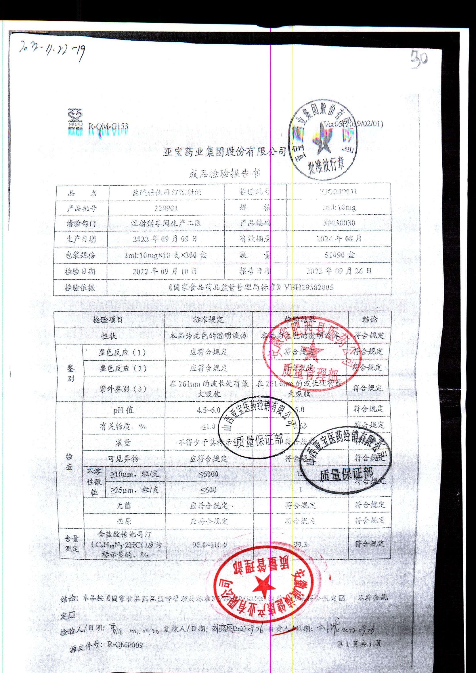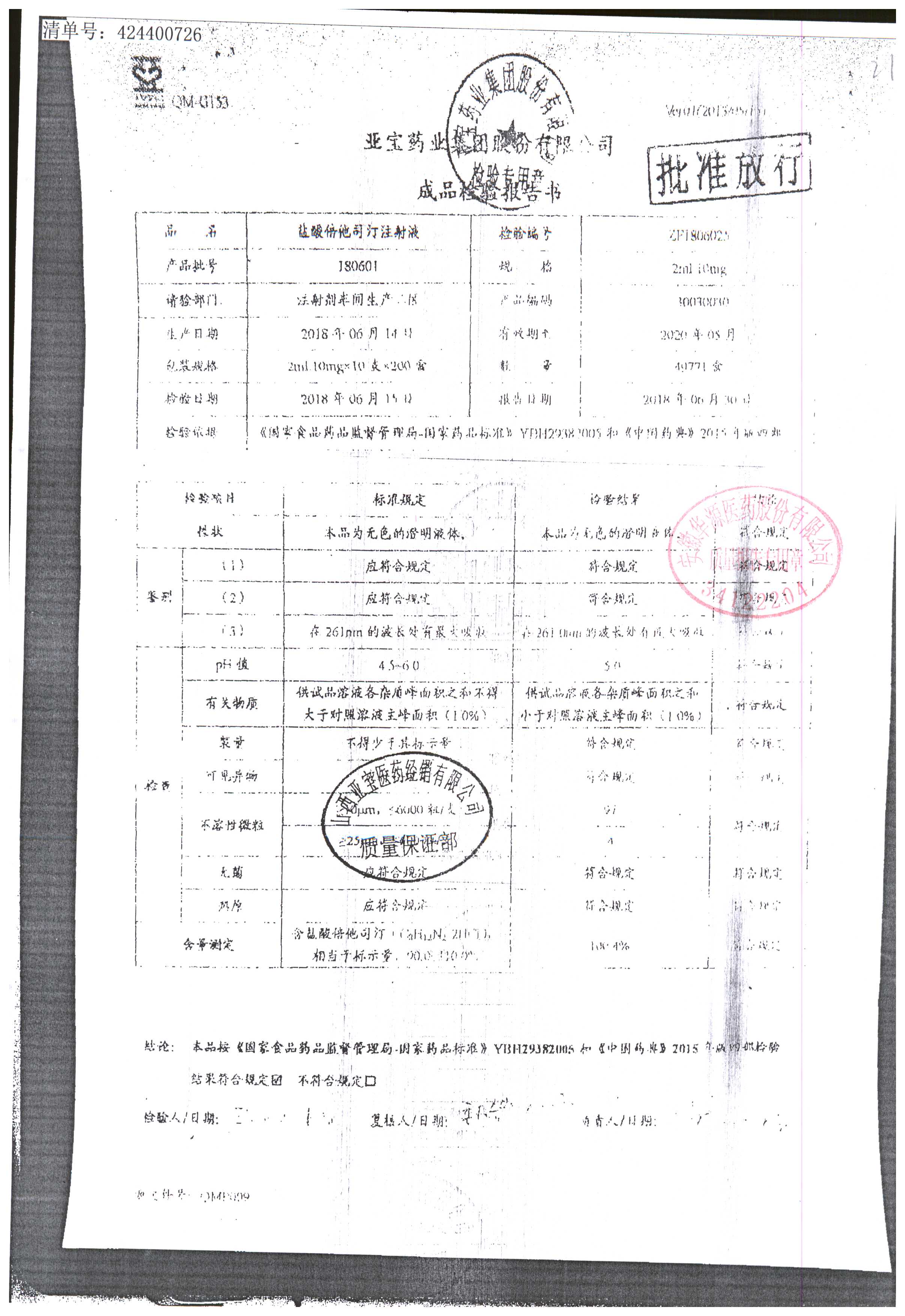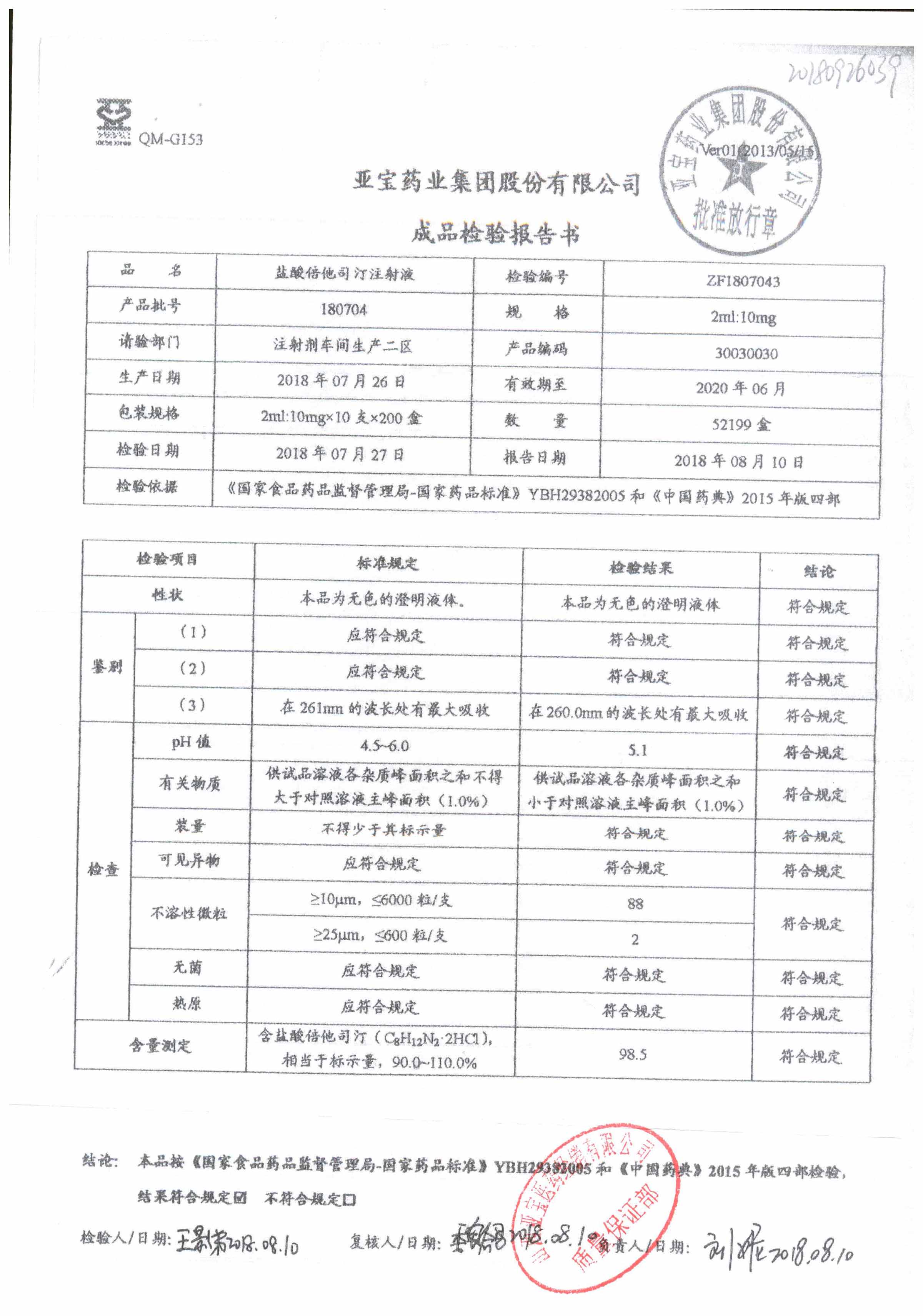 名称 | 规格 | 批号 | 药检报告 |