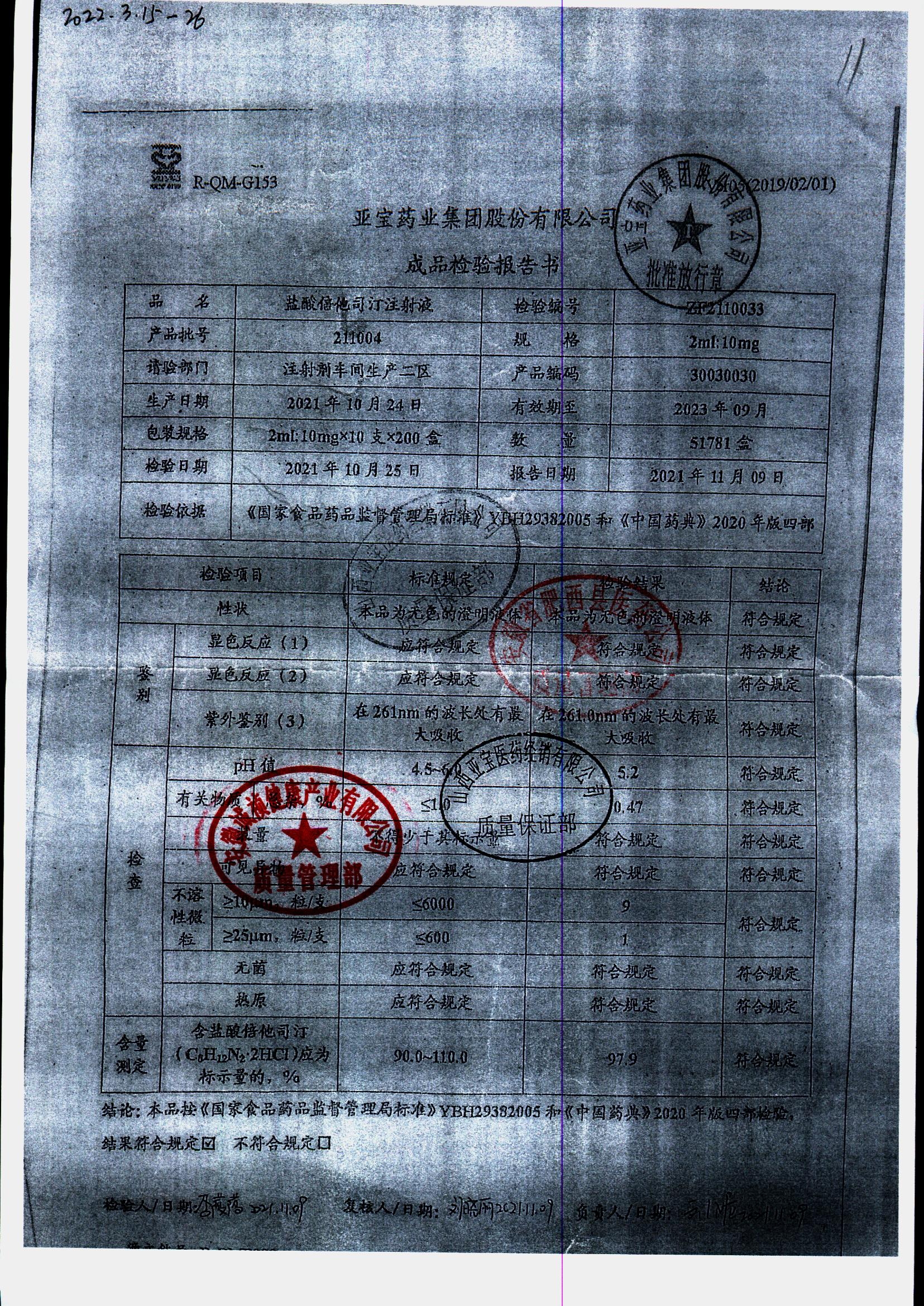 盐酸倍他司汀注射液 | 2ml:10,mg | 221110 | 查看详情 |
