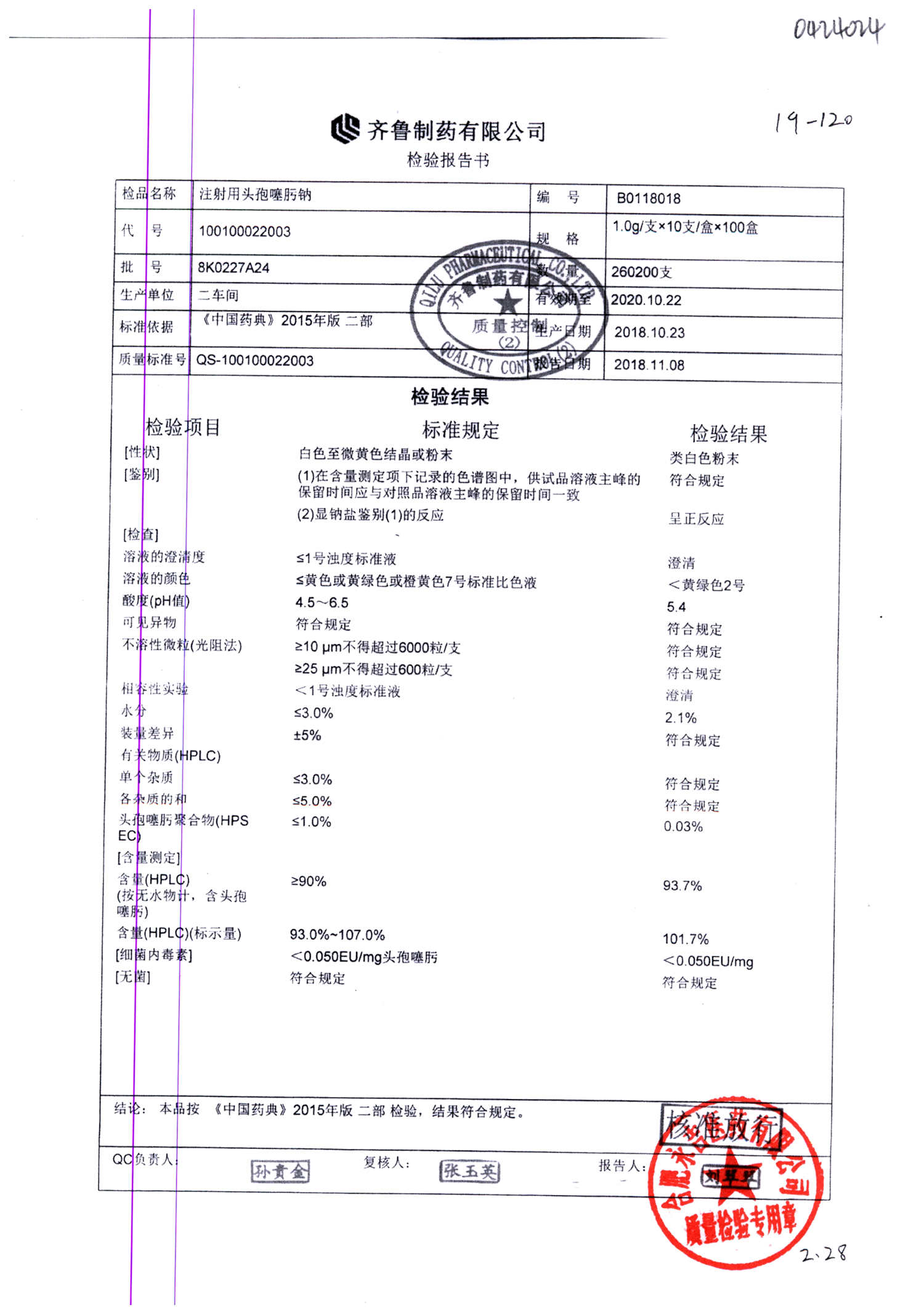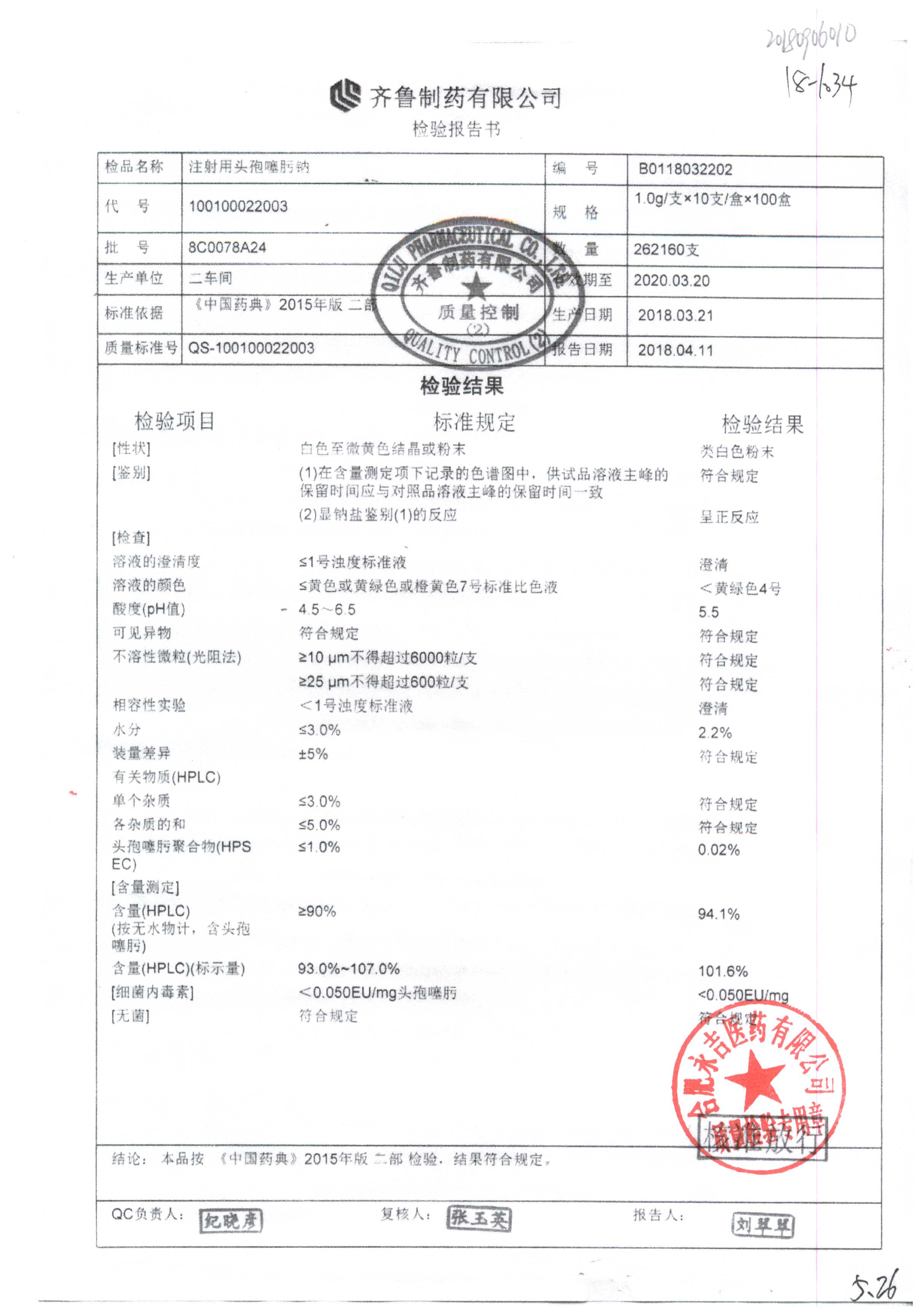 名称 | 规格 | 批号 | 药检报告 |