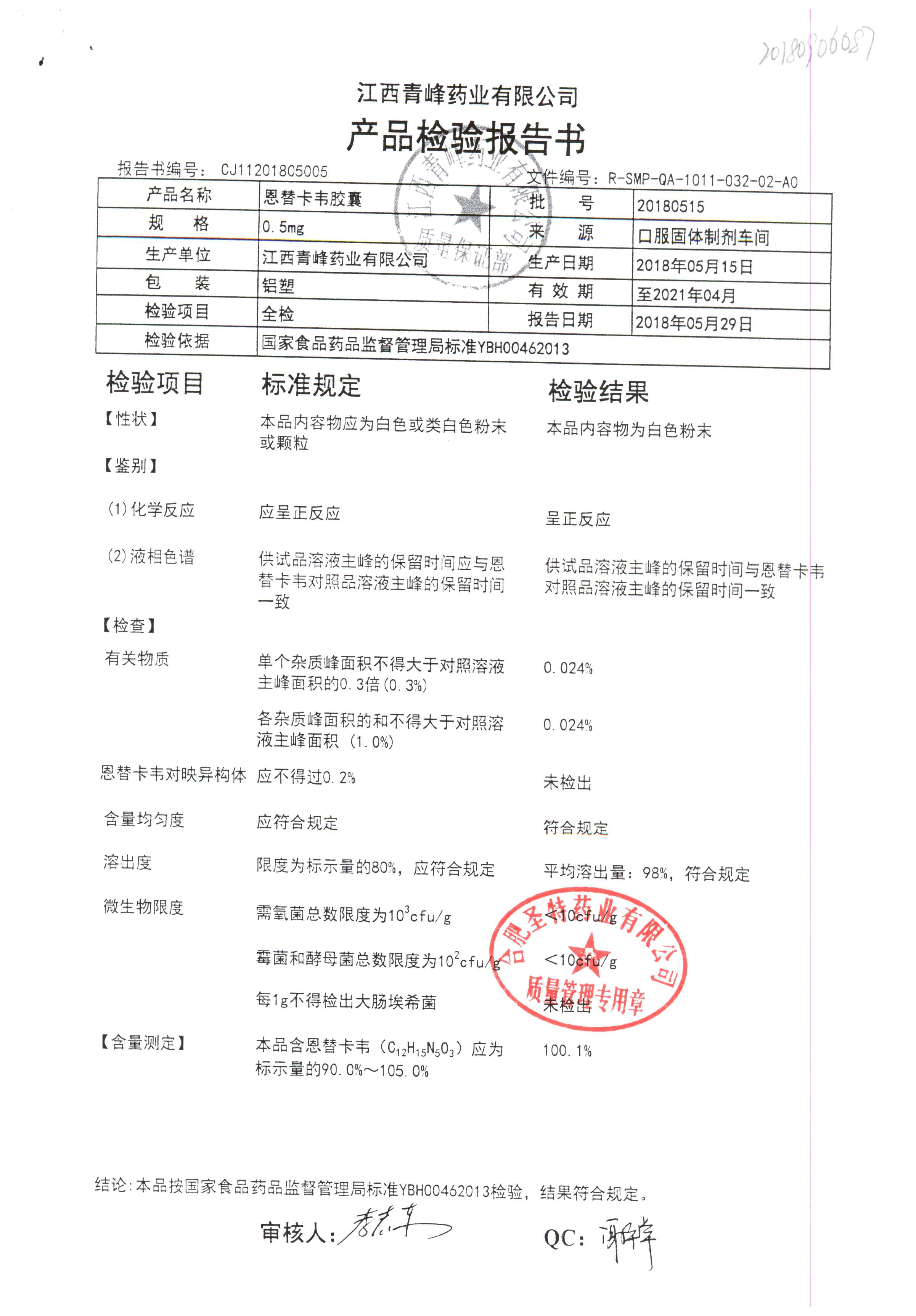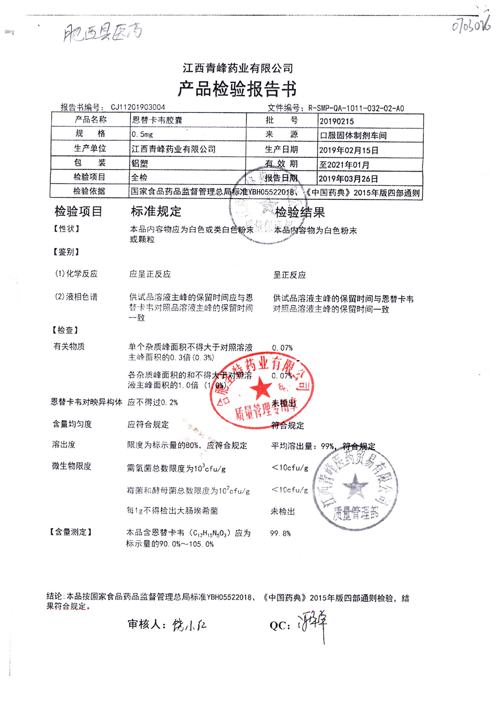 恩替卡韦胶囊 | 0.5mg | 20180515(2/4) | 查看详情 |