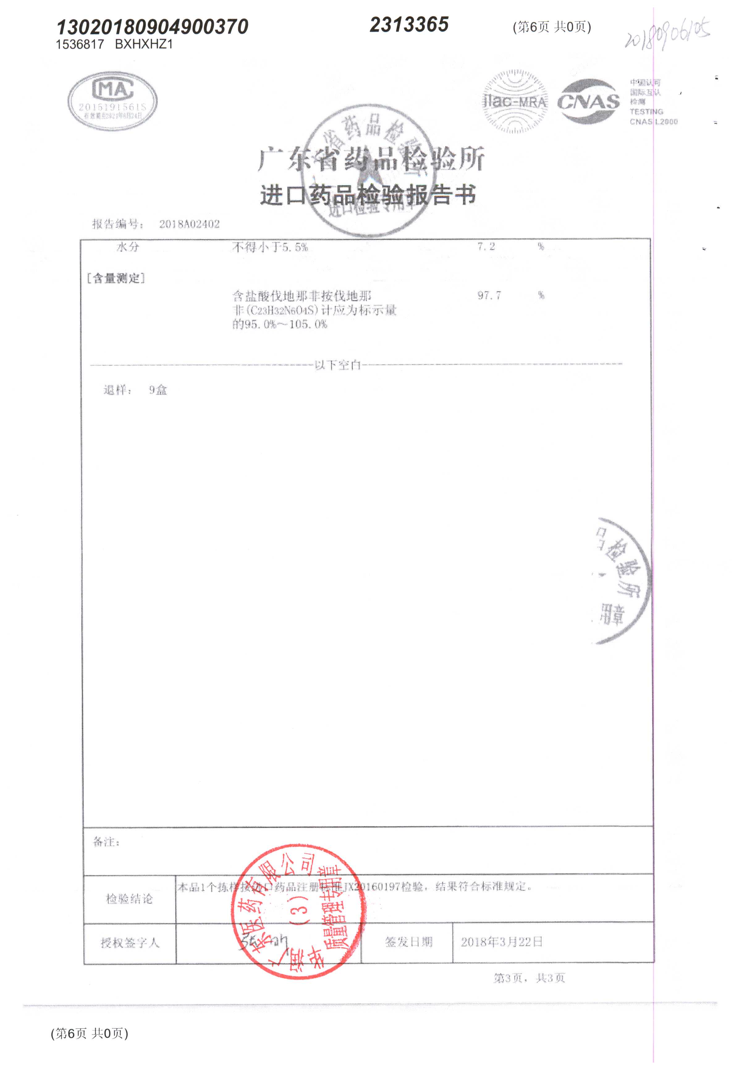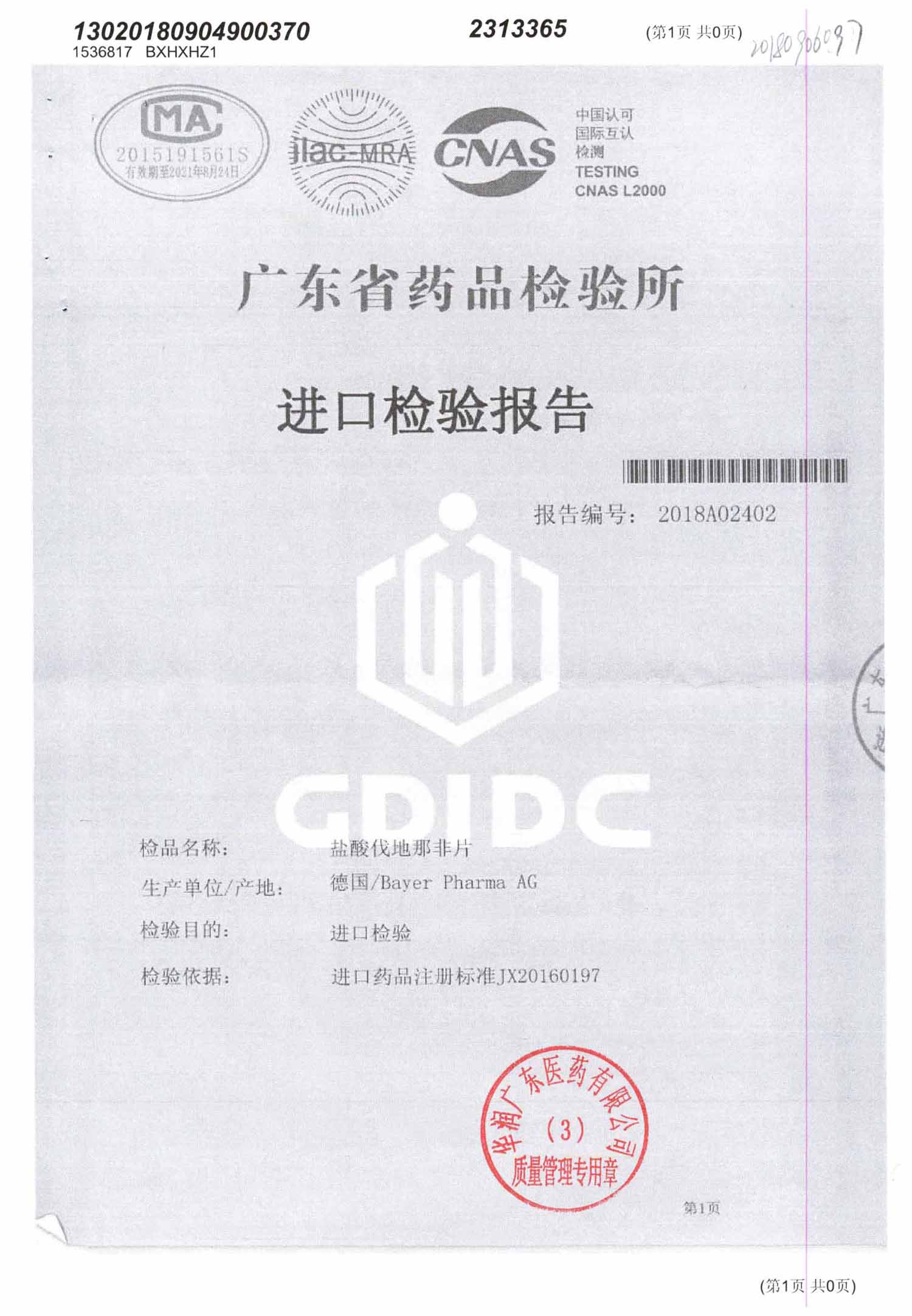 名称 | 规格 | 批号 | 药检报告 |