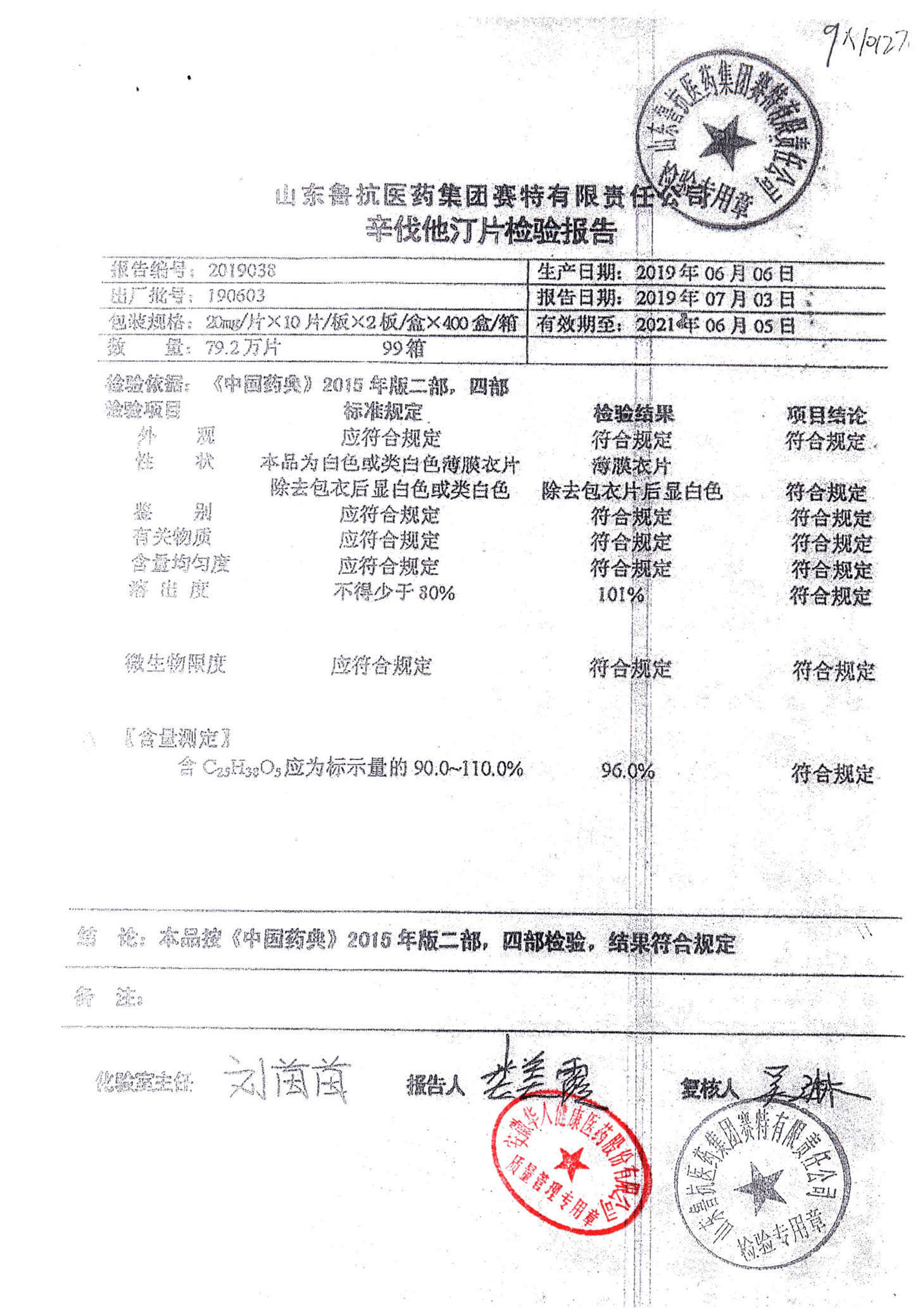 辛伐他汀片 | 20mg*20片 | 190603 | 查看详情 |