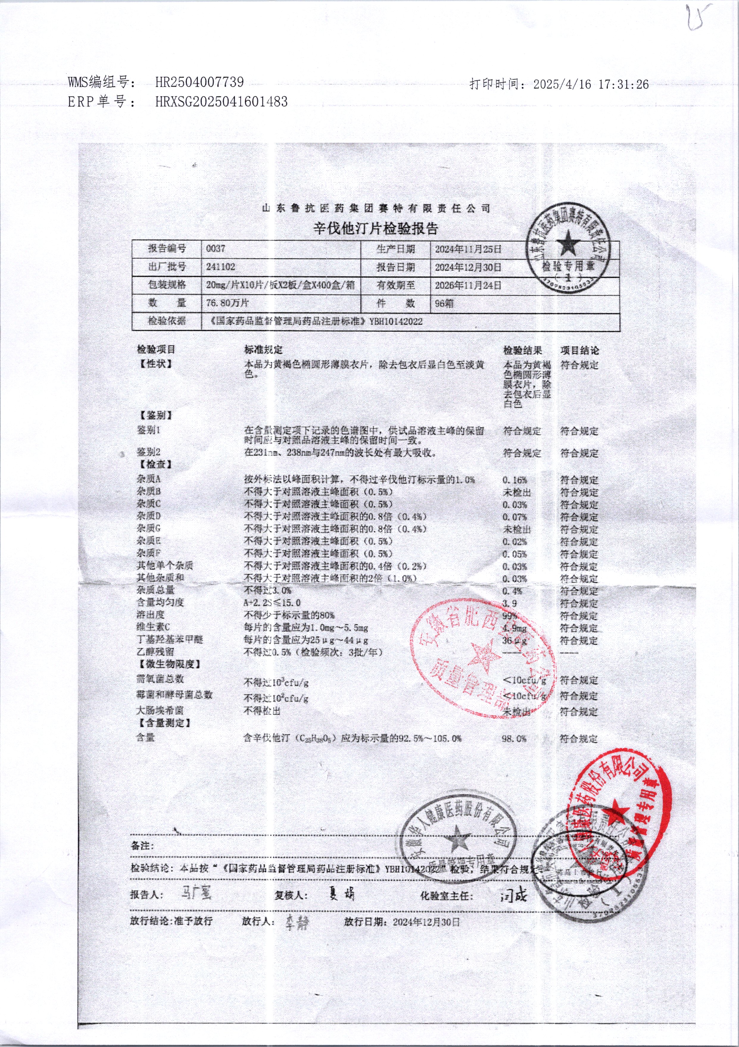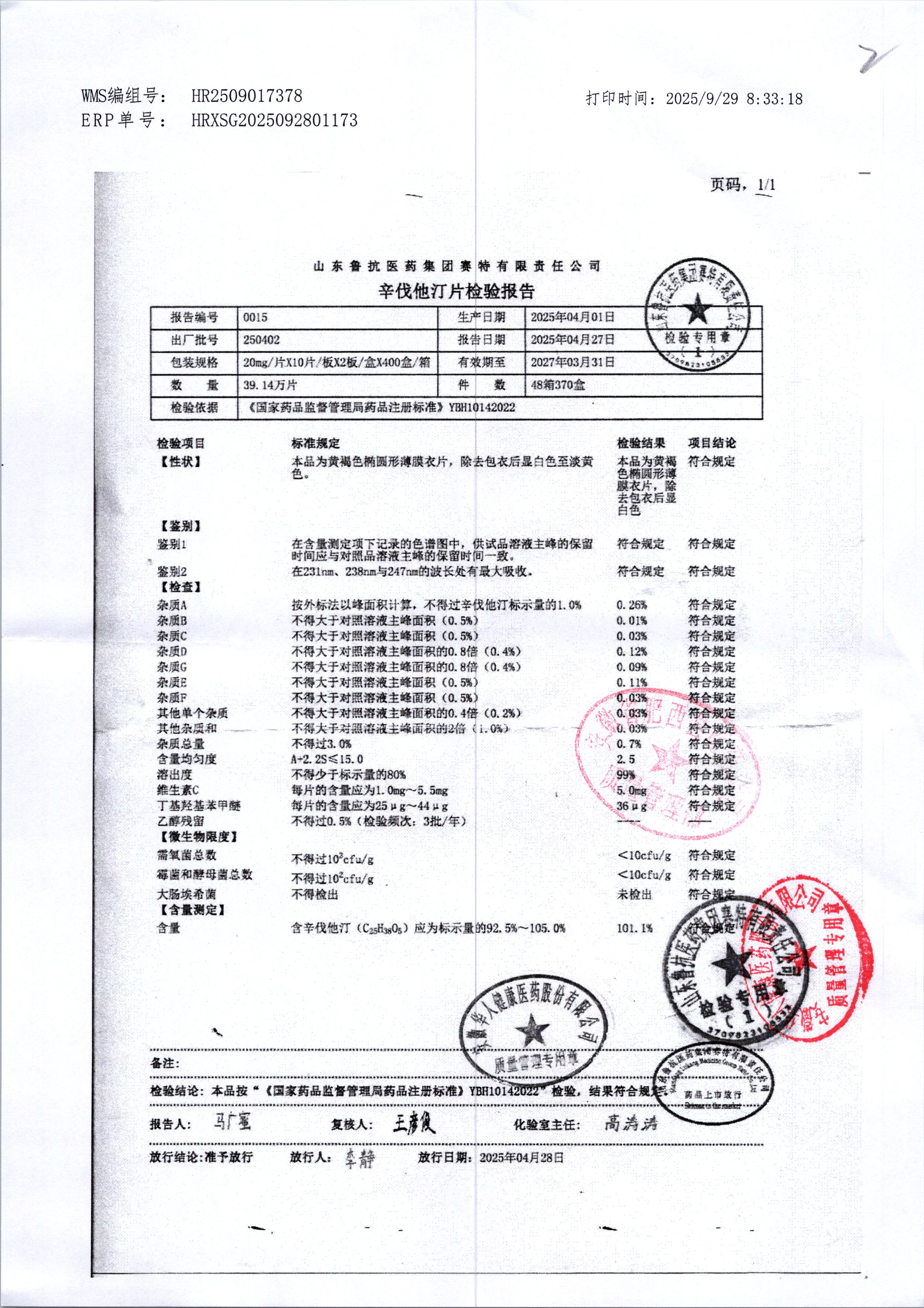 辛伐他汀片 | 20mg*20片 | 250402 | 查看详情 |