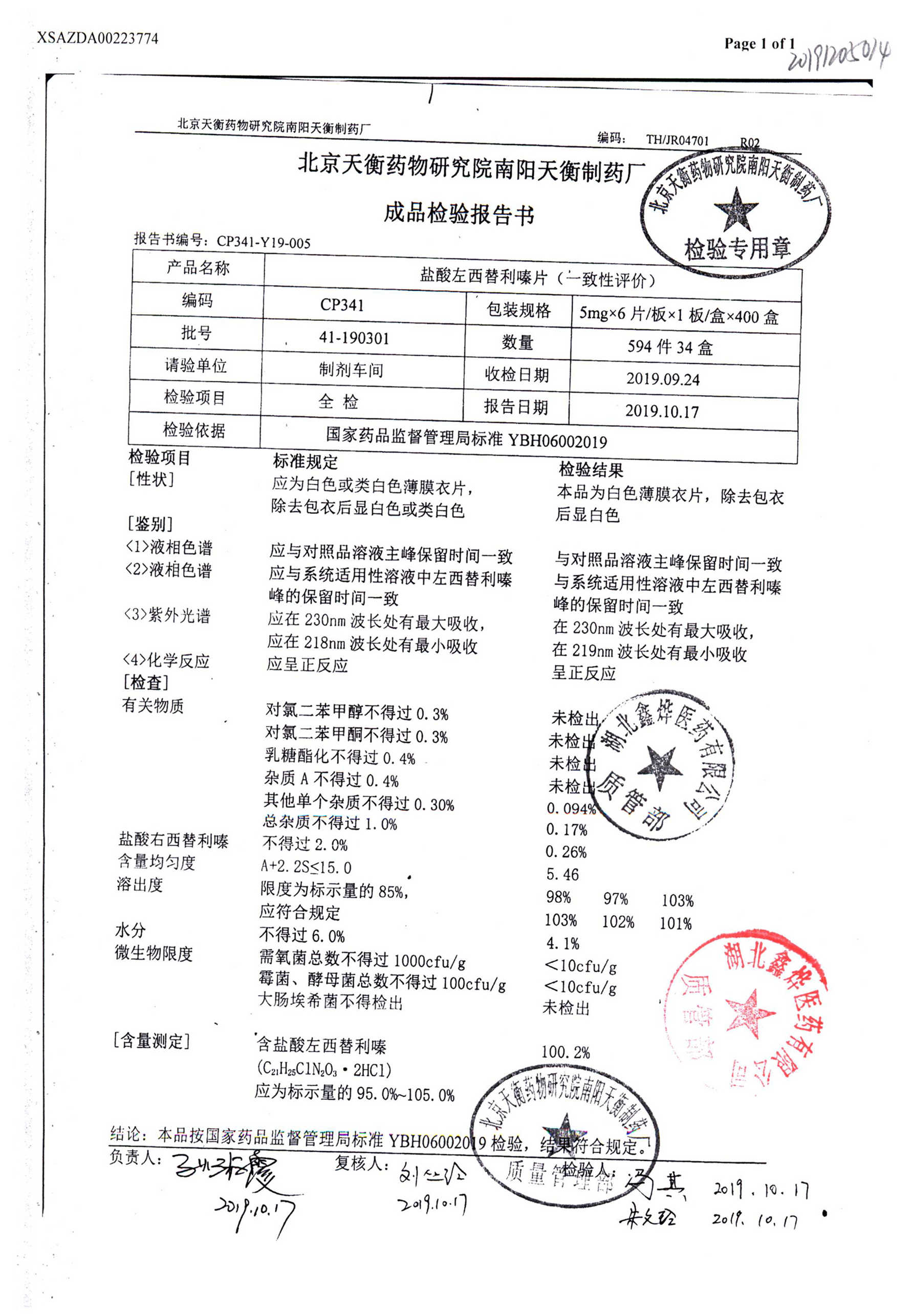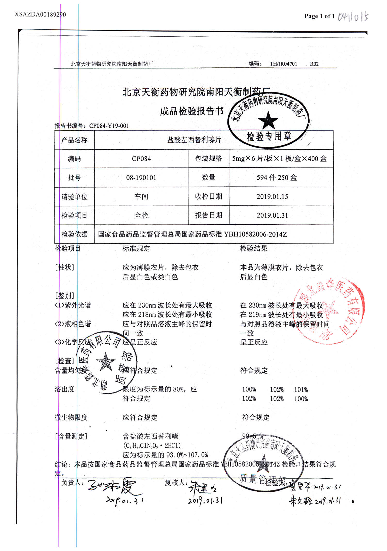 盐酸左西替利嗪片 | 5mg*6片 | 41-190301 | 查看详情 |