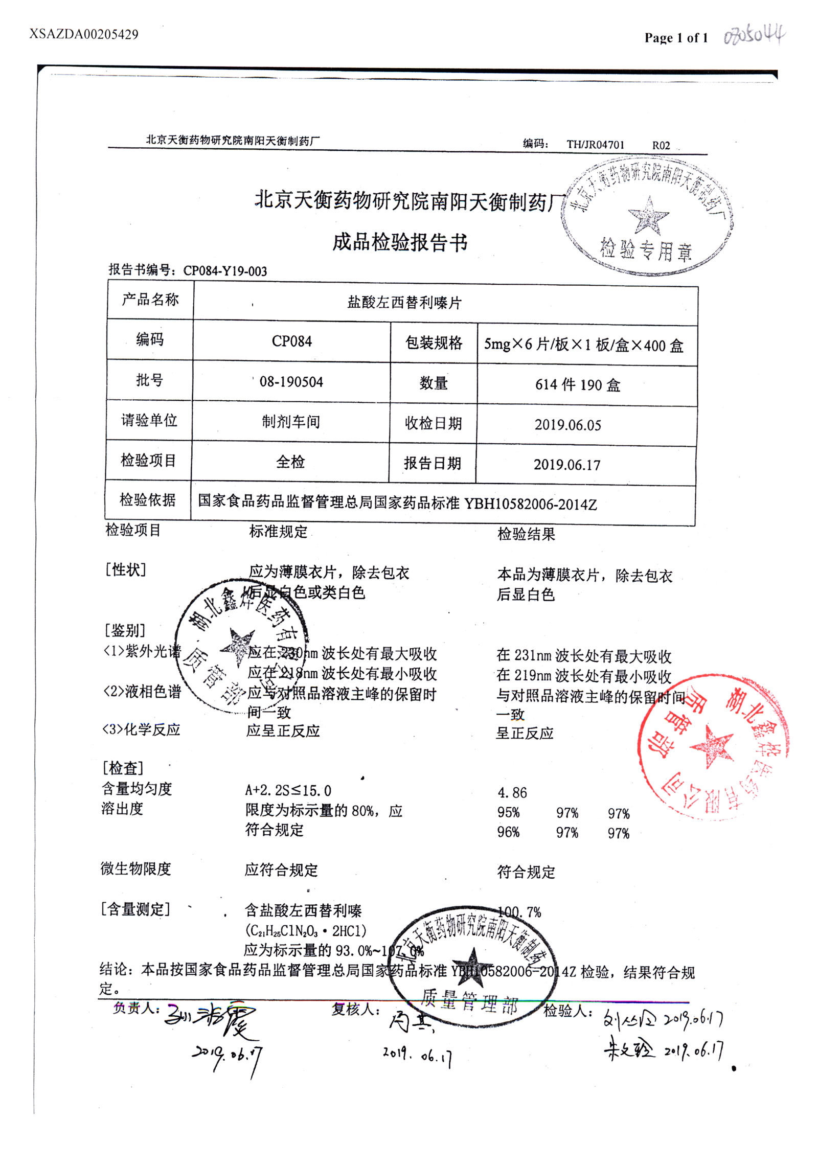 盐酸左西替利嗪片 | 5mg*6片 | 08-190504 | 查看详情 |