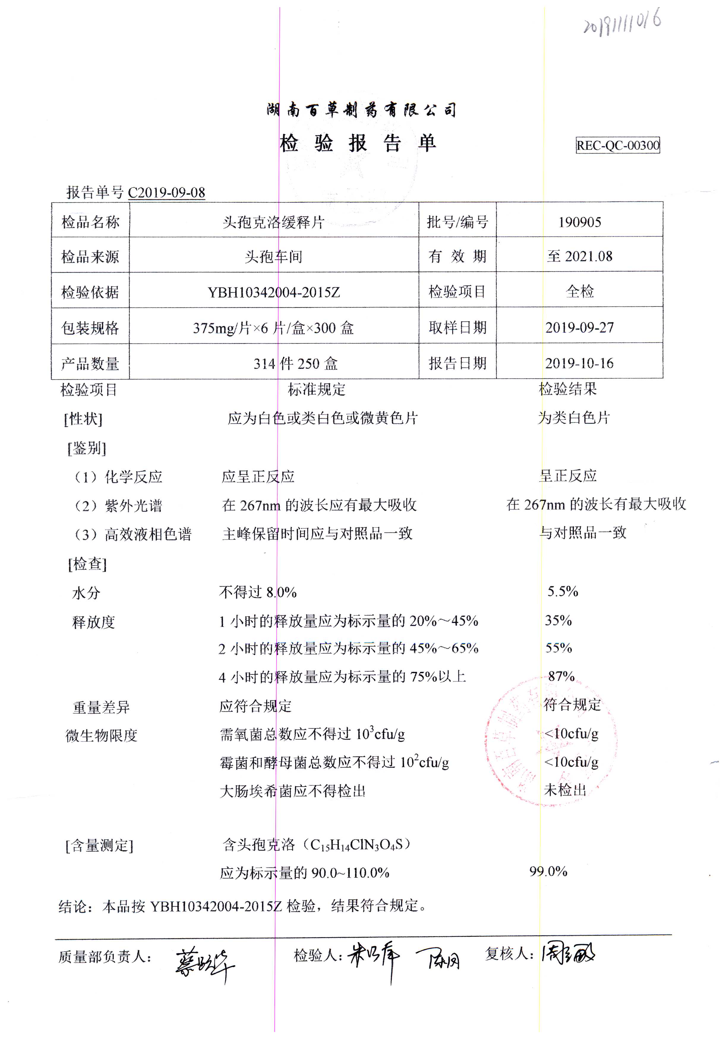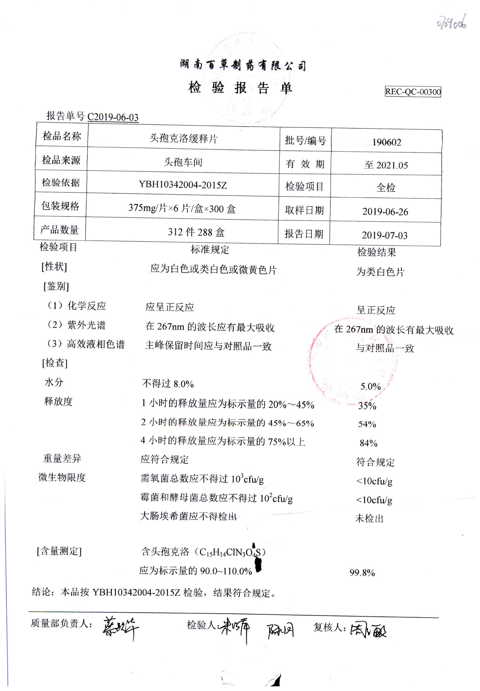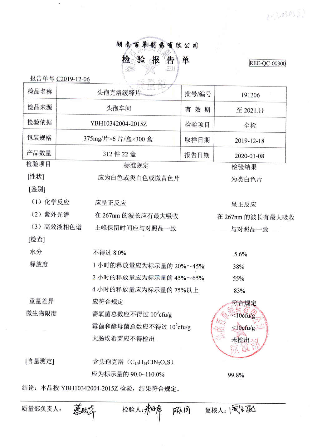 头孢克洛缓释片 | 375mg*6片 | 190905 | 查看详情 |
