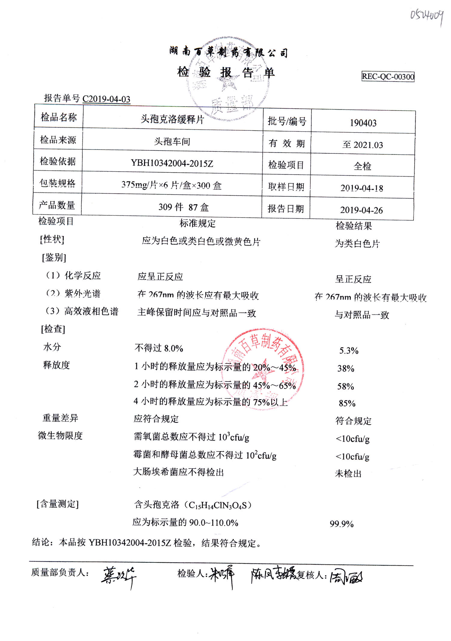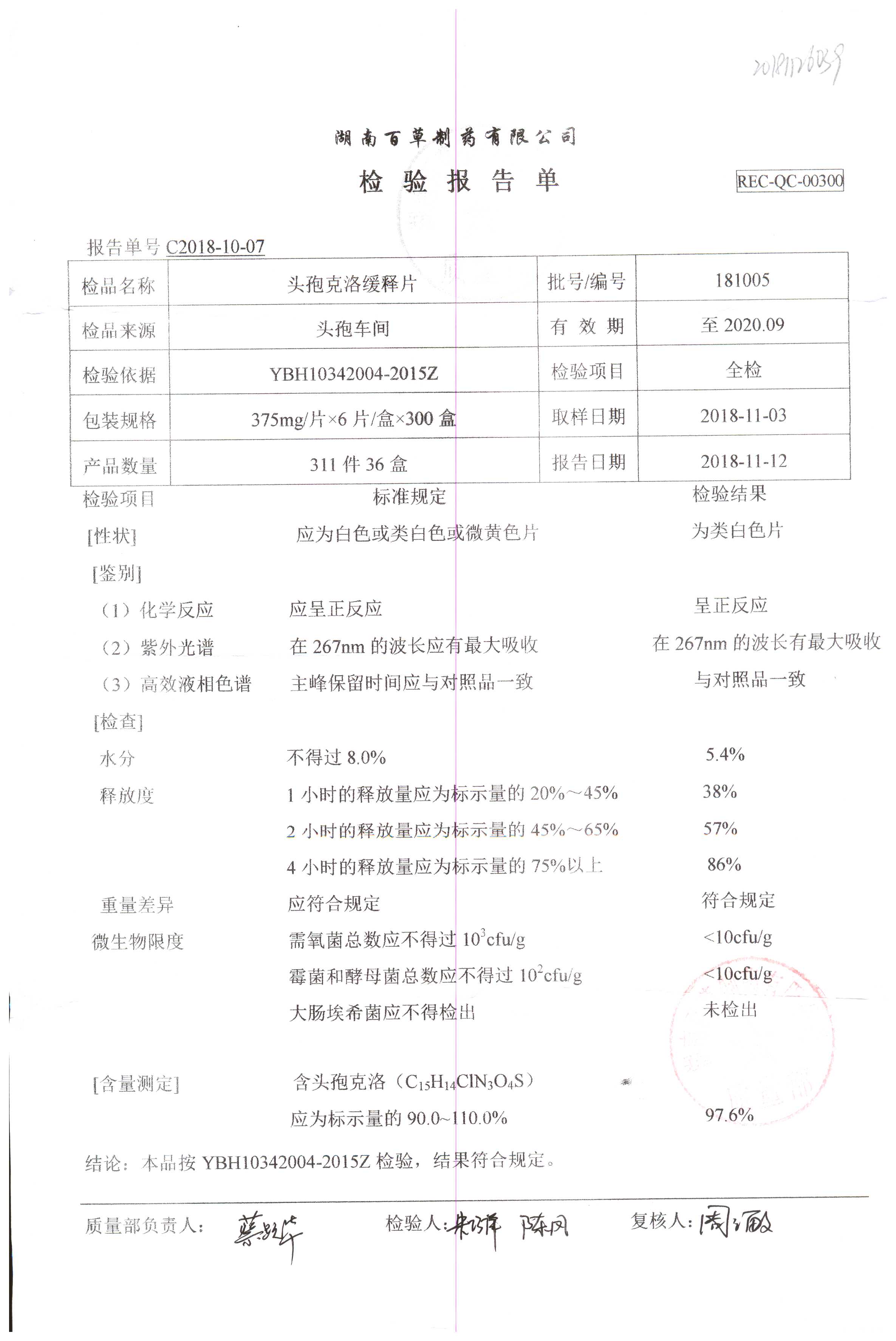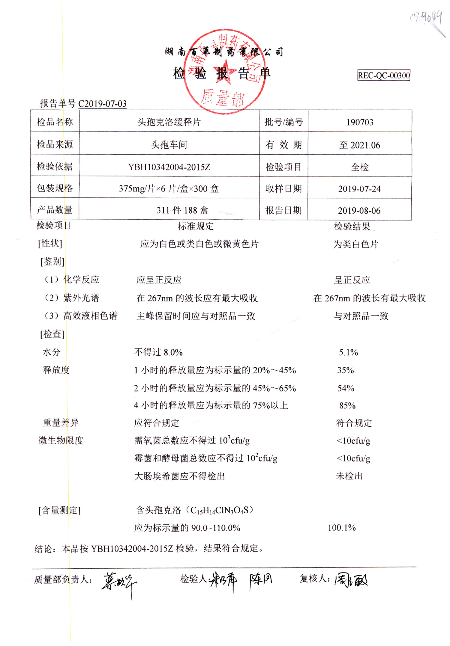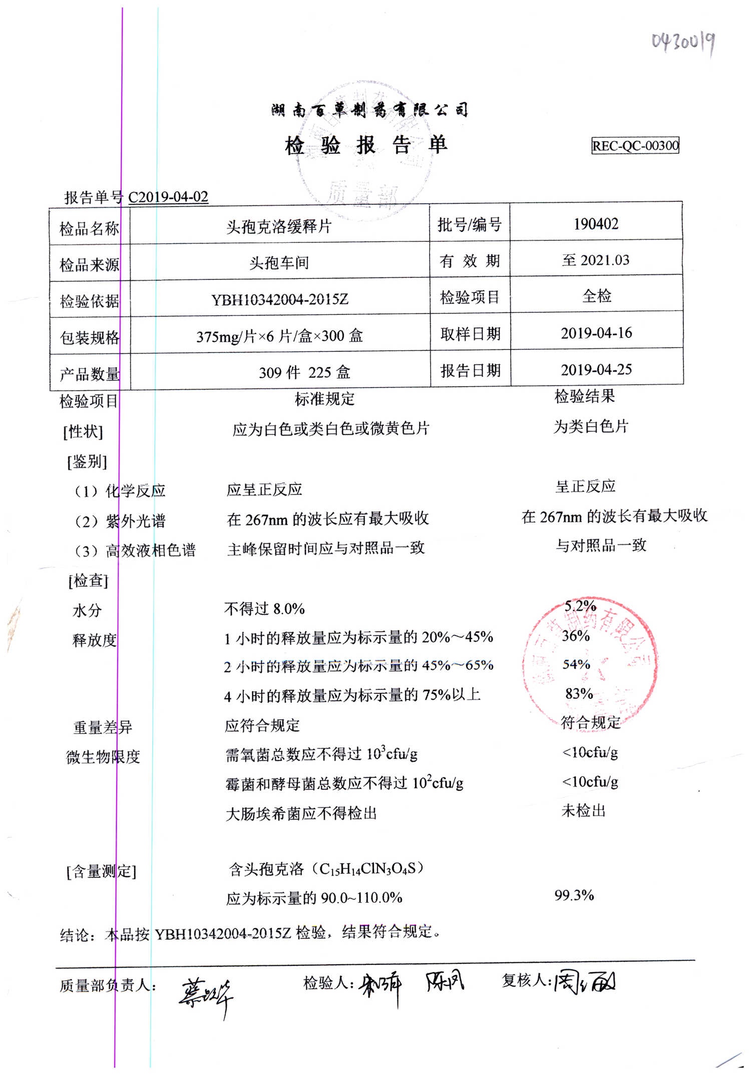 头孢克洛缓释片 | 375mg*6片 | 190905 | 查看详情 |