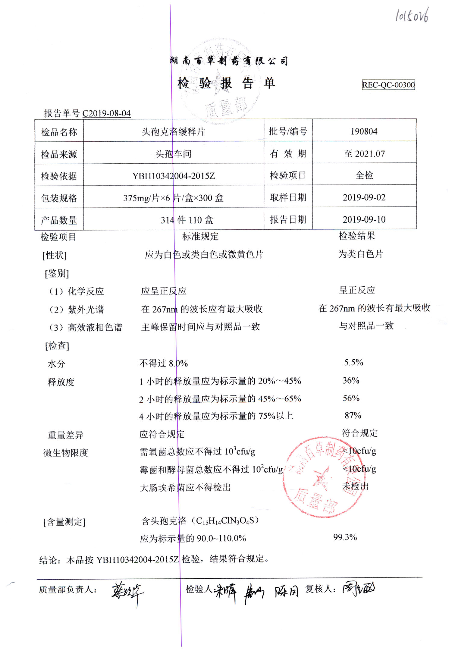 头孢克洛缓释片 | 375mg*6片 | 190804 | 查看详情 |