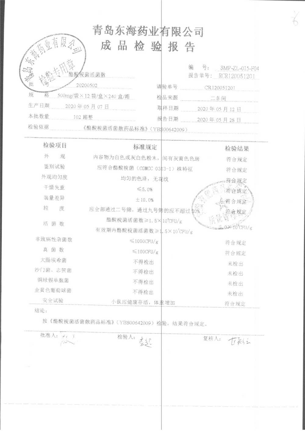 酪酸梭菌活菌散 | 500mg*12袋 | 20200502 | 查看详情 |