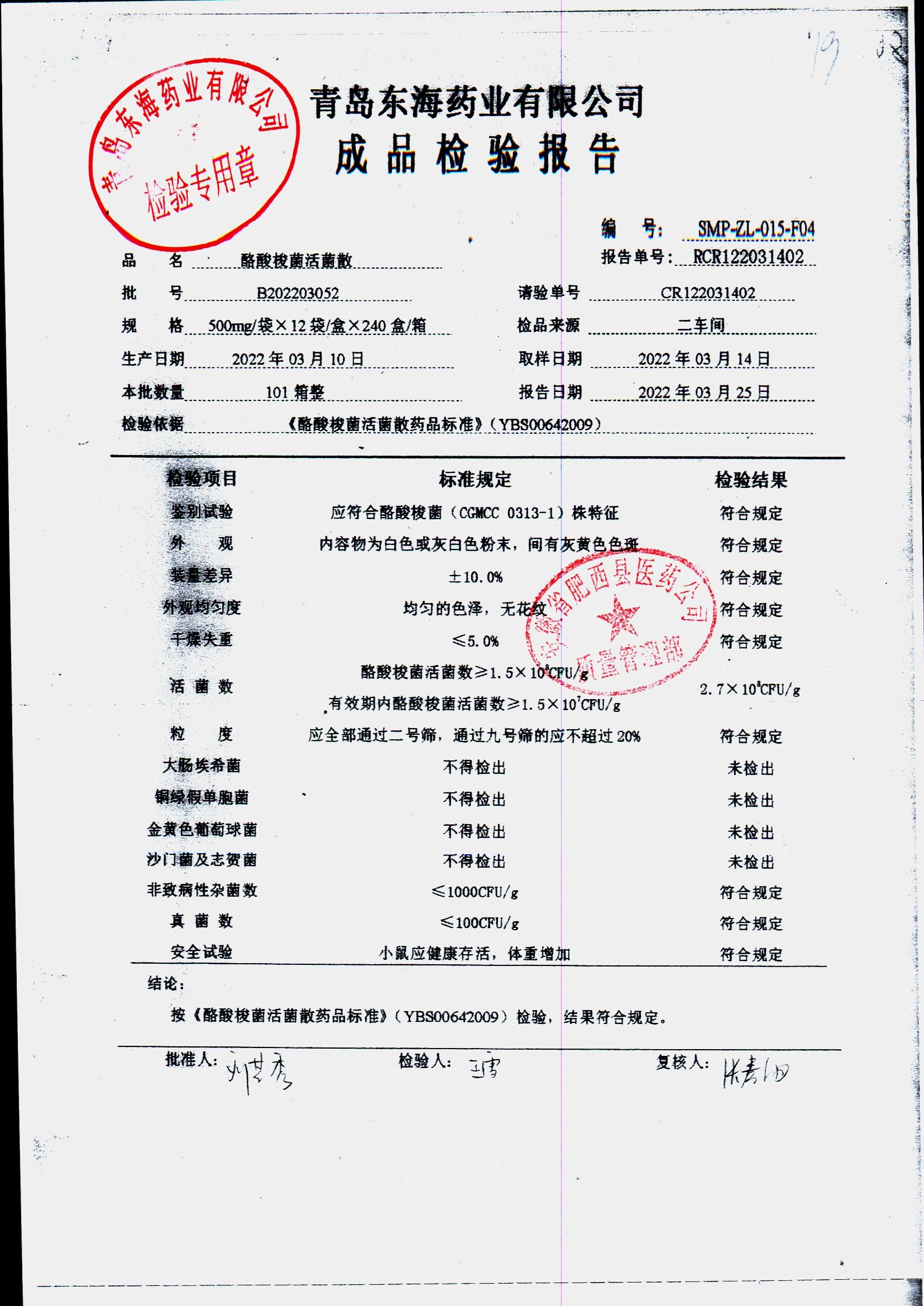 酪酸梭菌活菌散 | 500mg*12袋 | B202203052 | 查看详情 |
