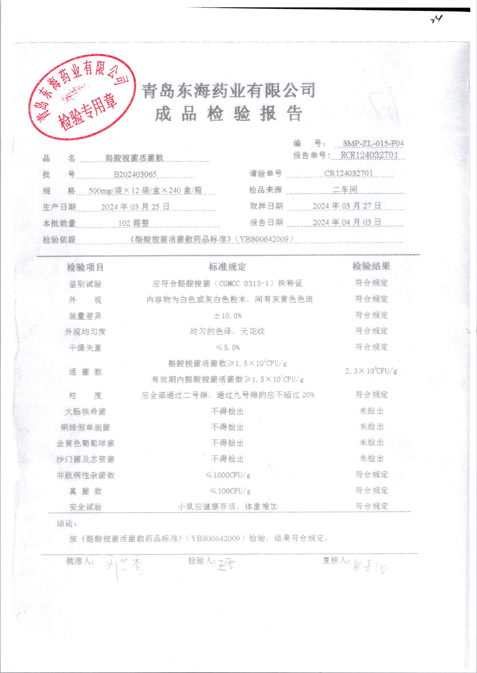 酪酸梭菌活菌散 | 500mg*12袋 | B202403065 | 查看详情 |
