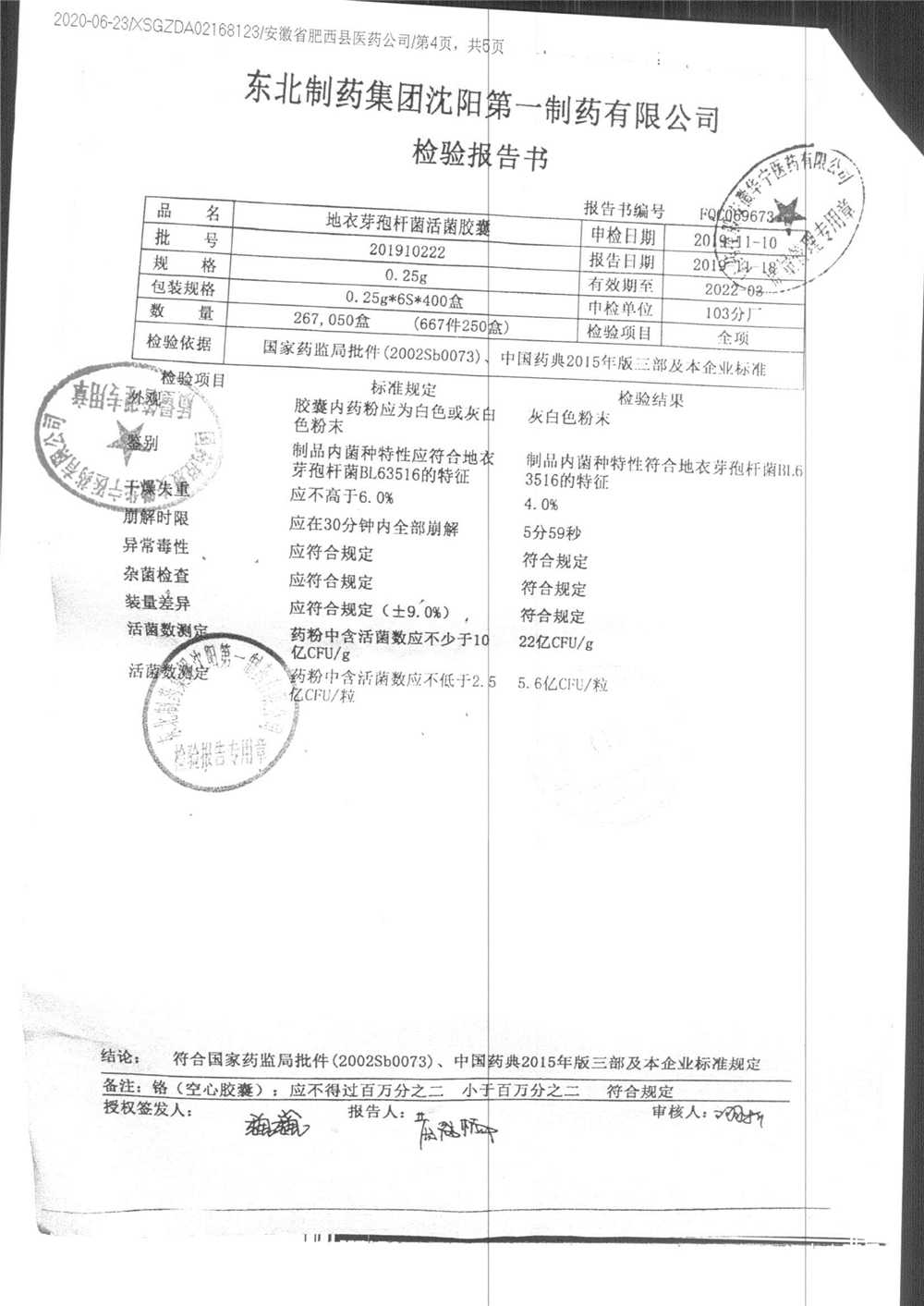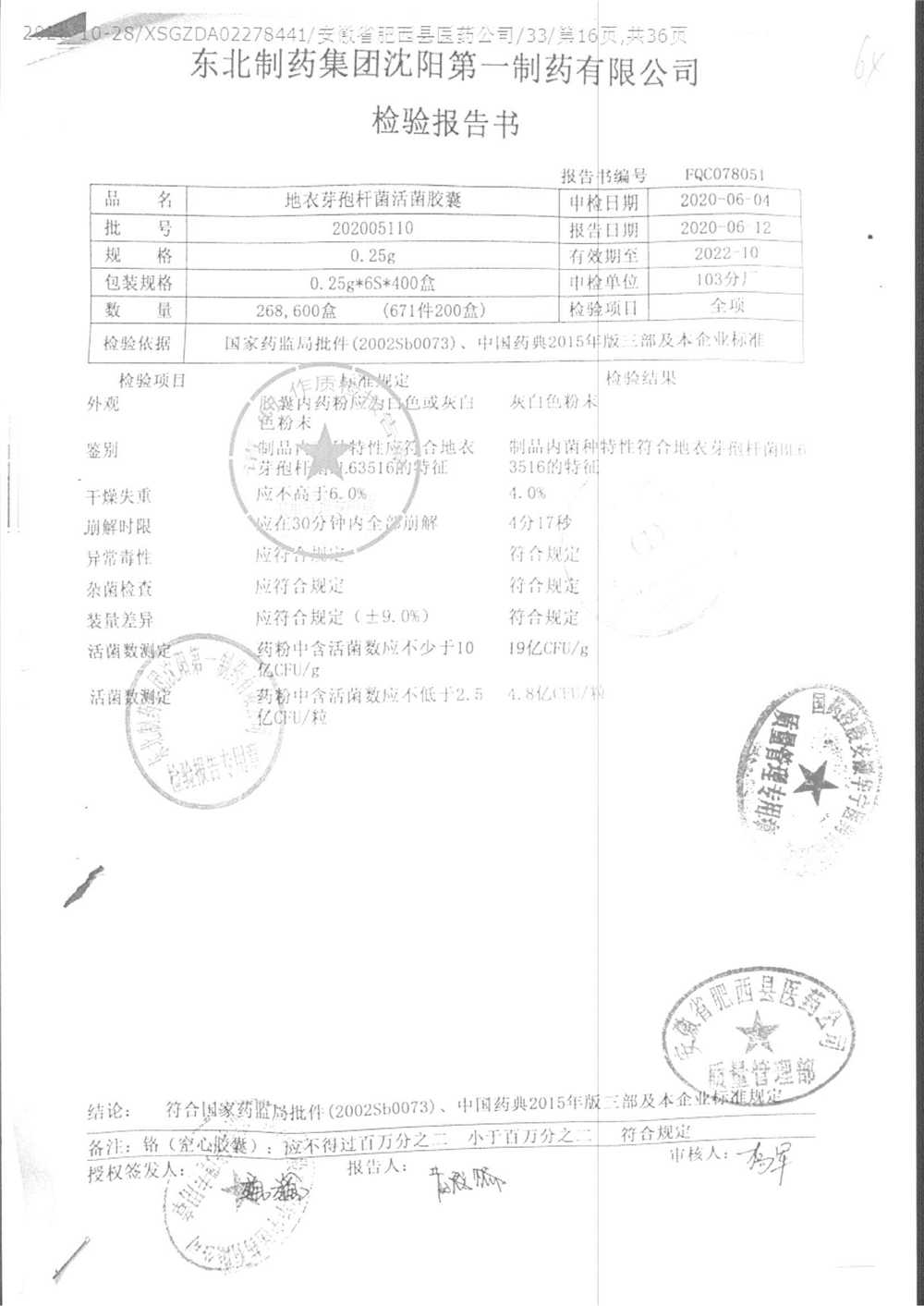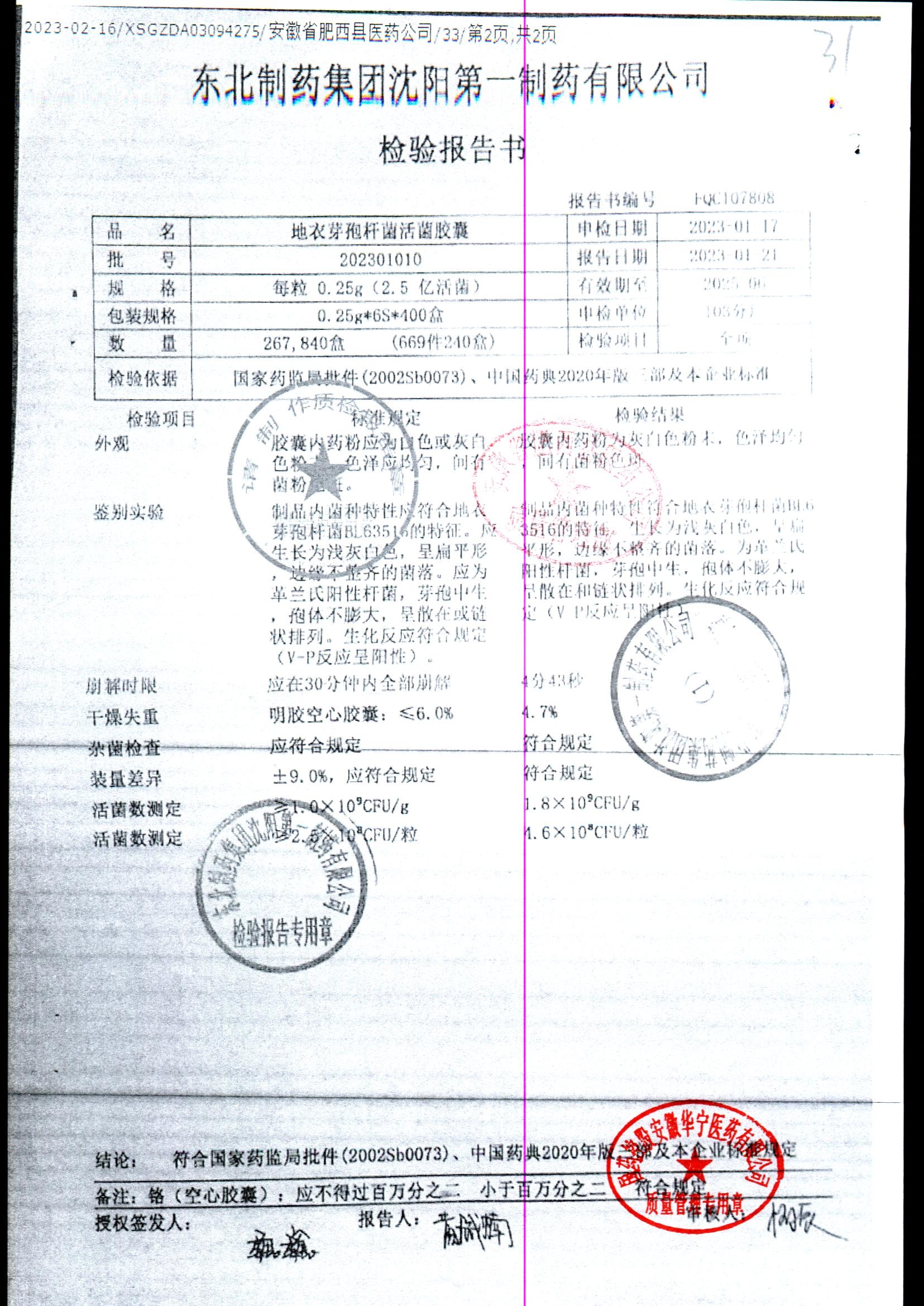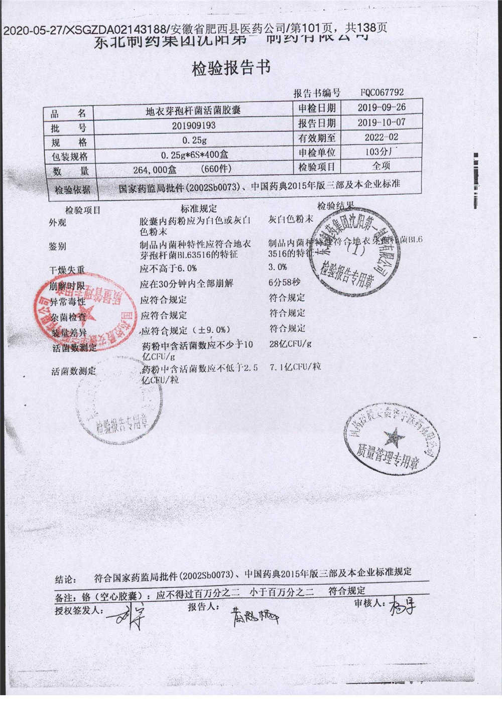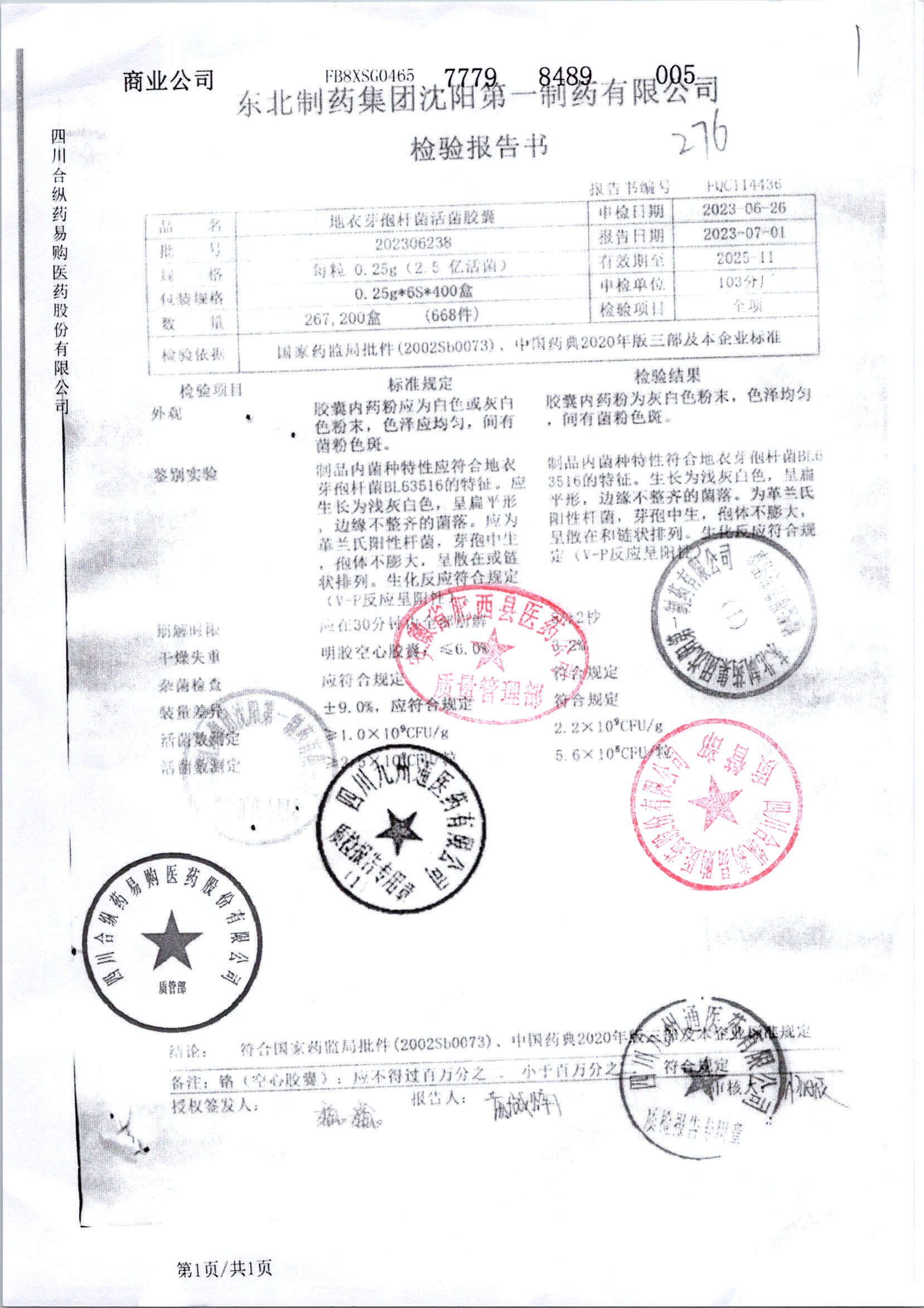 地衣芽孢杆菌活菌胶囊 | 0.25g*6s | 202306238 | 查看详情 |