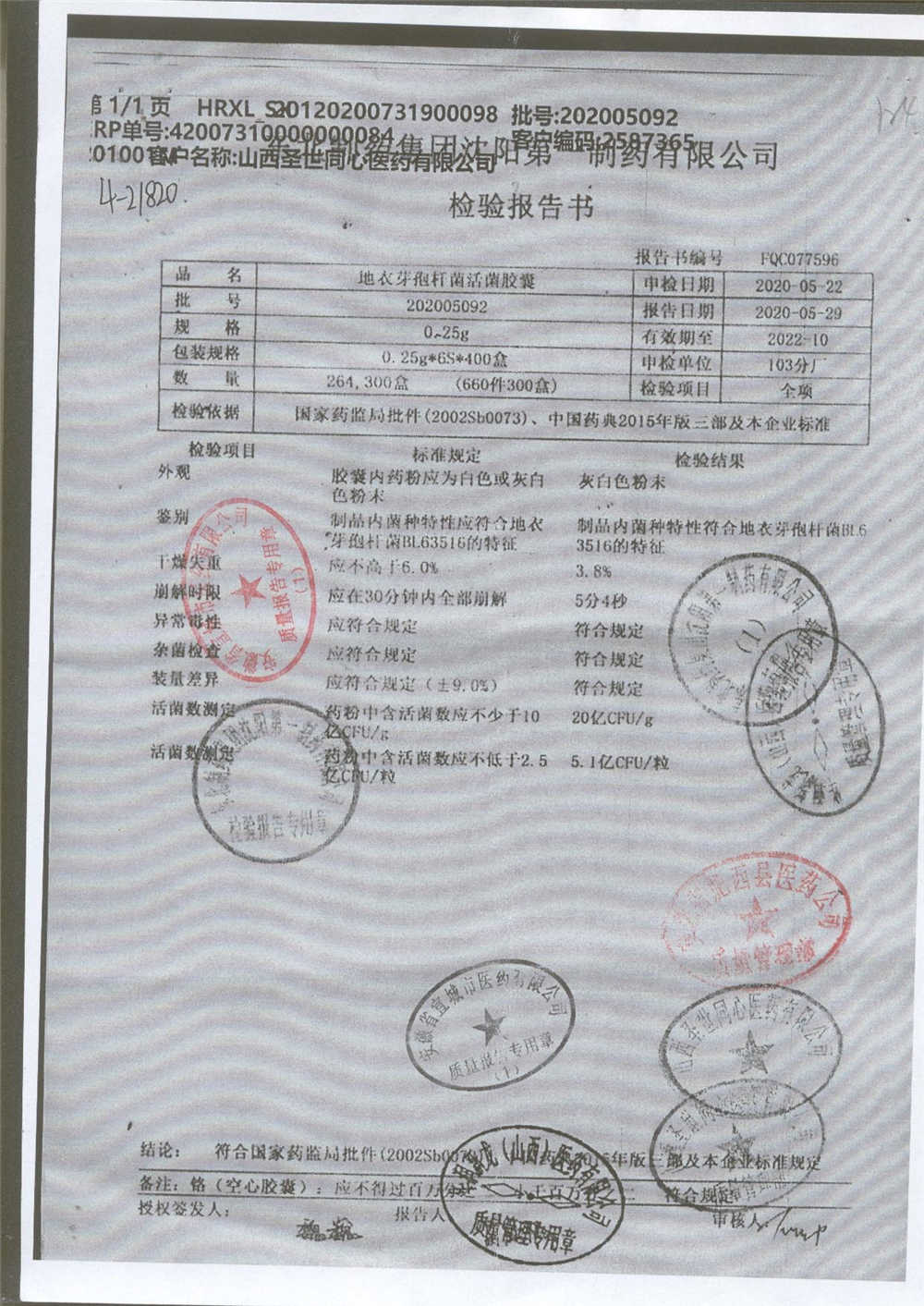地衣芽孢杆菌活菌胶囊 | 0.25g*6s | 202005092 | 查看详情 |