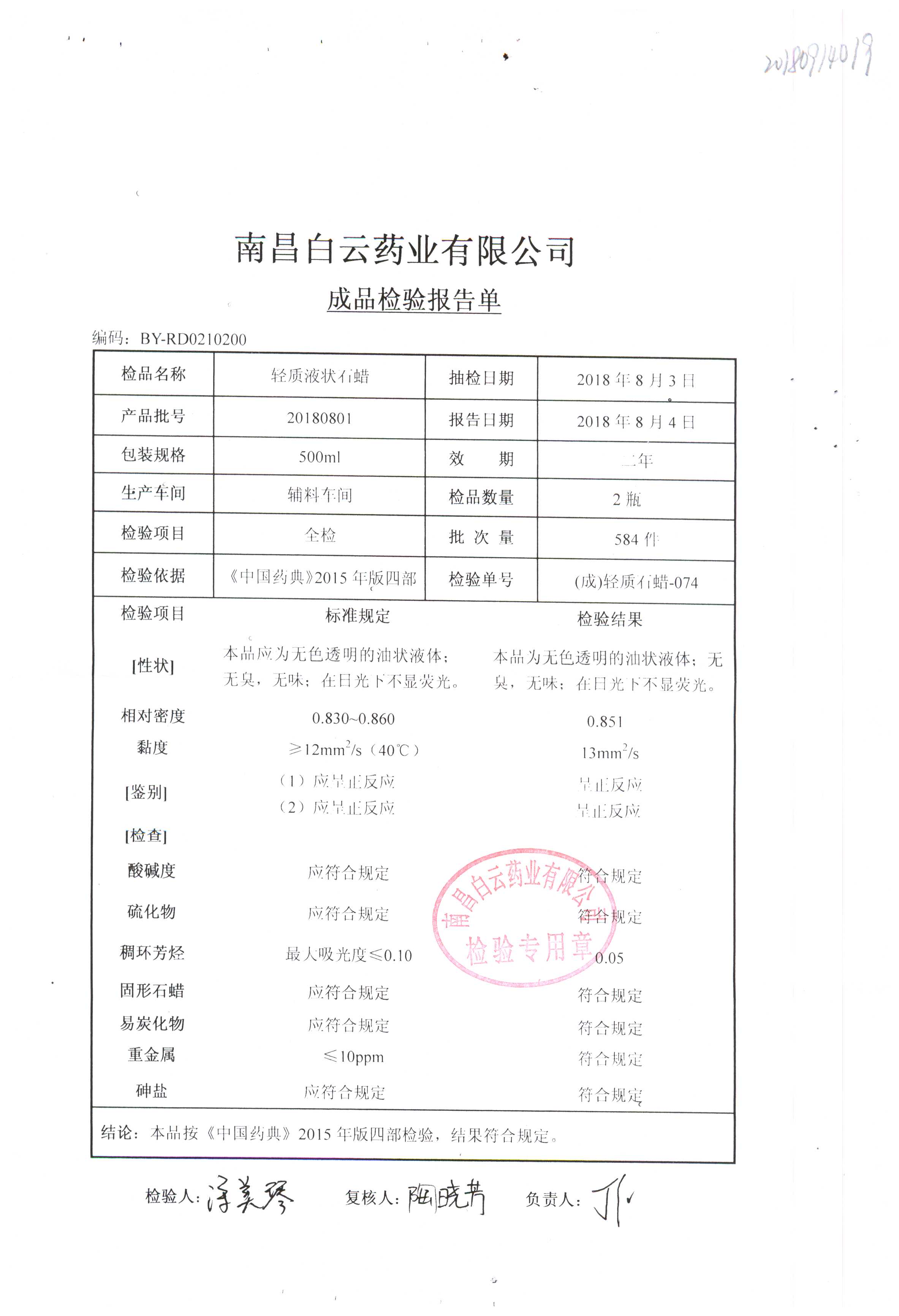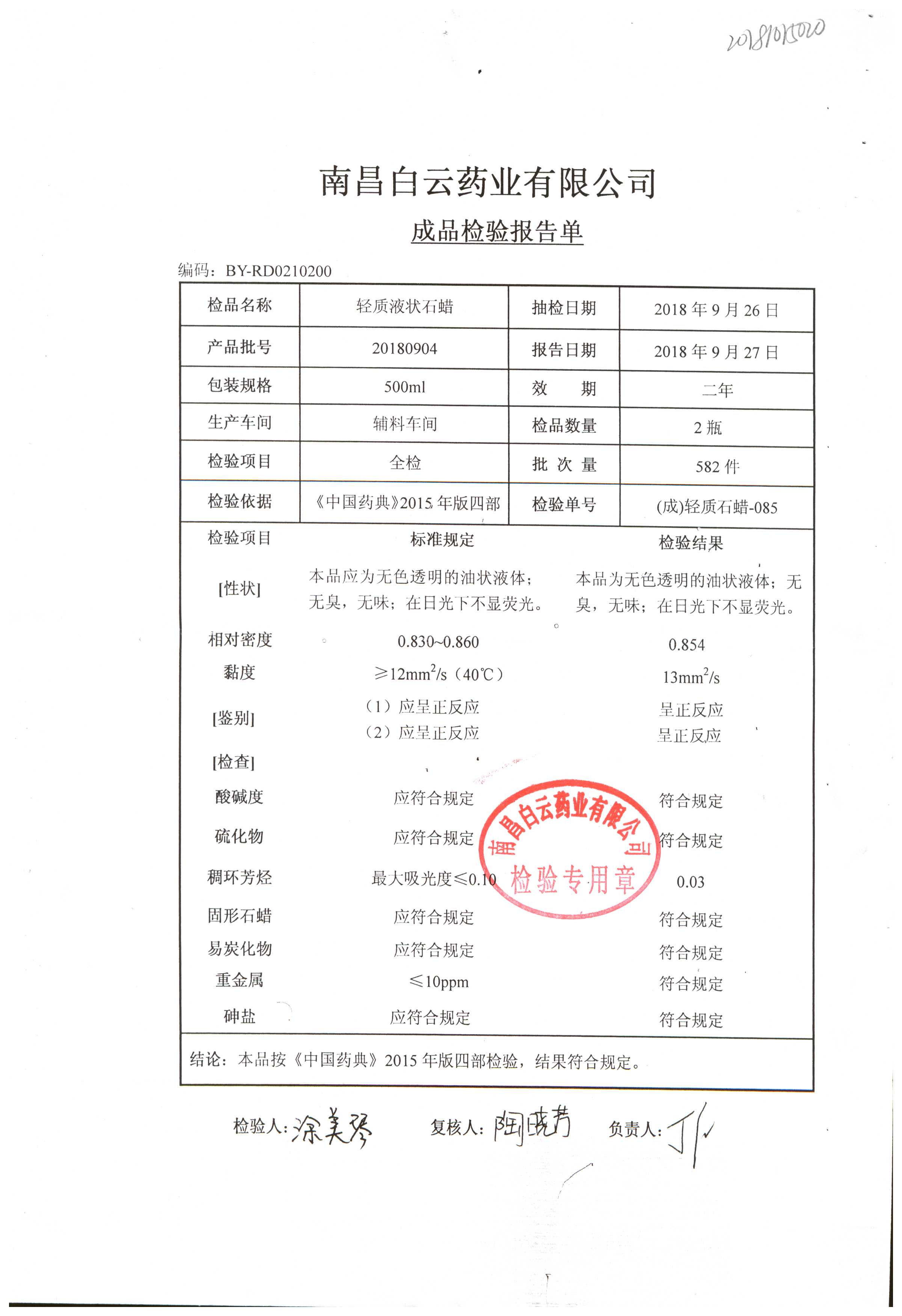 轻质液状石蜡 | 500ml | 20180904 | 查看详情 |