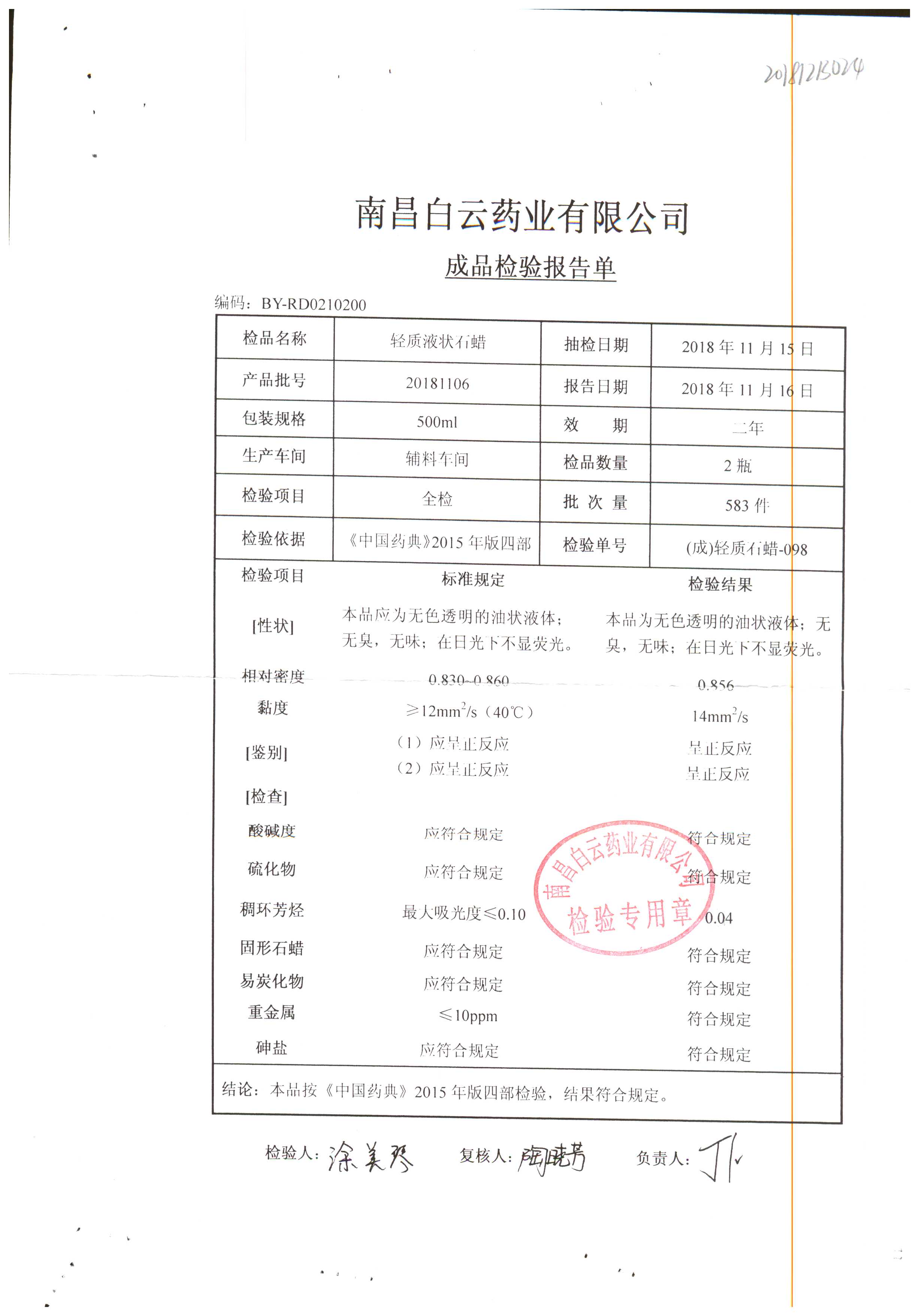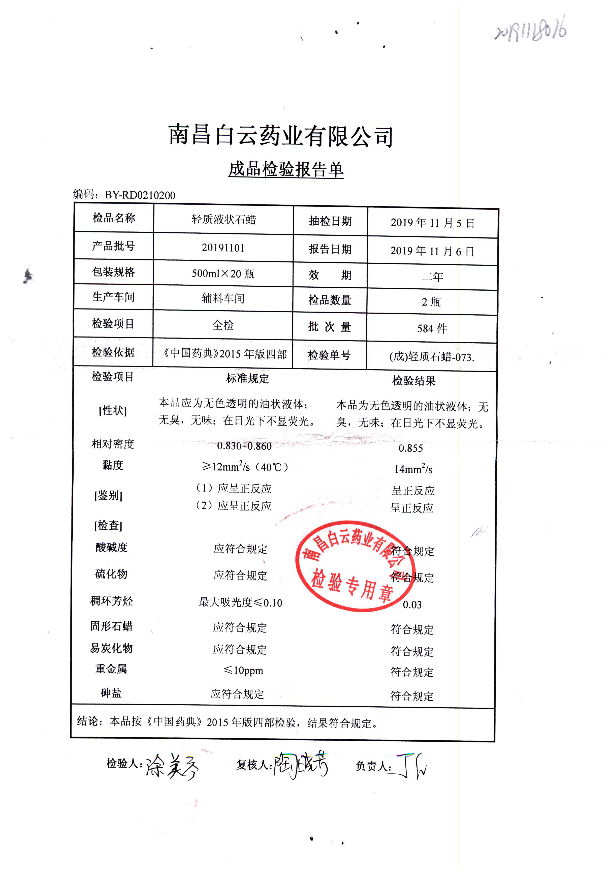 轻质液状石蜡 | 500ml | 20181106 | 查看详情 |