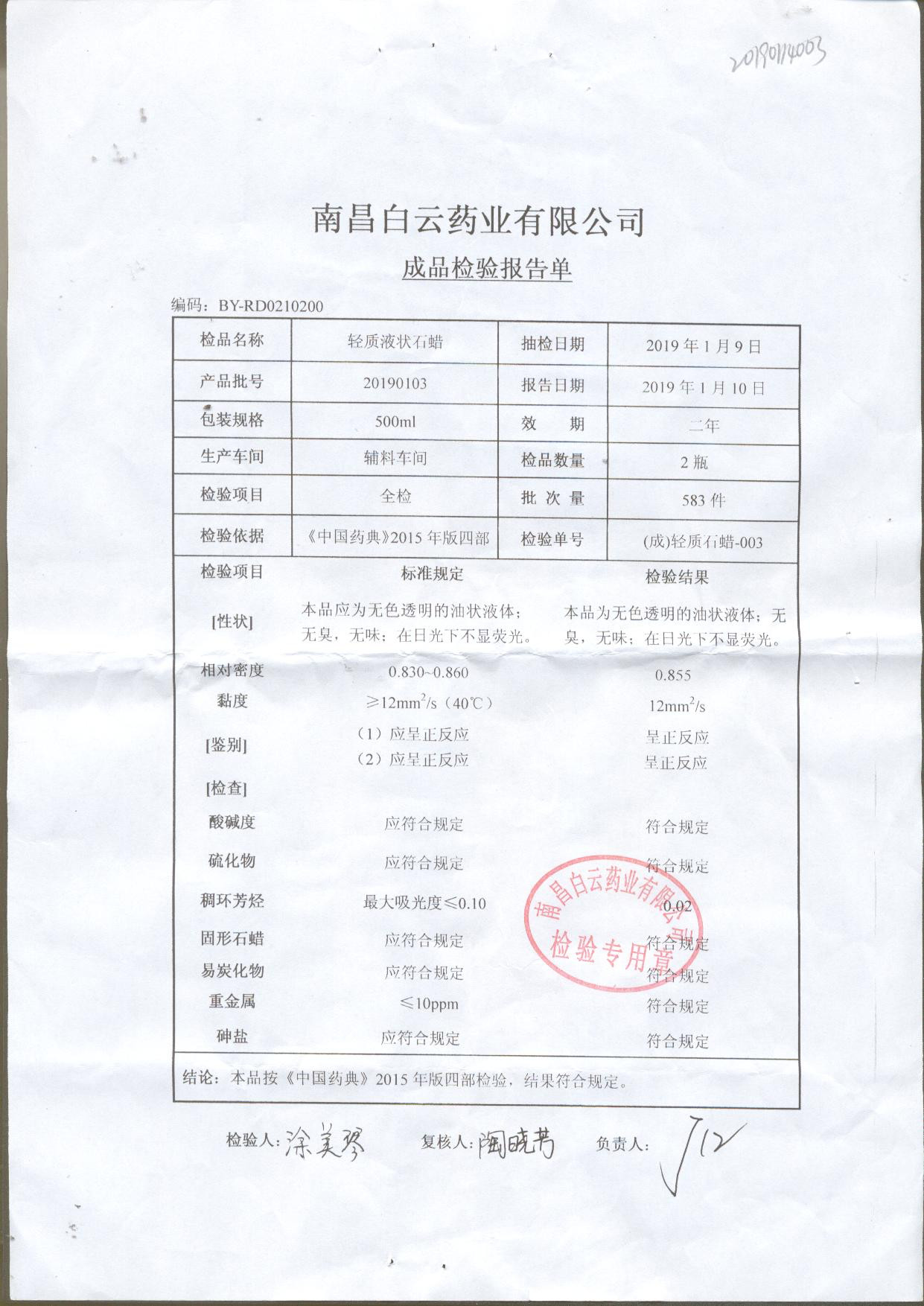轻质液状石蜡 | 500ml | 20190103 | 查看详情 |