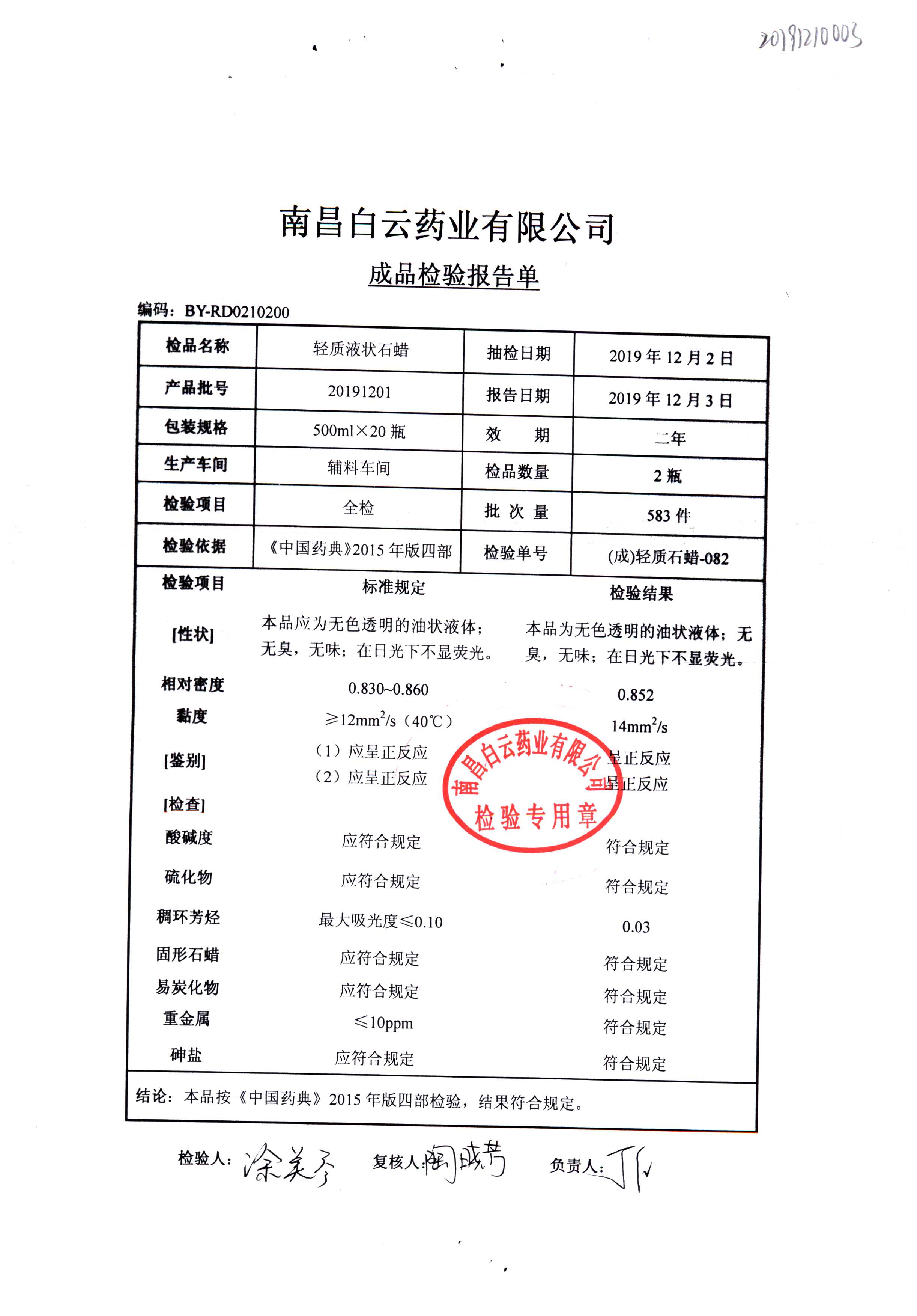 轻质液状石蜡 | 500ml | 20191201 | 查看详情 |