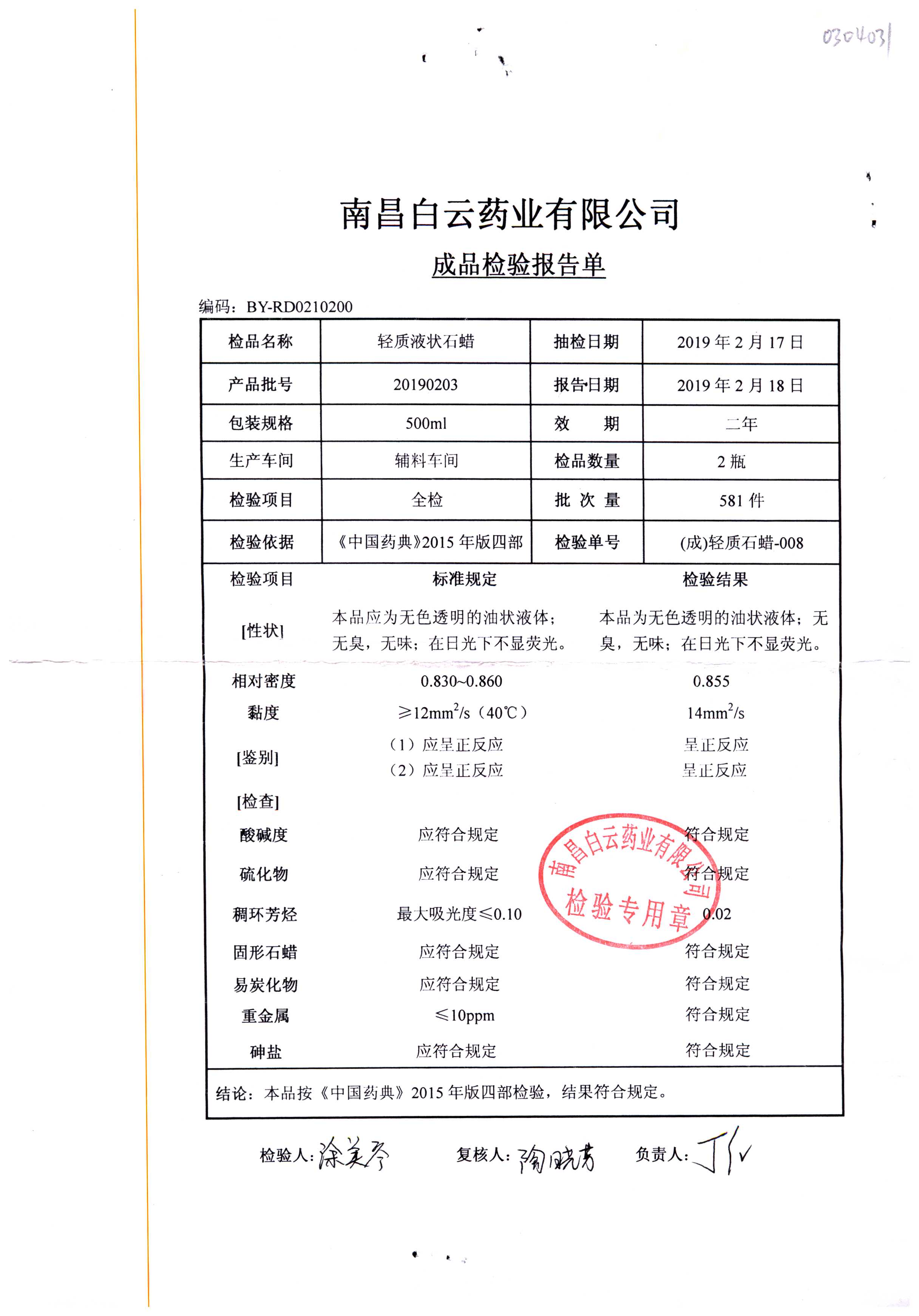 轻质液状石蜡 | 500ml | 20190203 | 查看详情 |