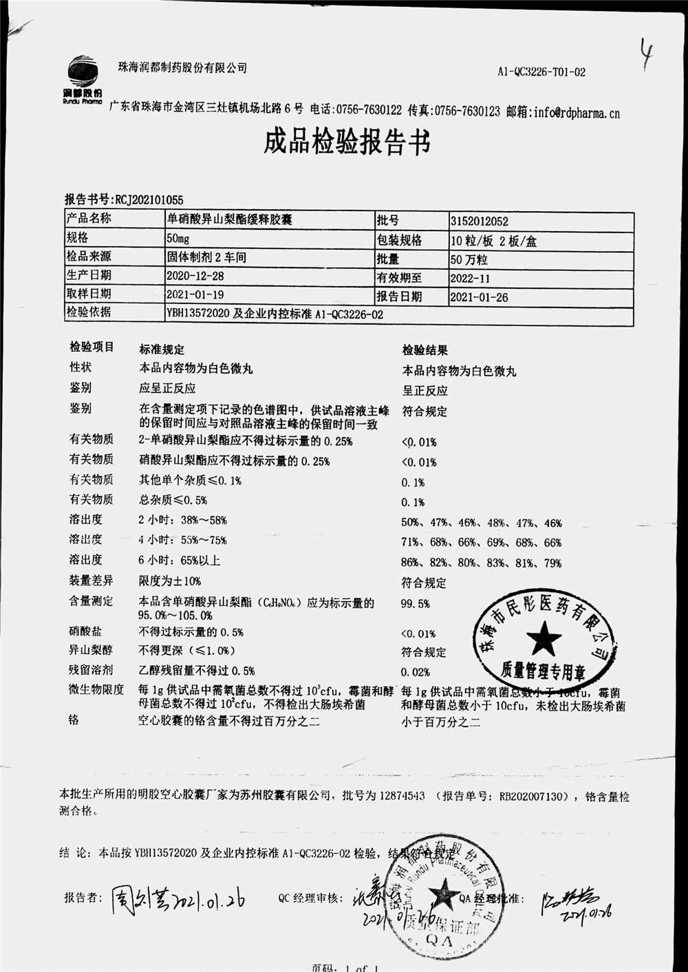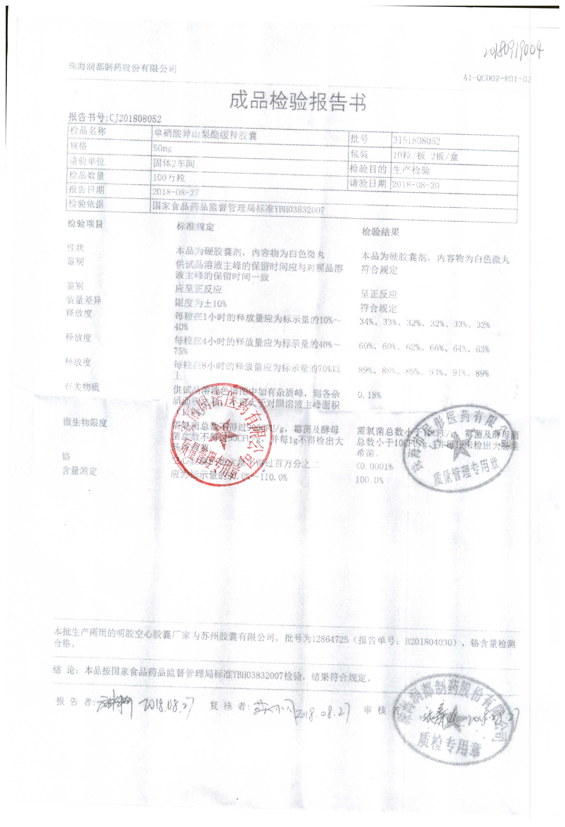 单硝酸异山梨酯缓释胶囊 | 50mg*20粒 | 3152012052 | 查看详情 |