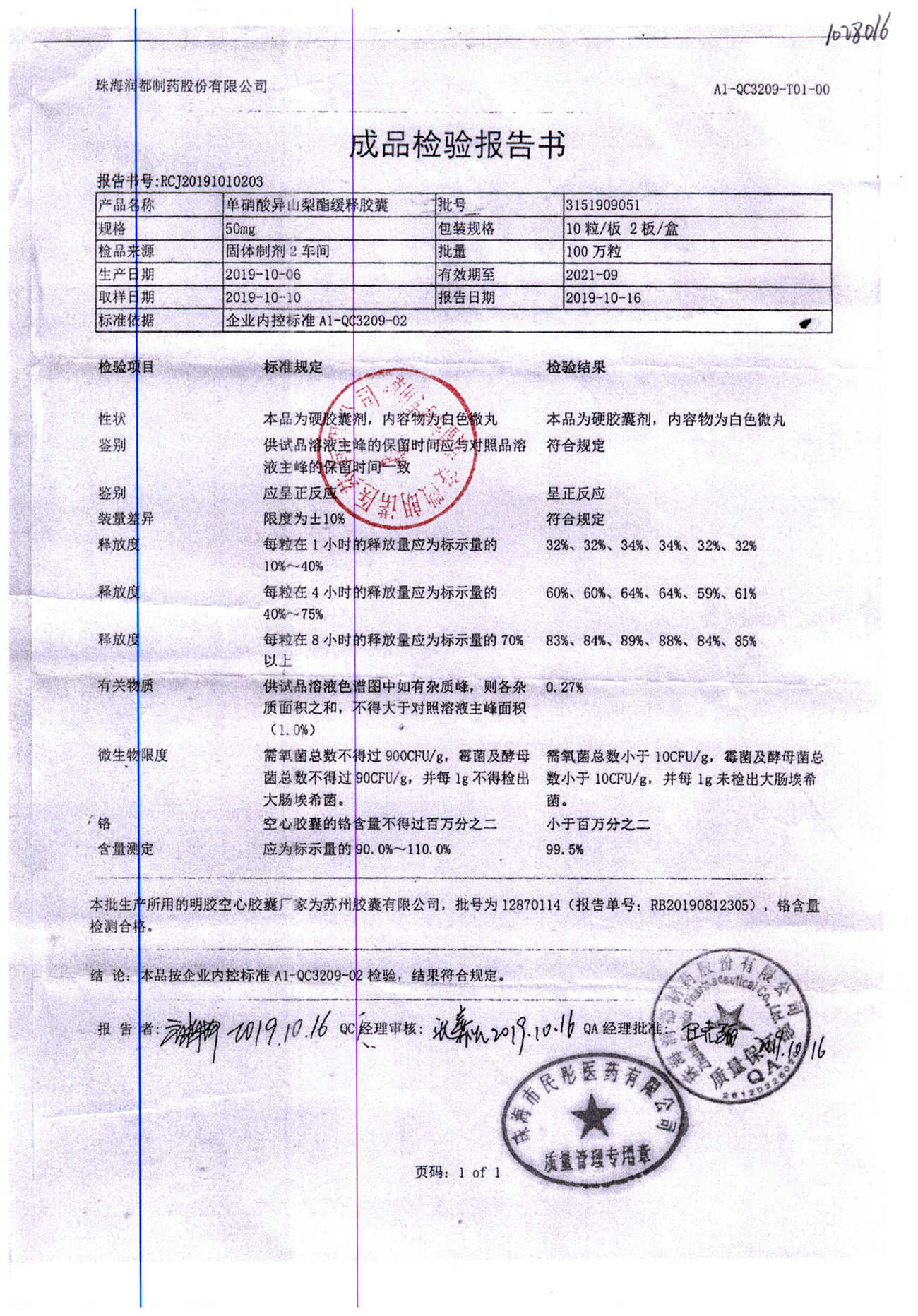 单硝酸异山梨酯缓释胶囊 | 50mg*20粒 | 3151909051 | 查看详情 |