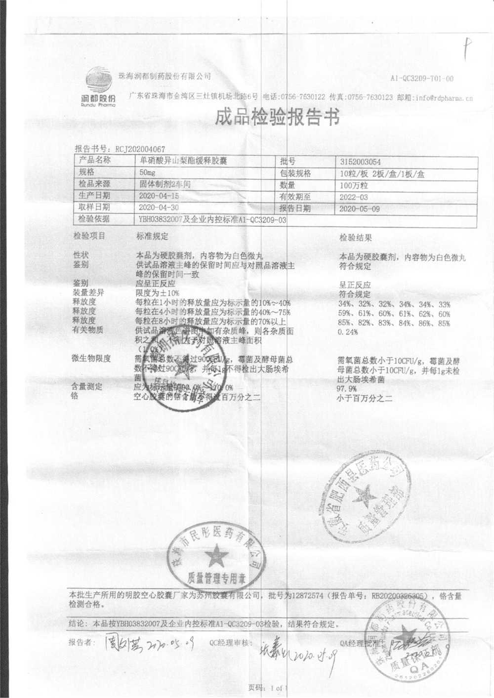 单硝酸异山梨酯缓释胶囊 | 50mg*20粒 | 3151808052 | 查看详情 |