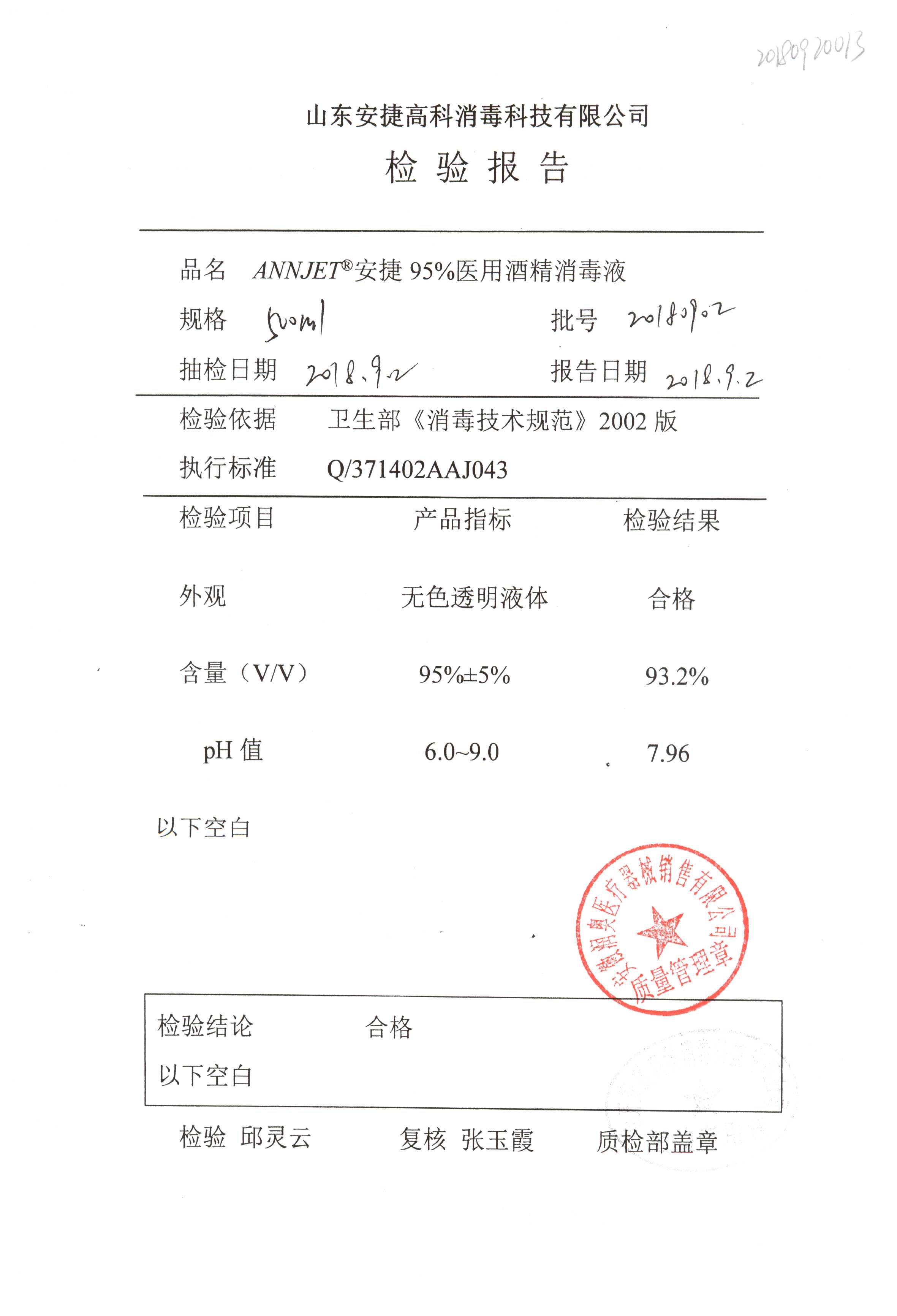 安捷95%医用酒精消毒液 | 500ml | 20180902 | 查看详情 |