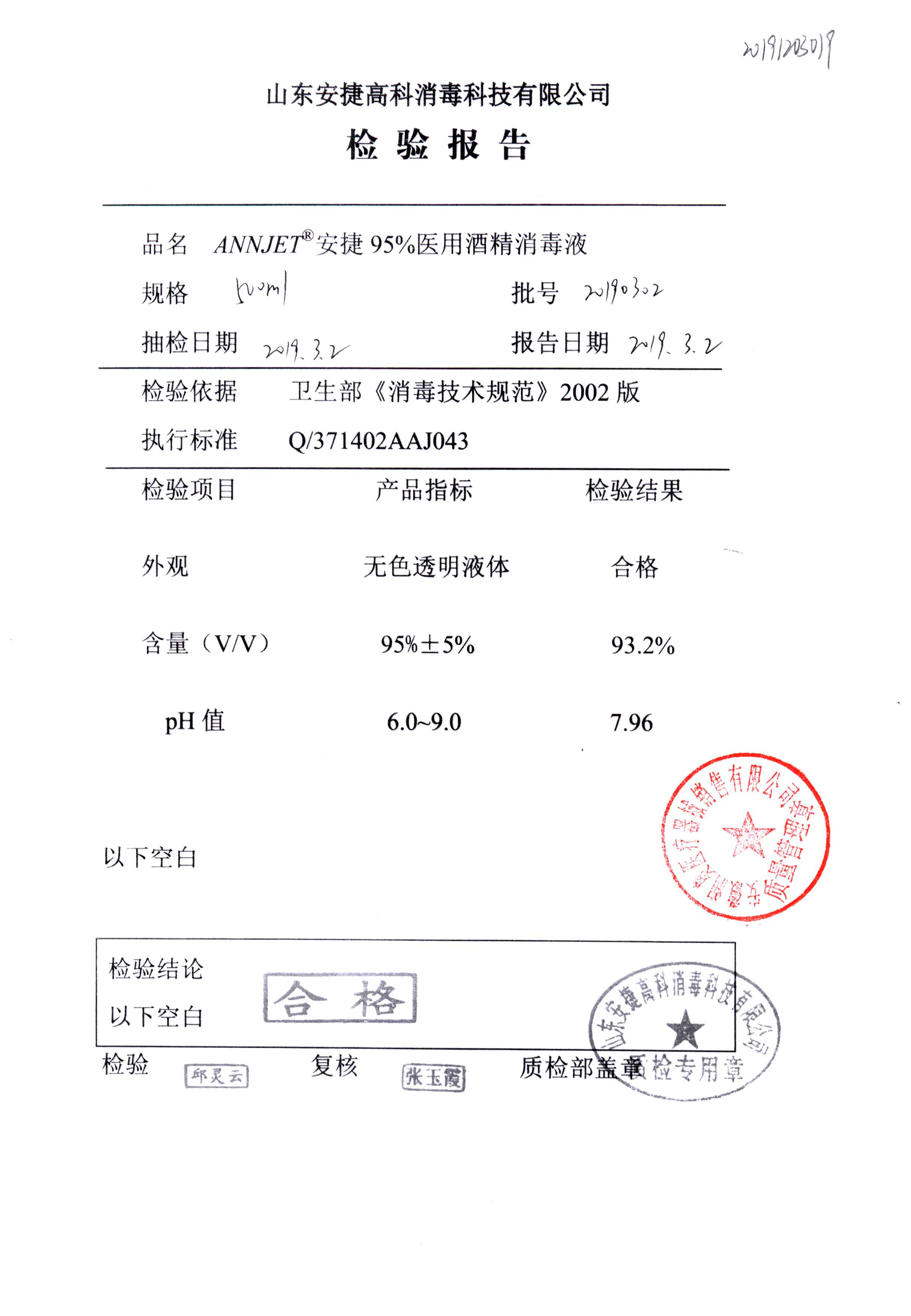 安捷95%医用酒精消毒液 | 500ml | 20190302 | 查看详情 |
