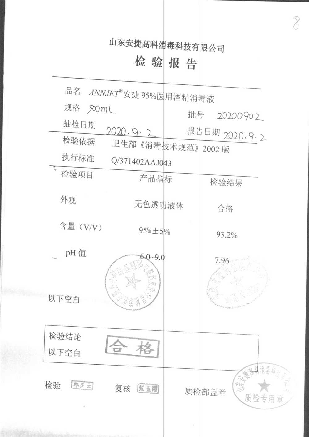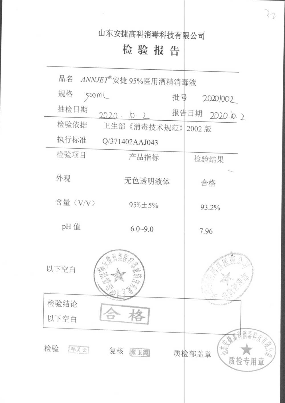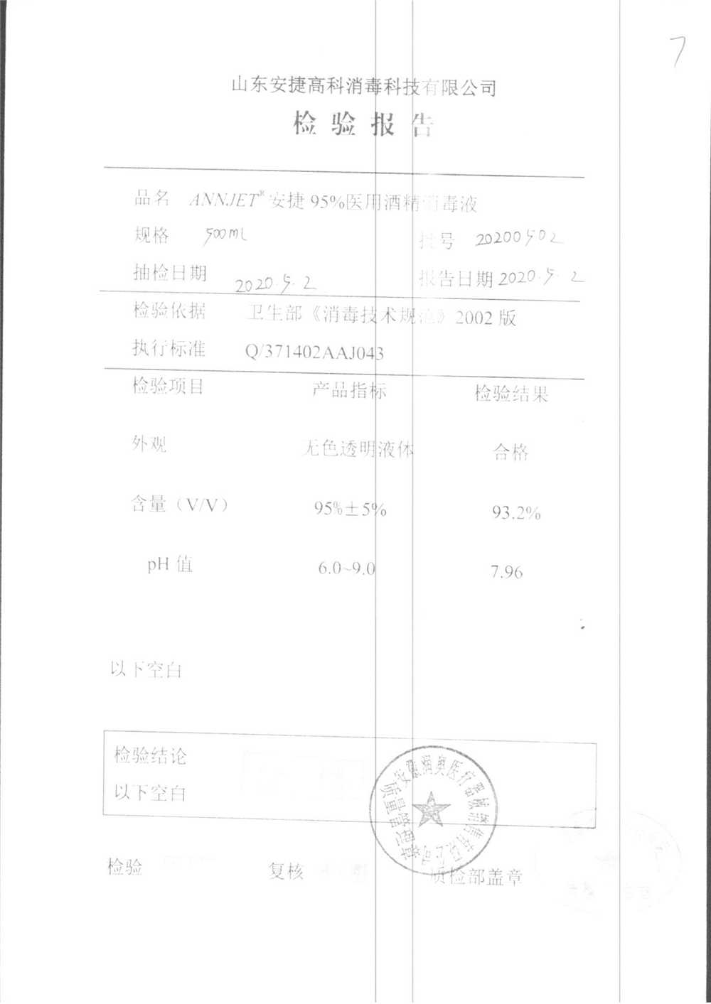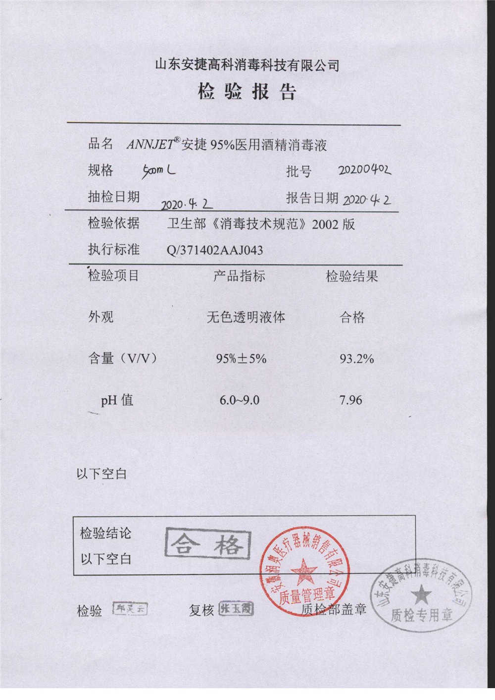 安捷95%医用酒精消毒液 | 500ml | 20200902 | 查看详情 |