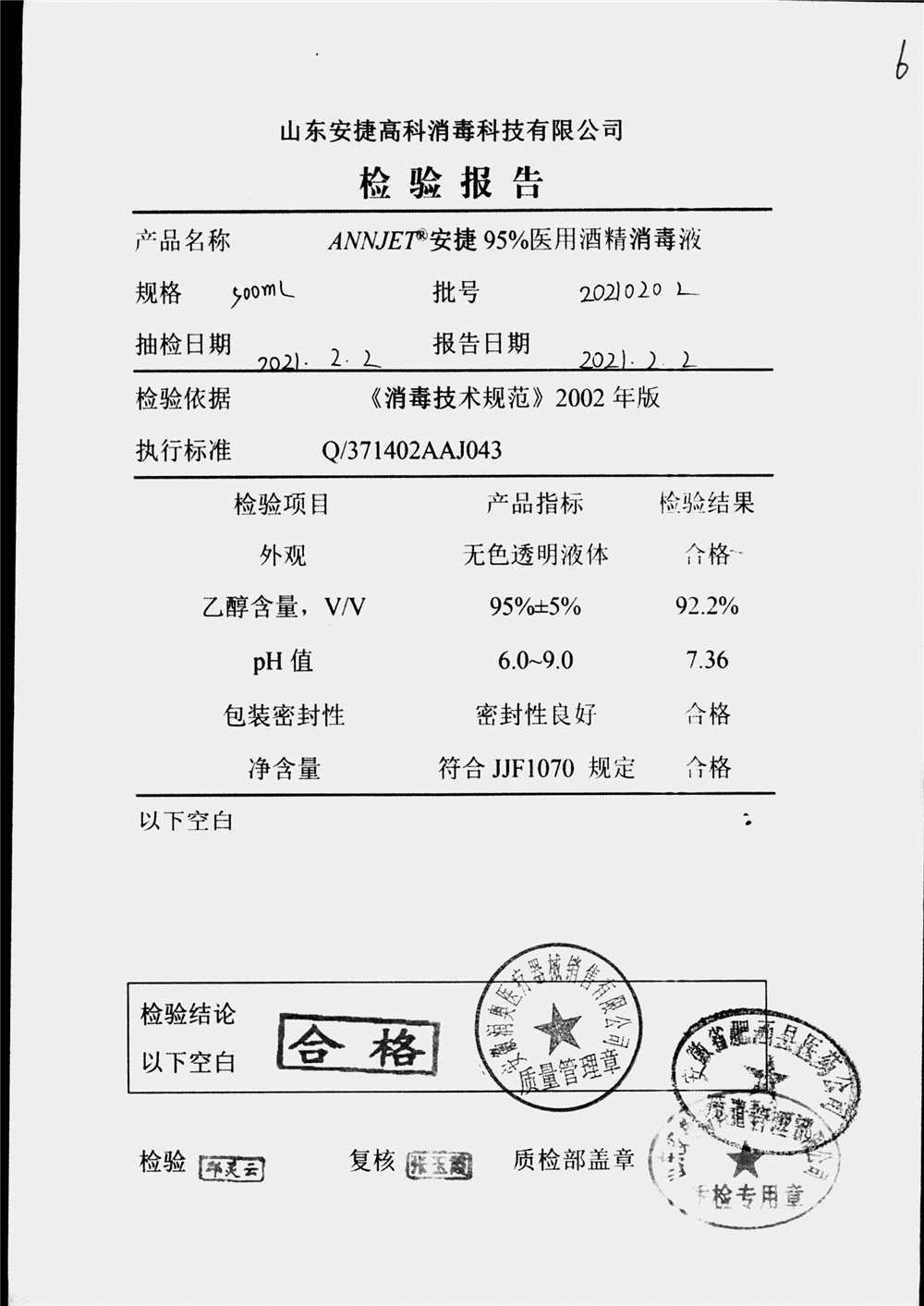 安捷95%医用酒精消毒液 | 500ml | 20210202 | 查看详情 |