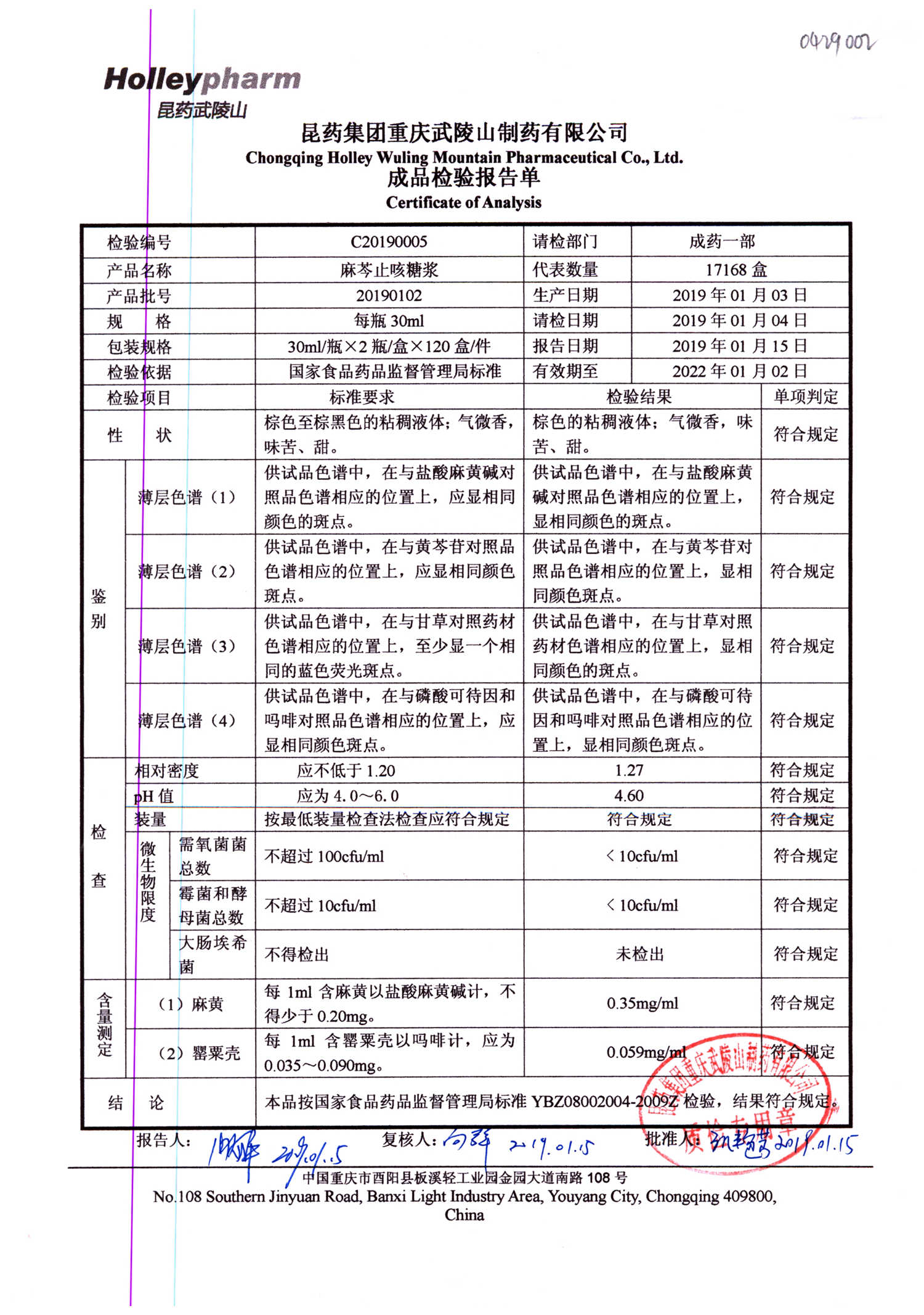 麻芩止咳糖浆 | 30ml | 20190102 | 查看详情 |