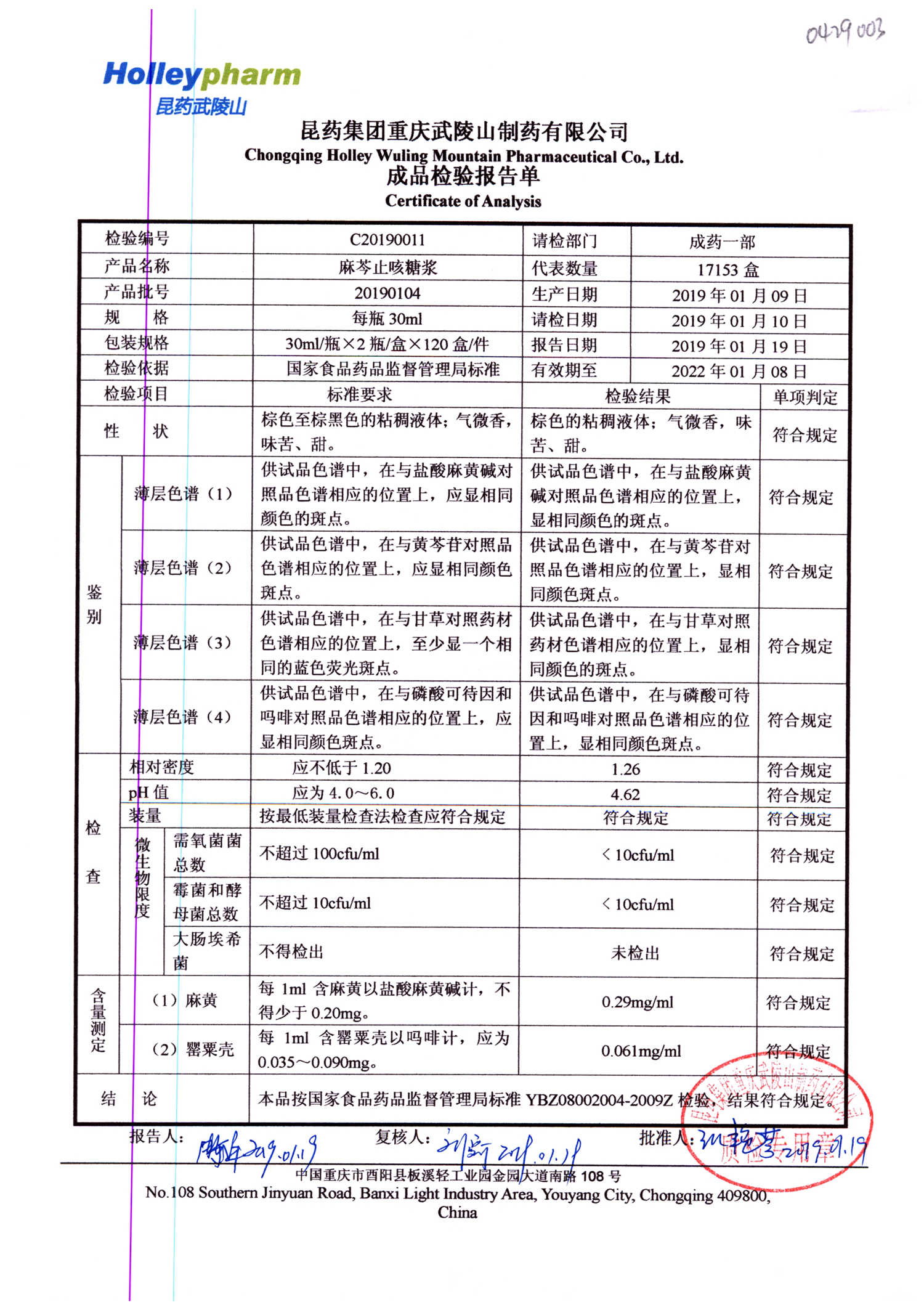 麻芩止咳糖浆 | 30ml | 20190104 | 查看详情 |